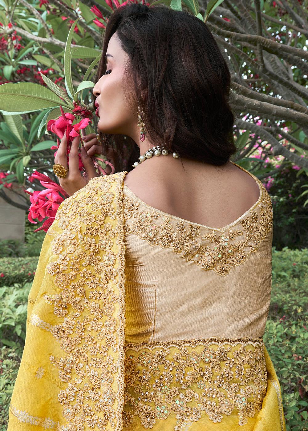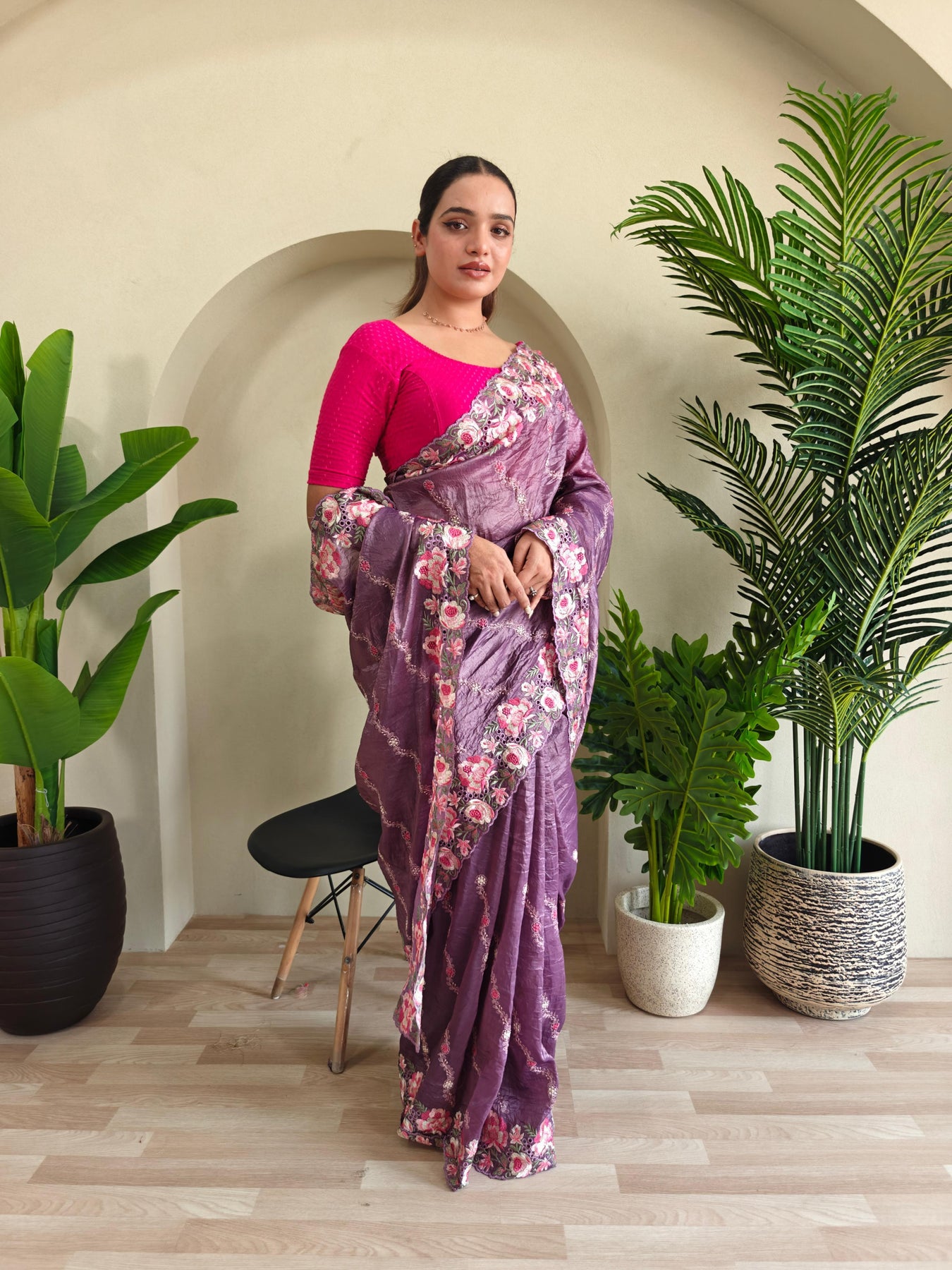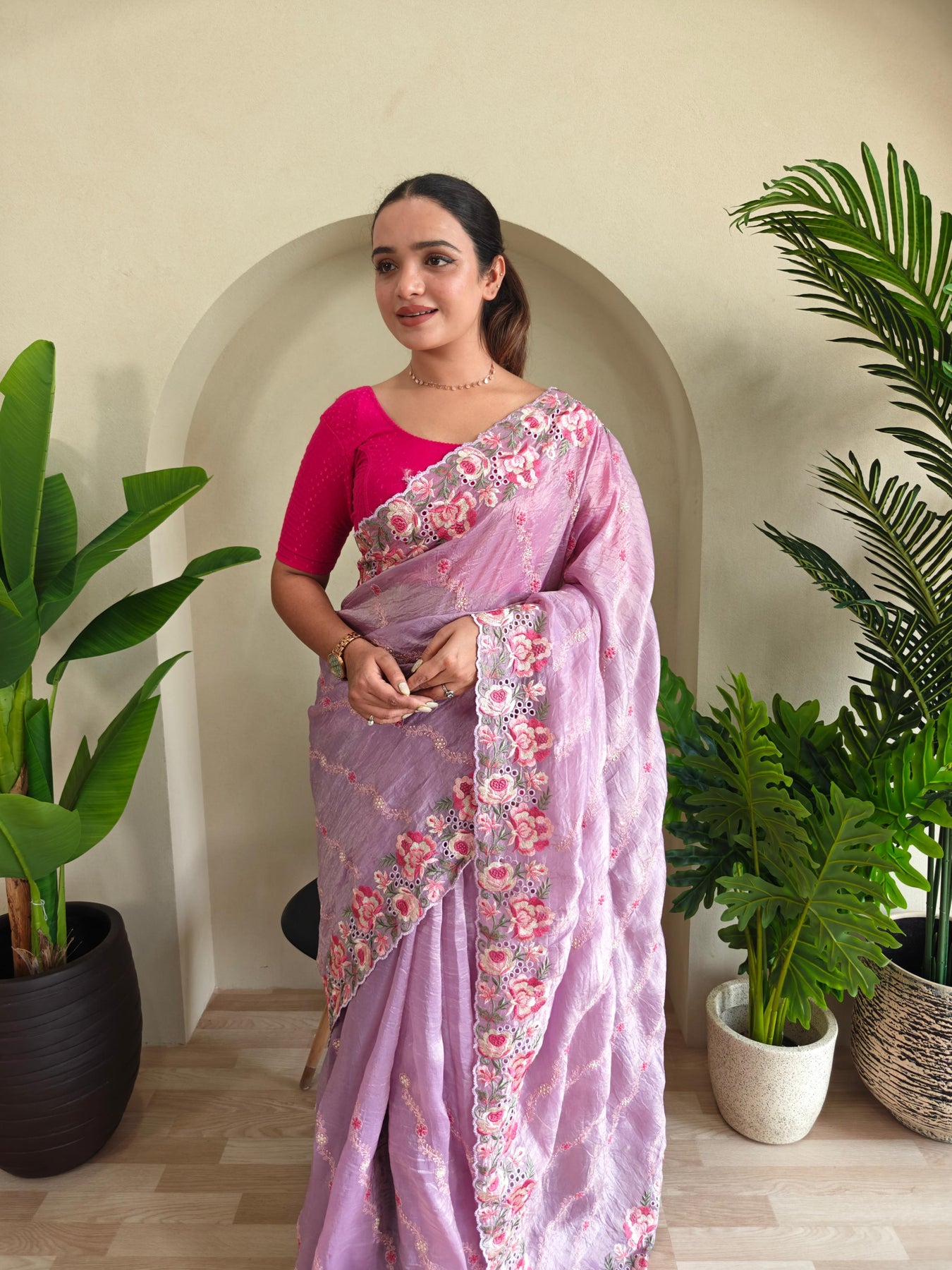This exquisite saree is a masterpiece of Indian craftsmanship. Crafted from the finest tissue silk, it drapes gracefully and exudes an ethereal charm. The highlight of this saree is the stunning contrast border adorned with intricate zari weaving. A classic piece that will never go out of style.