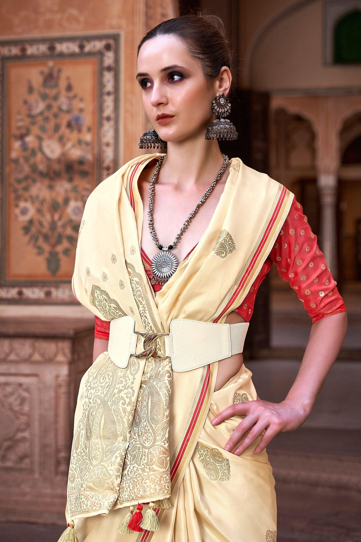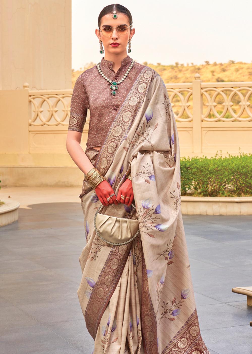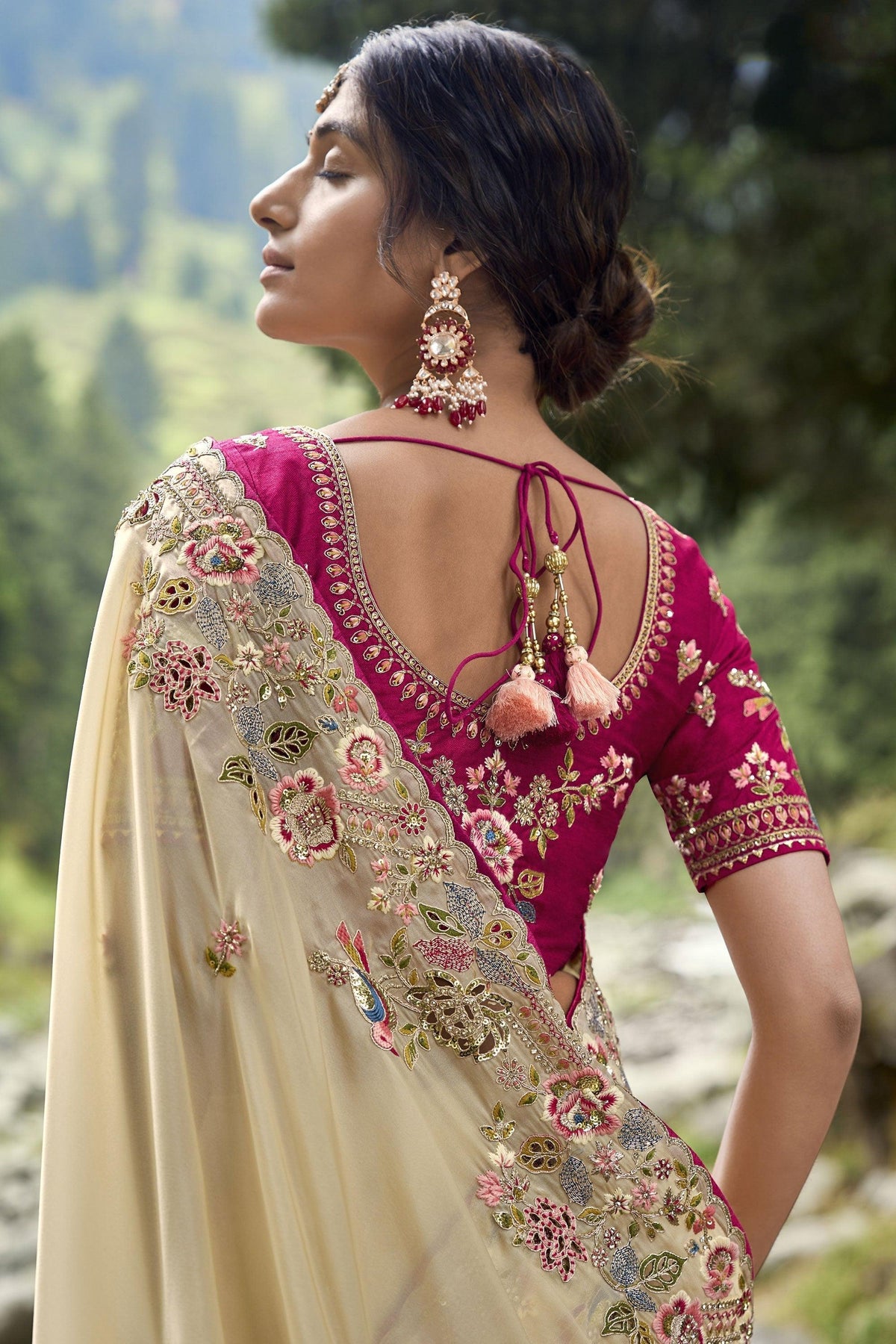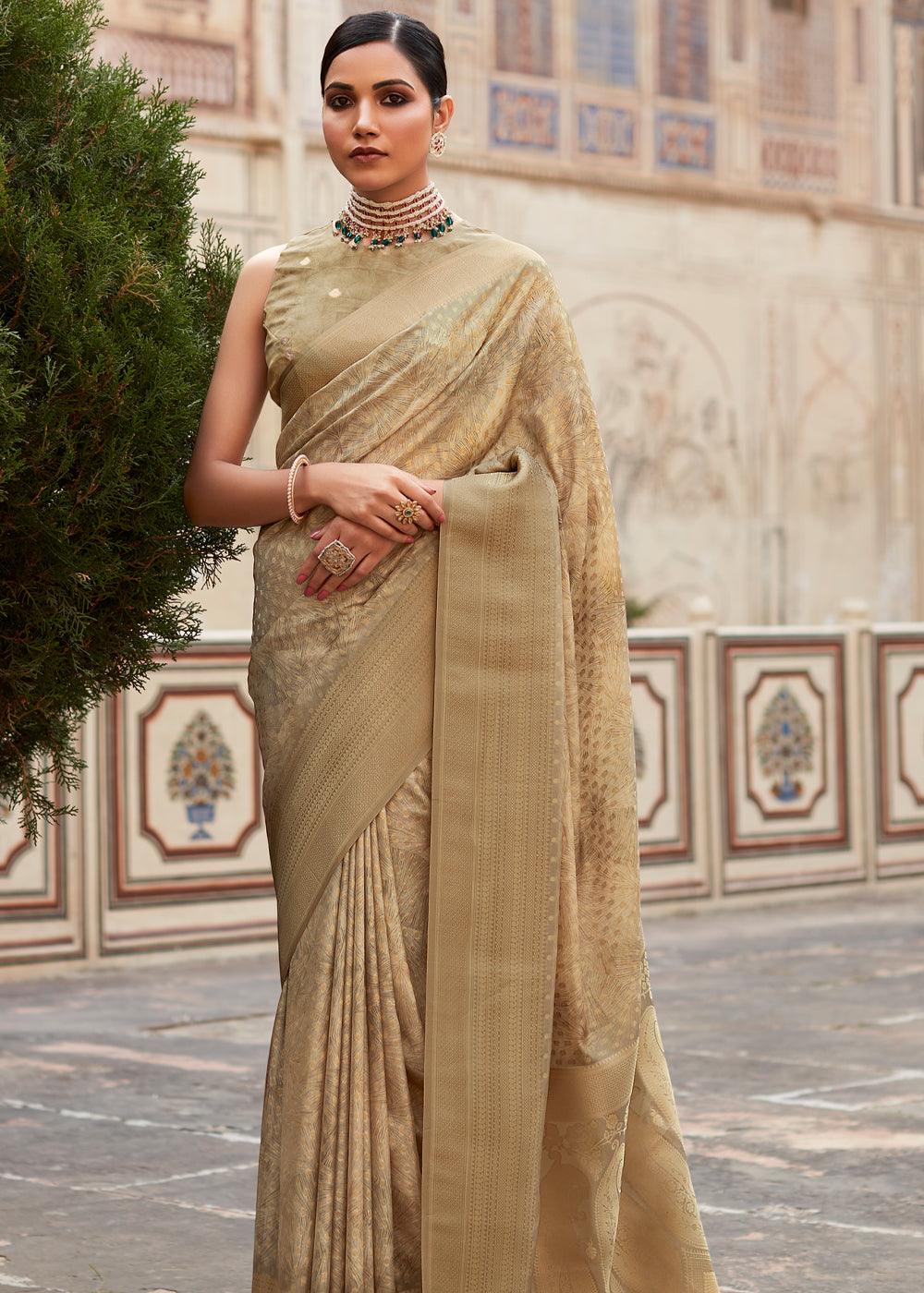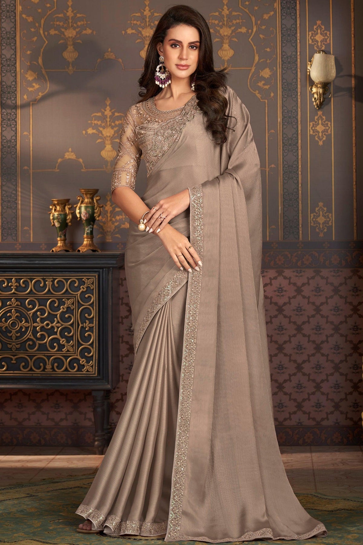 Incredible Satin Crepe Beige Color Saree With Contrast Blouse