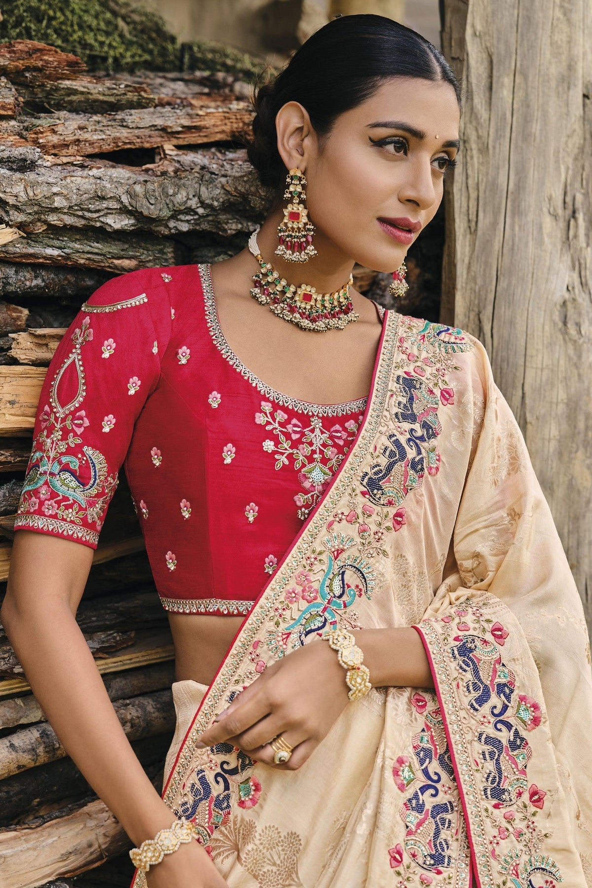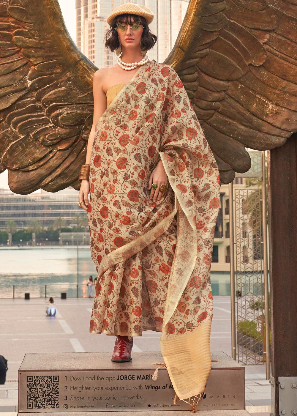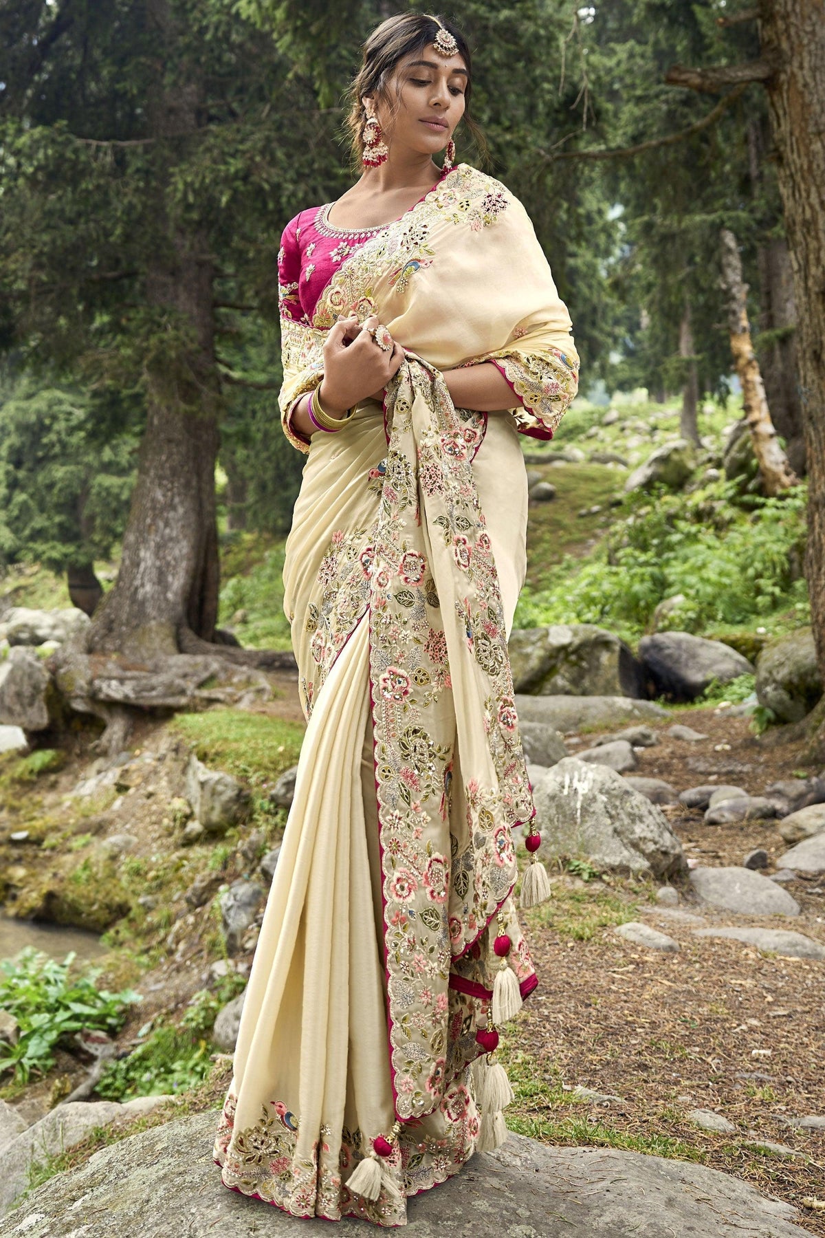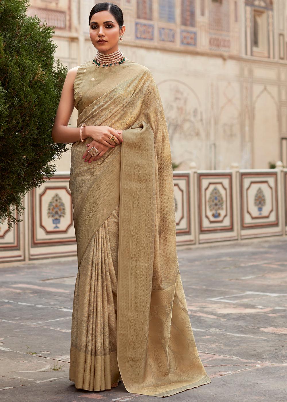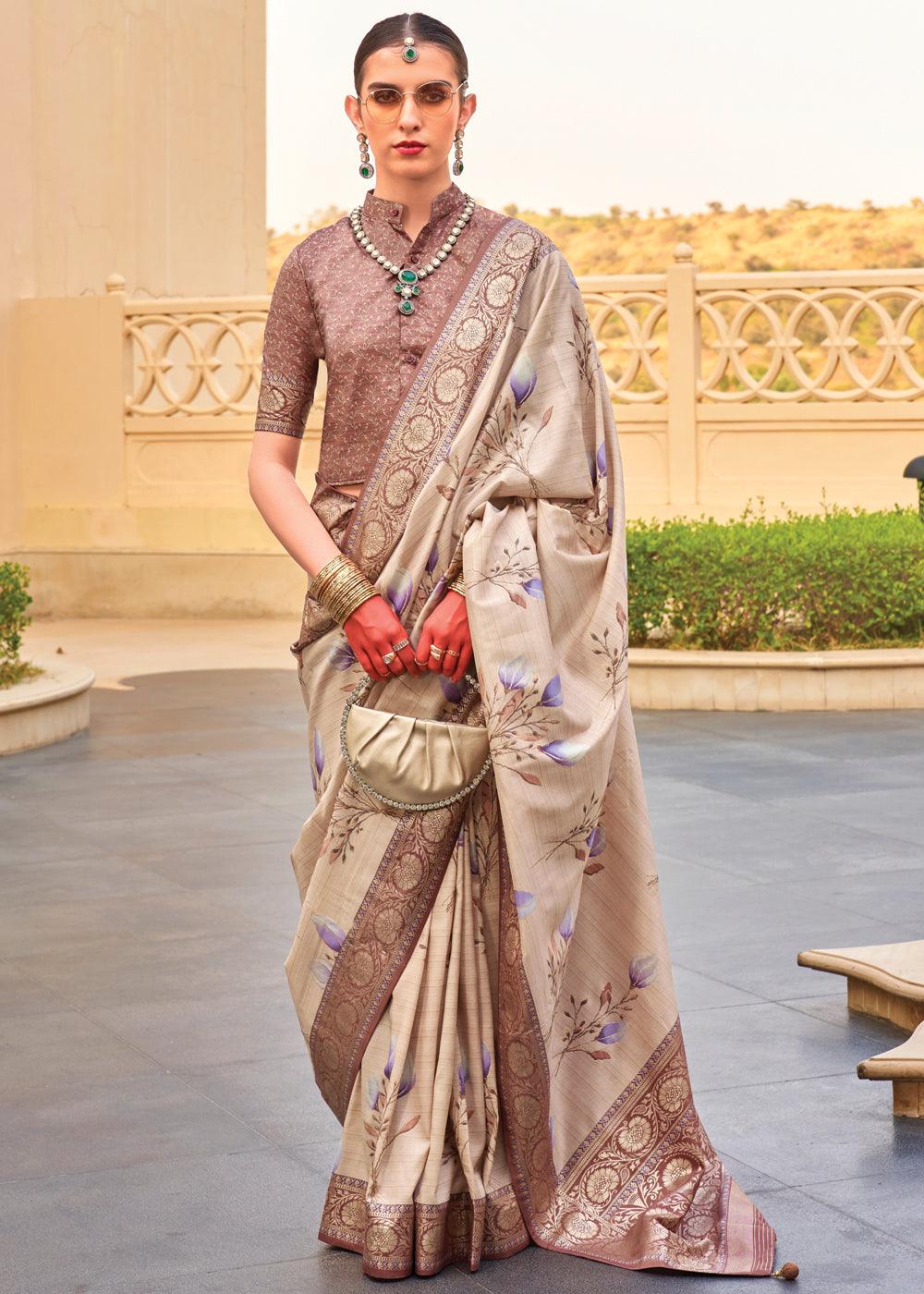 Incredible Satin Crepe Beige Color Saree With Contrast Blouse