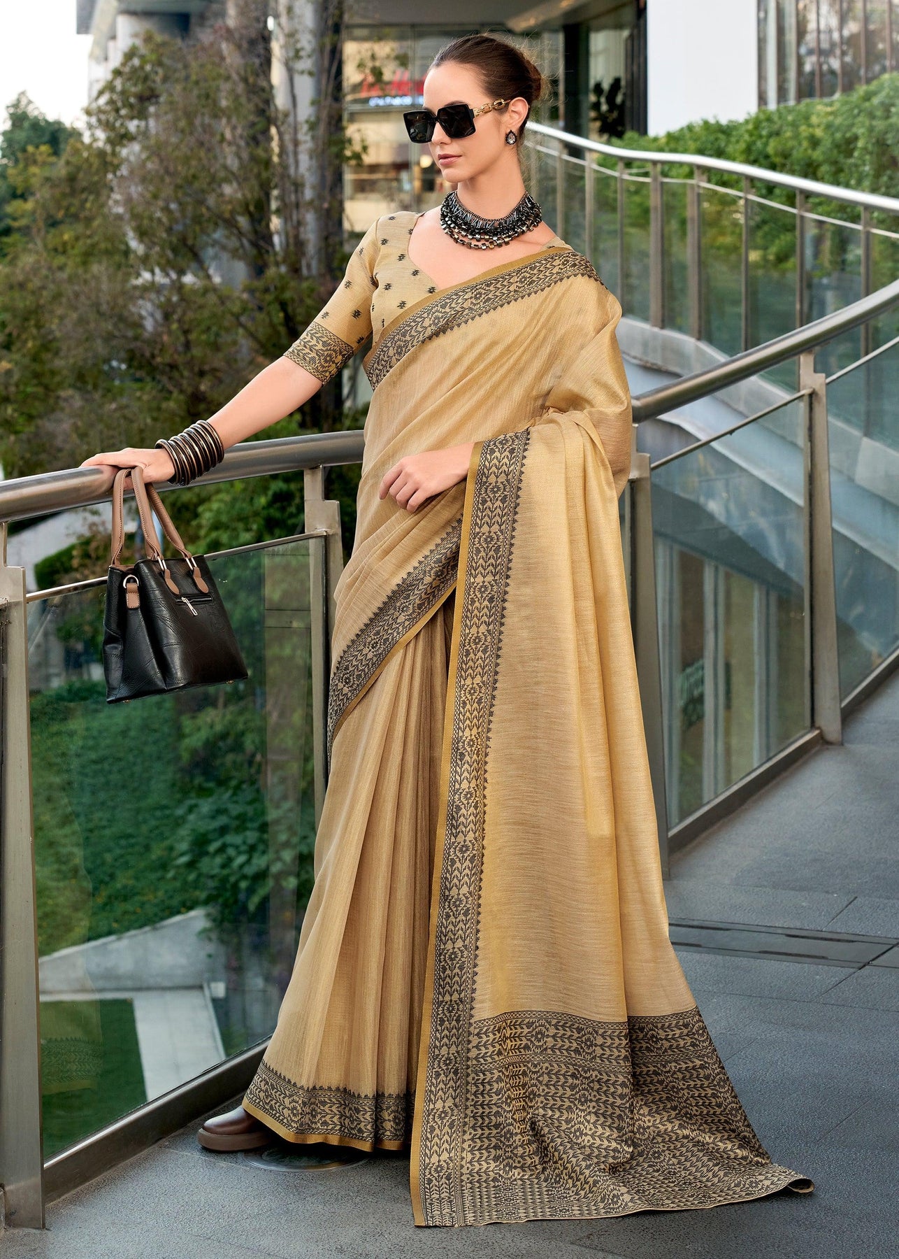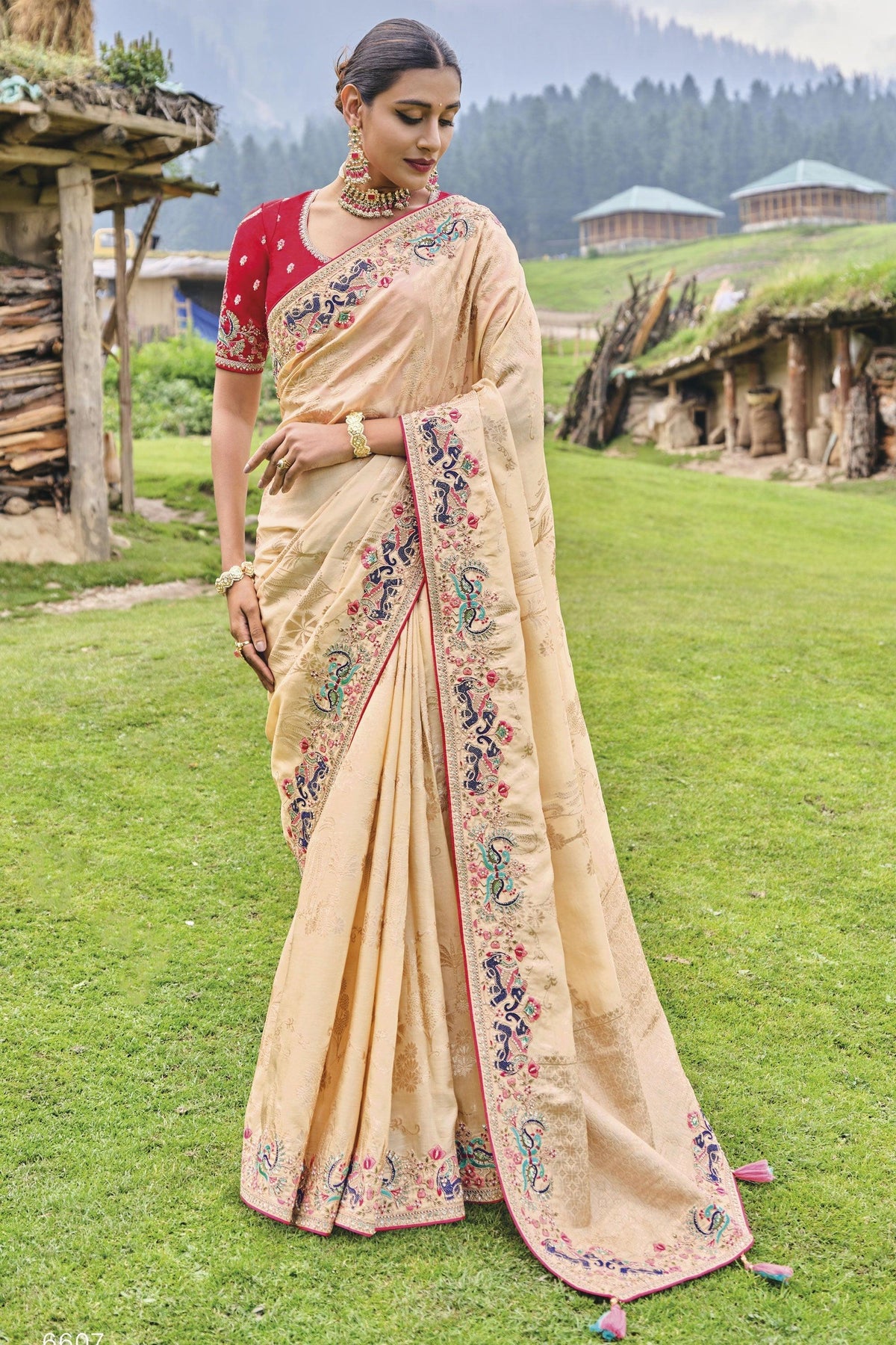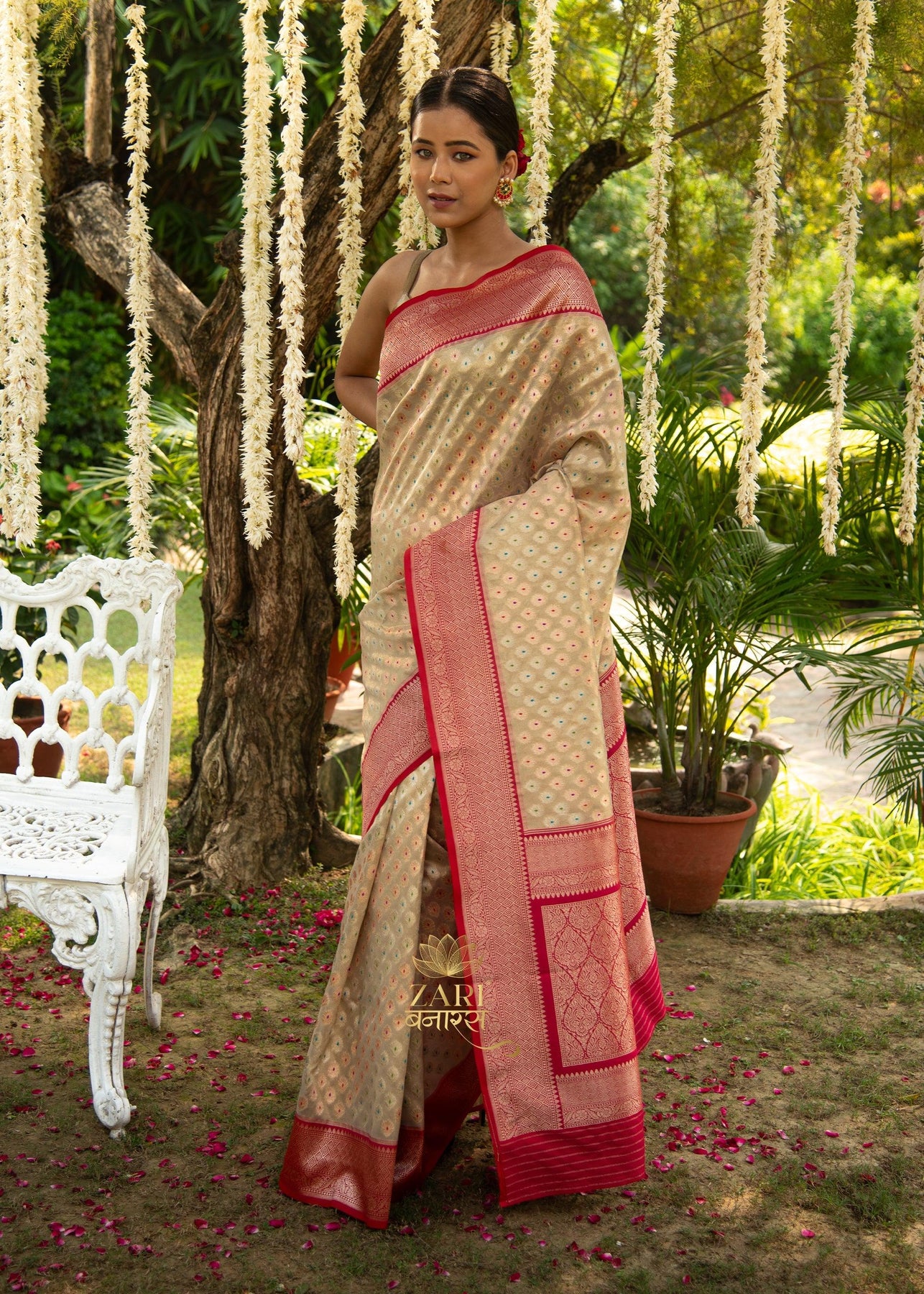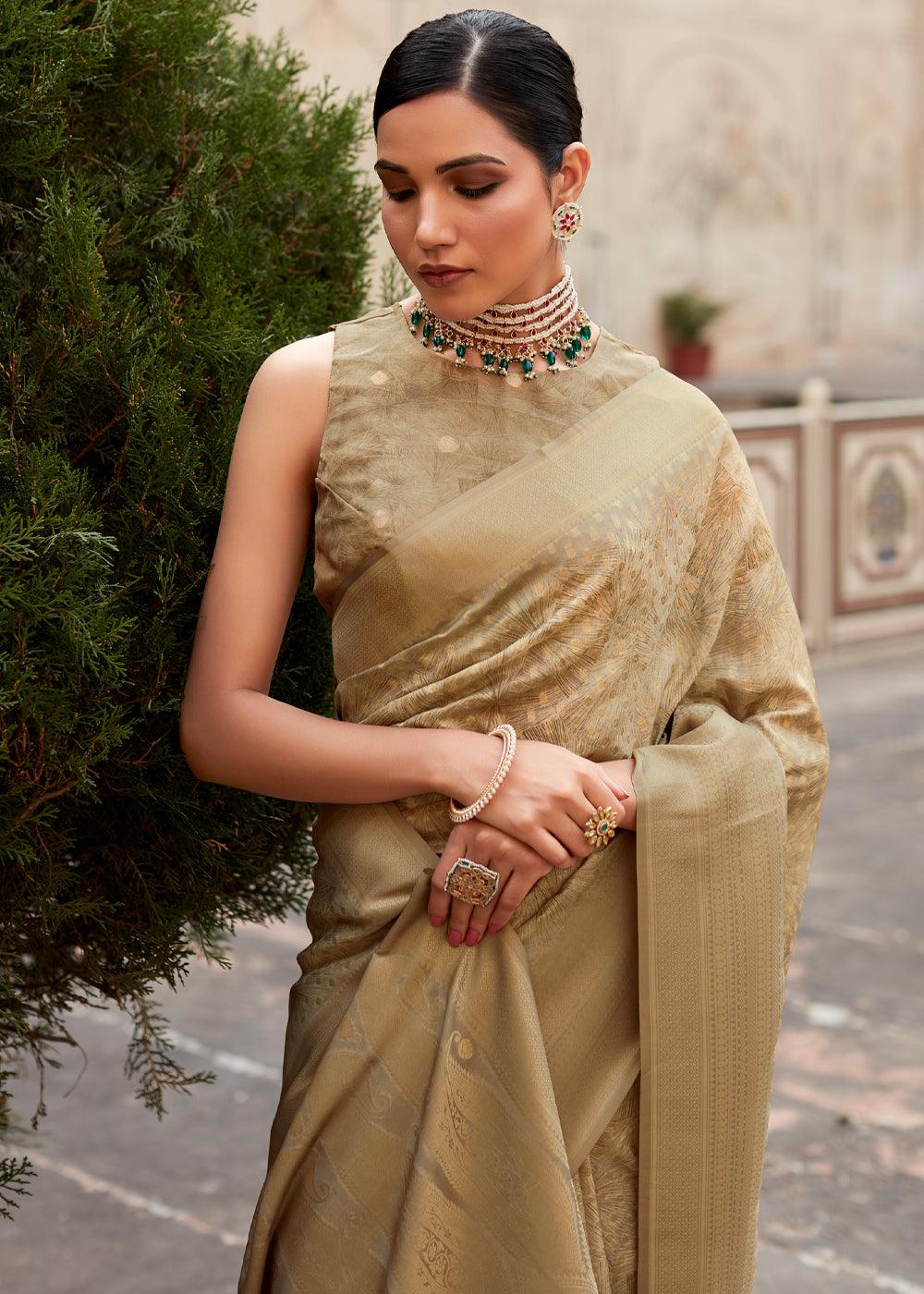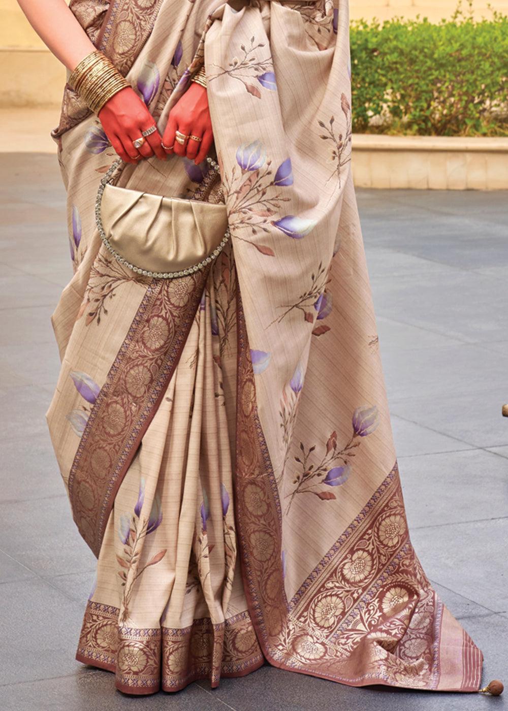 Incredible Satin Crepe Beige Color Saree With Contrast Blouse