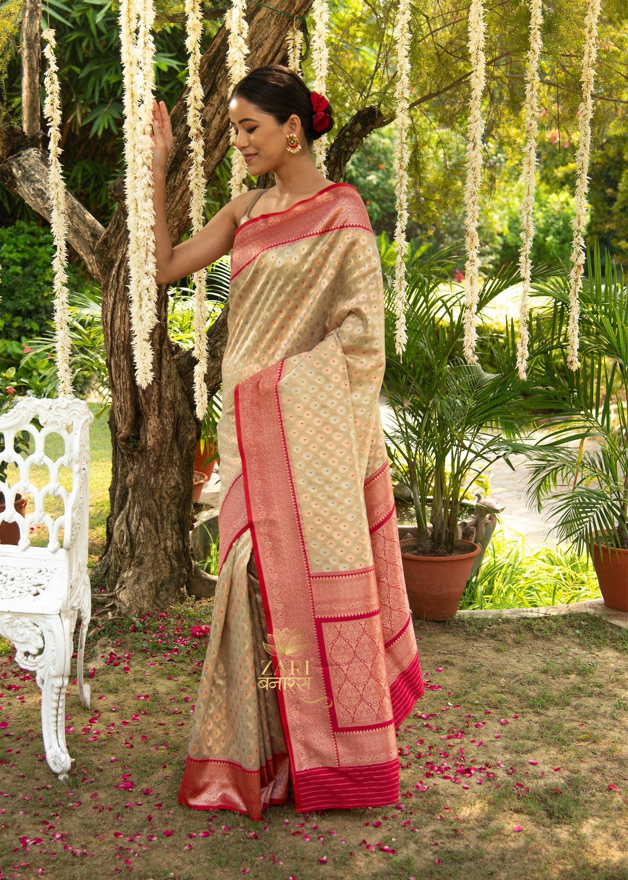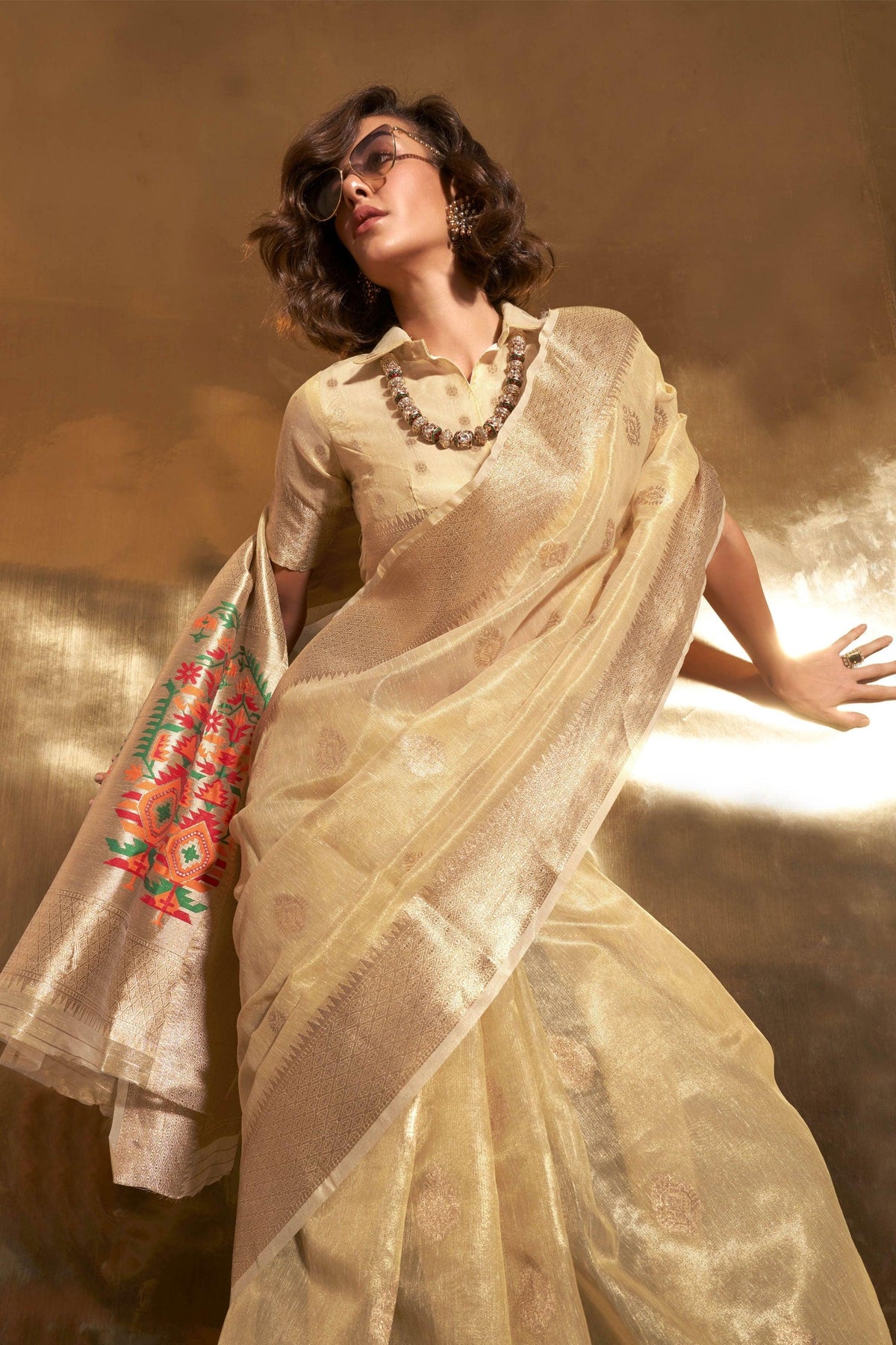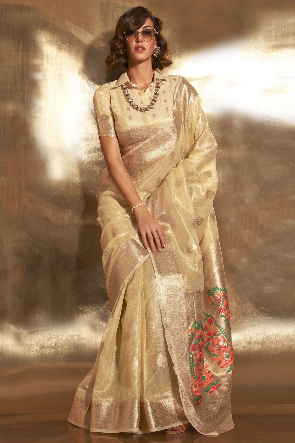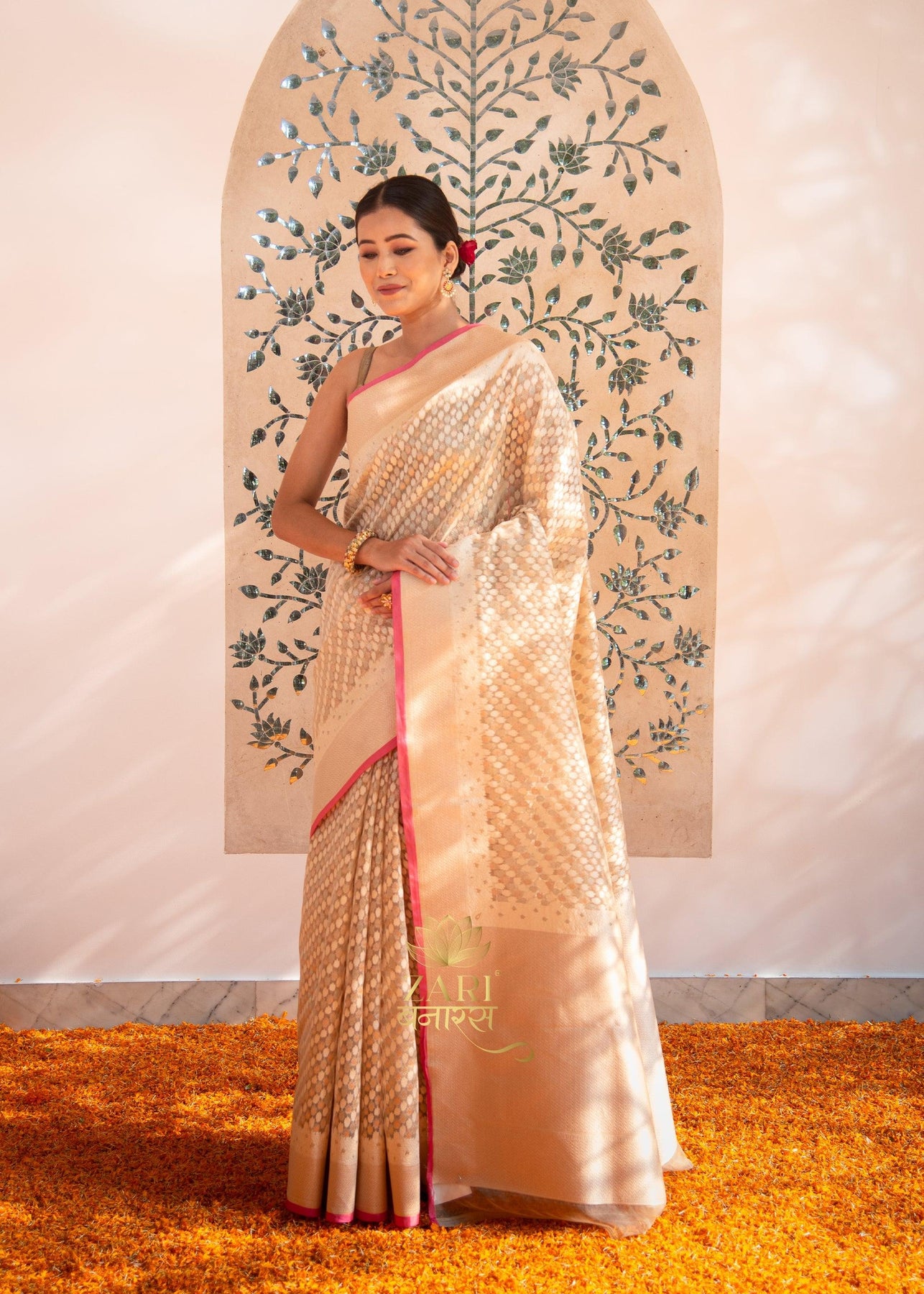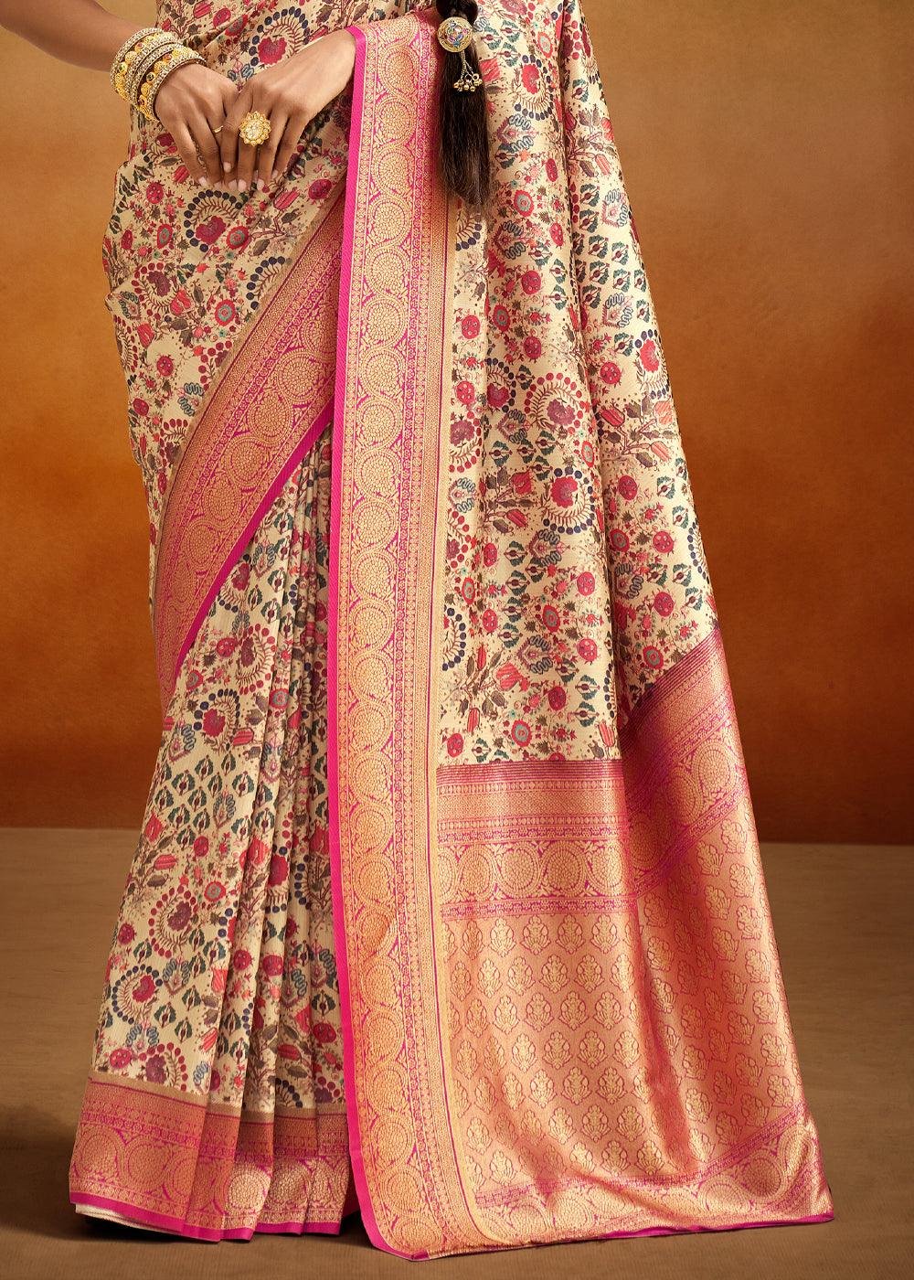 Incredible Satin Crepe Beige Color Saree With Contrast Blouse