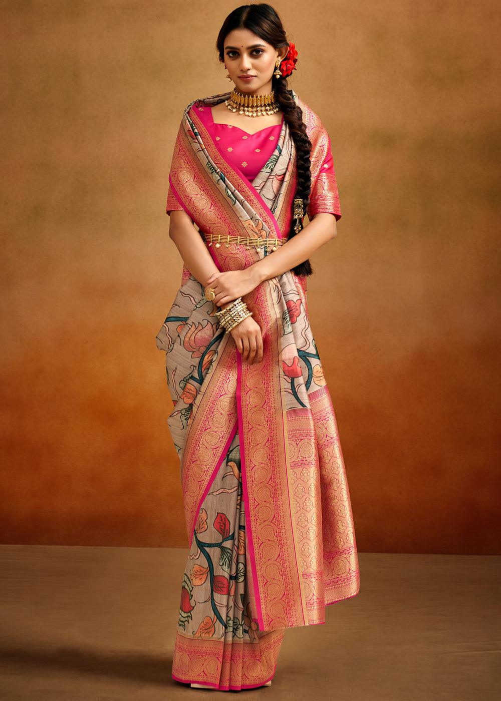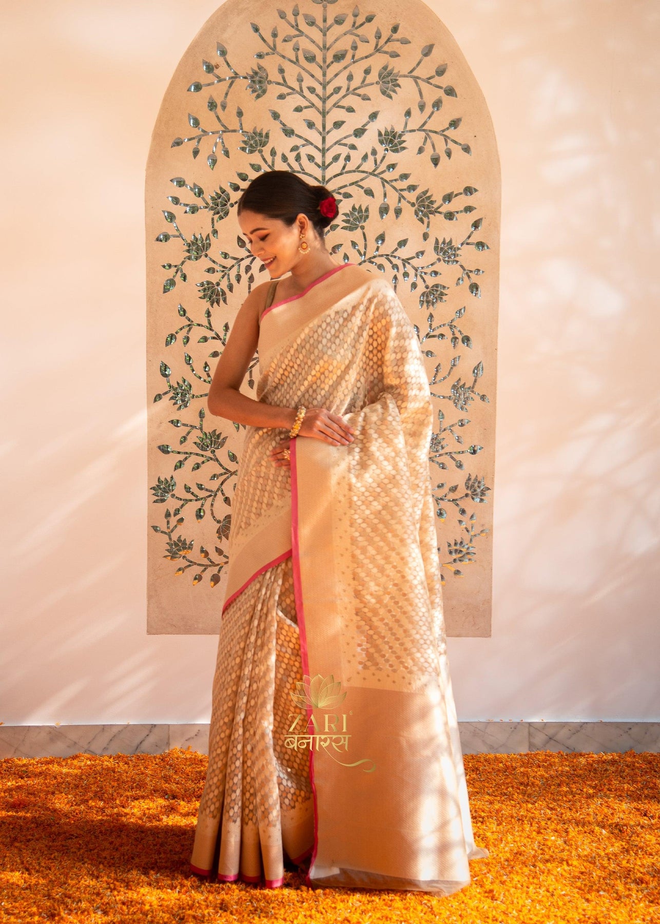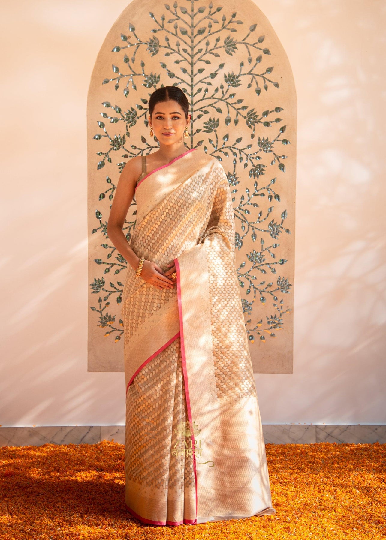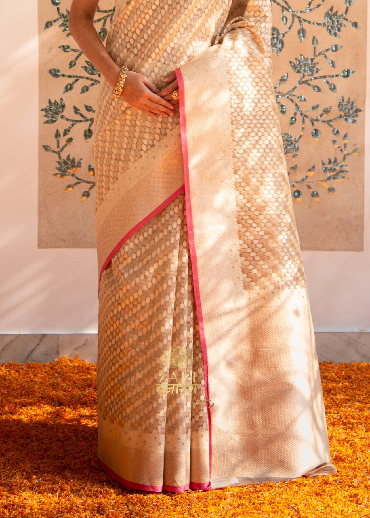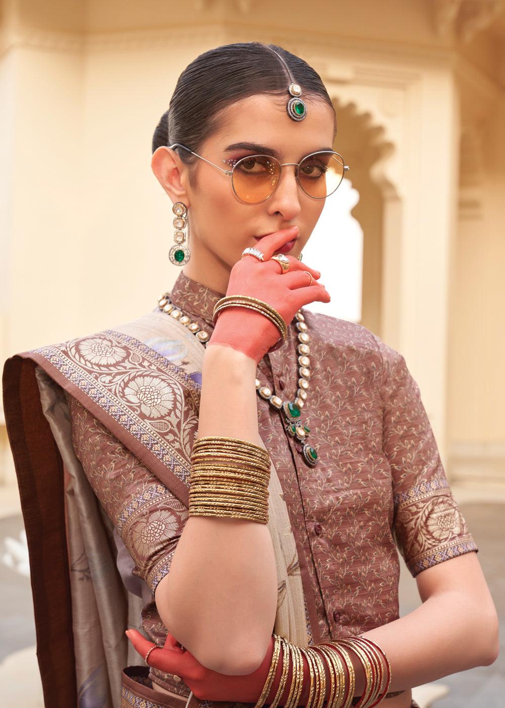 Incredible Satin Crepe Beige Color Saree With Contrast Blouse