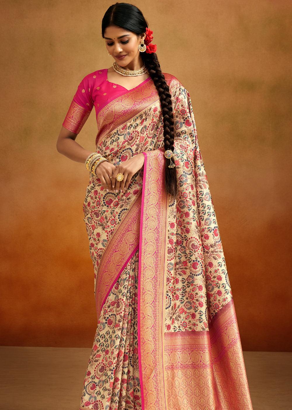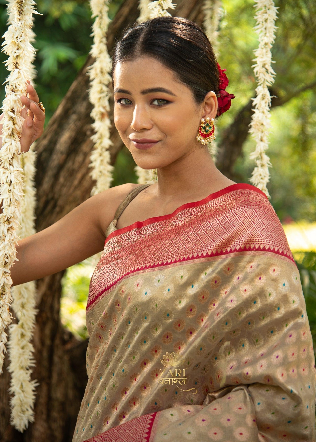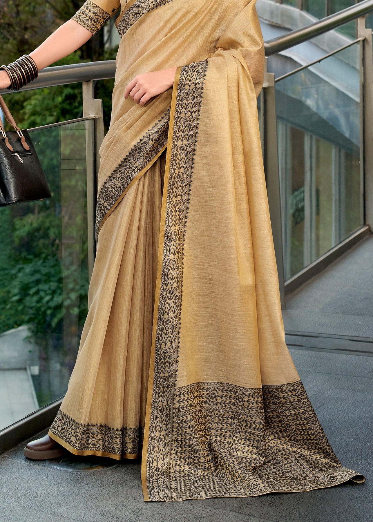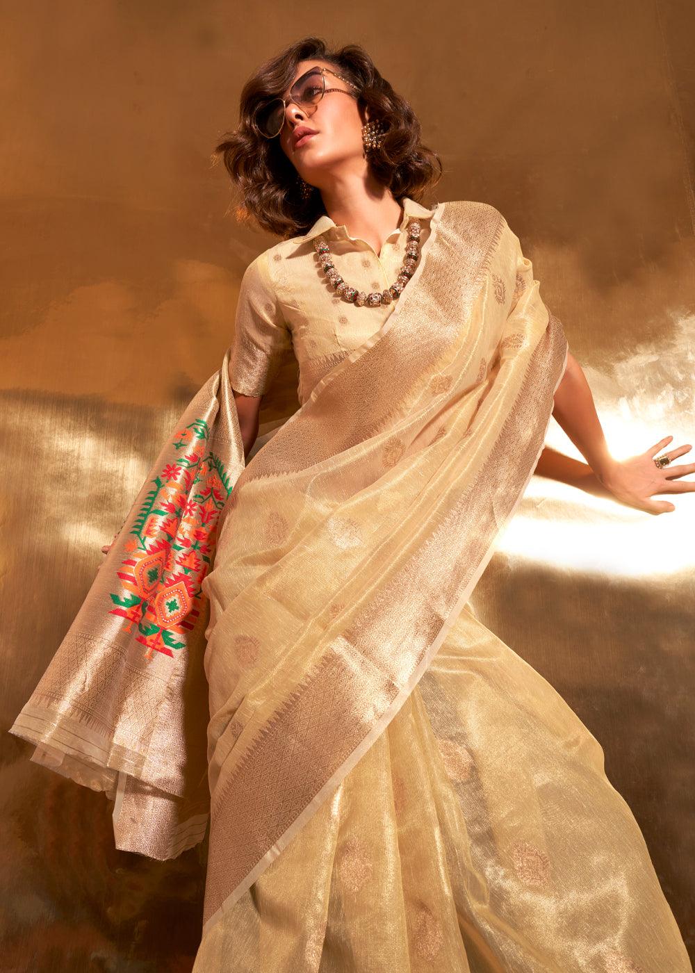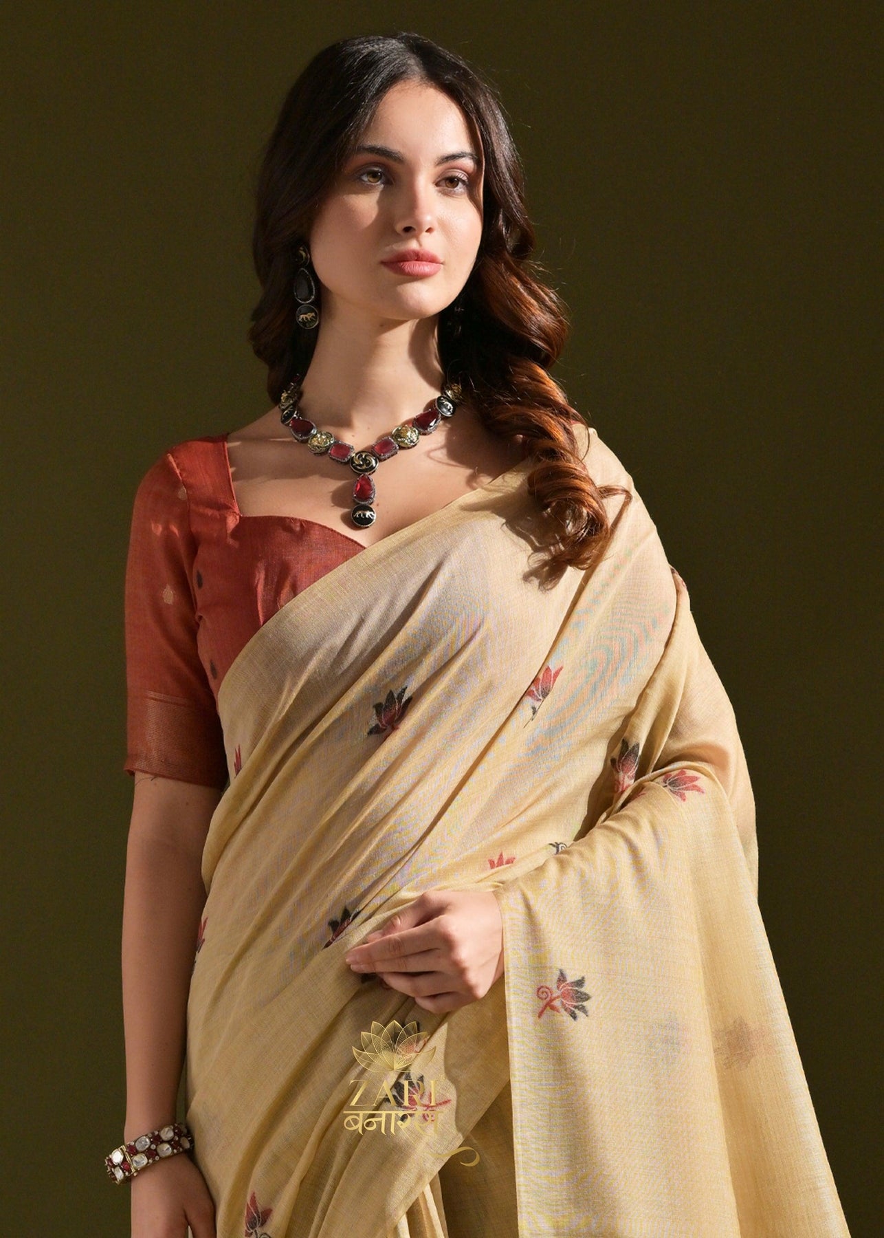 Incredible Satin Crepe Beige Color Saree With Contrast Blouse