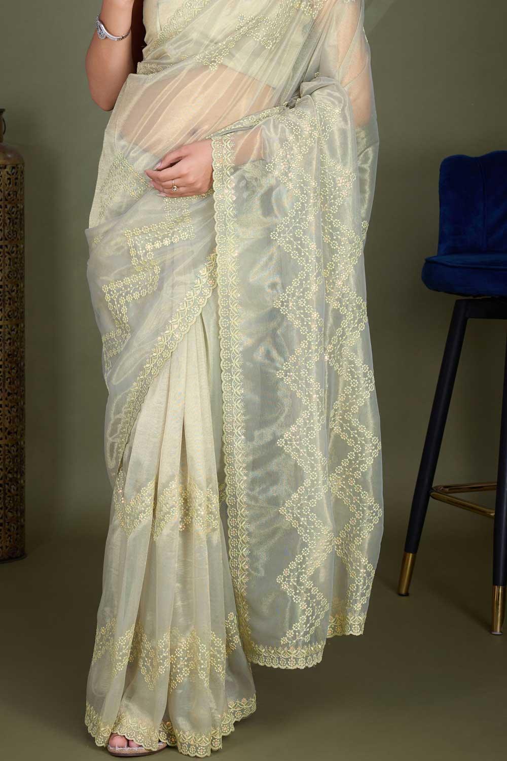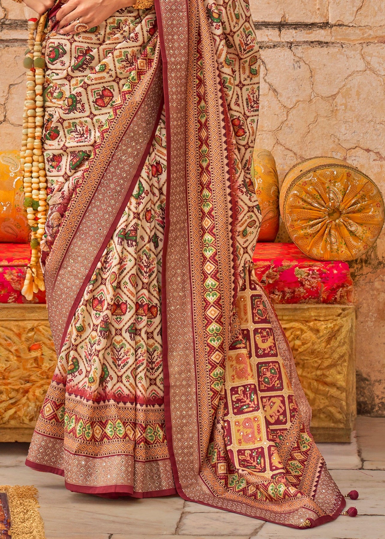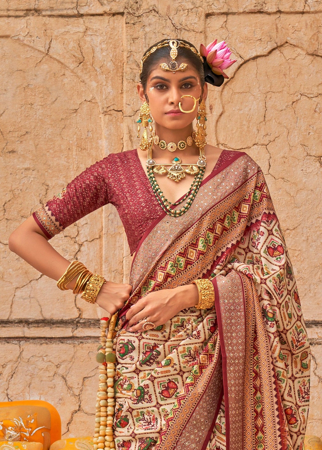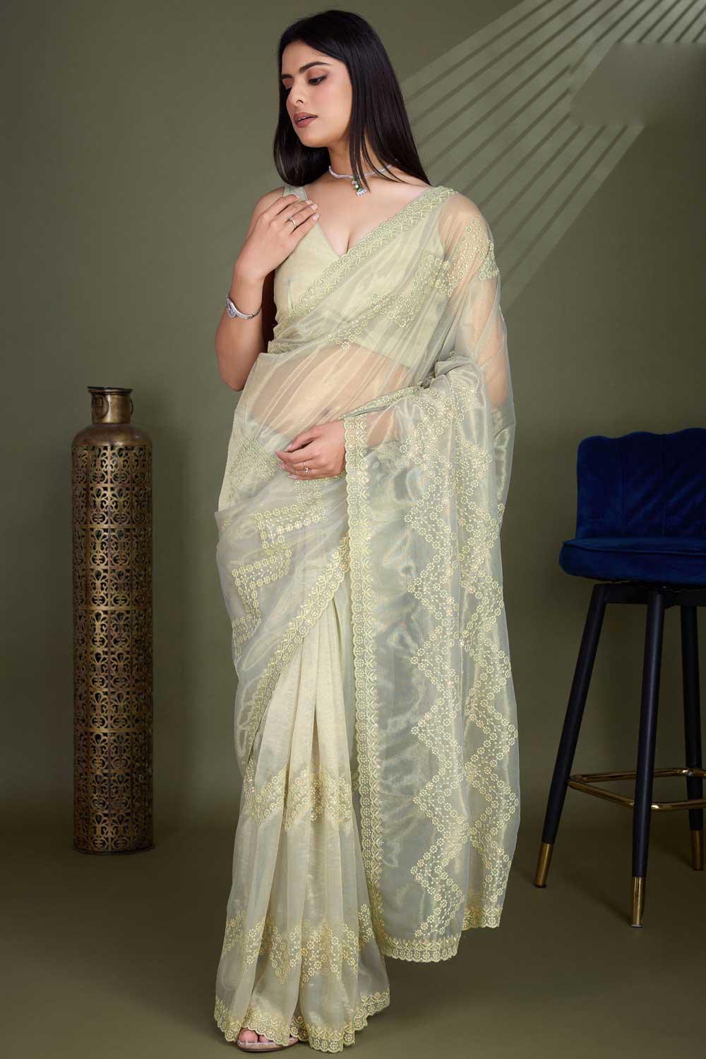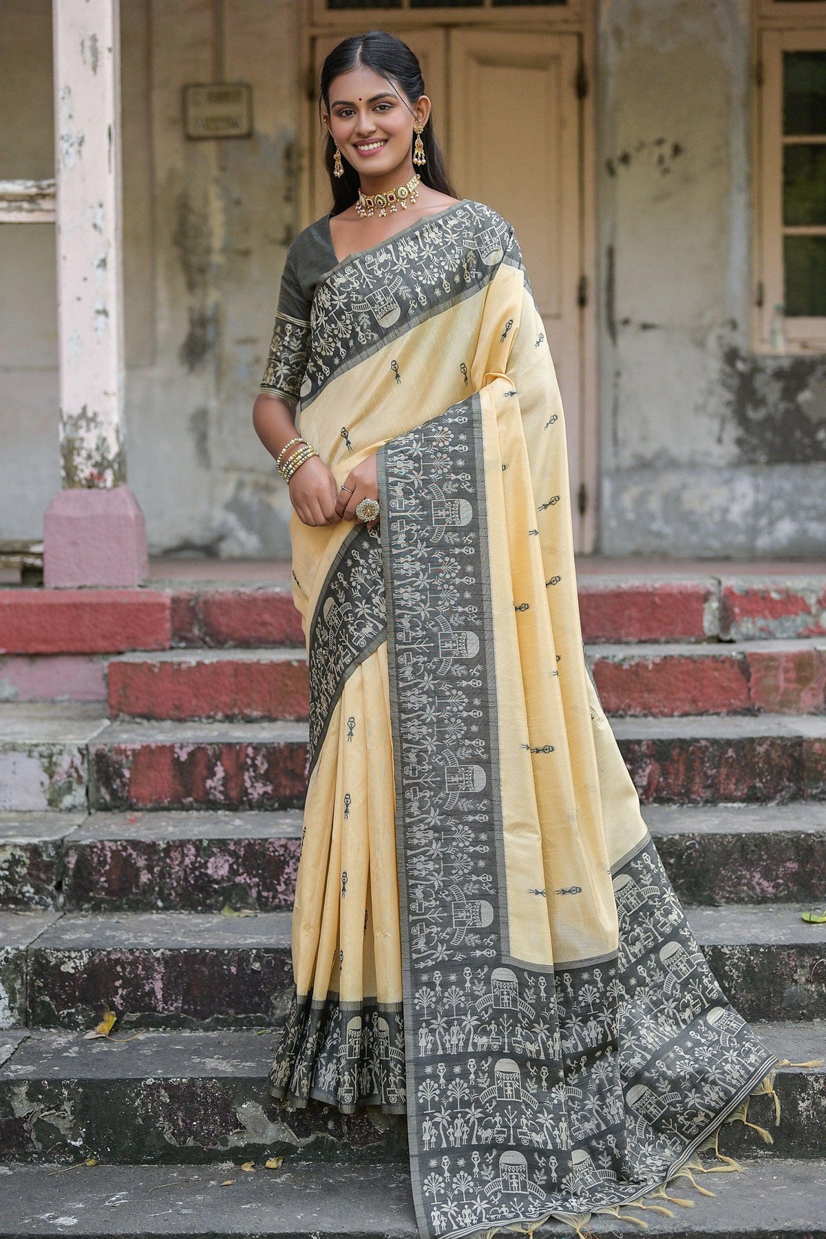 Incredible Satin Crepe Beige Color Saree With Contrast Blouse
