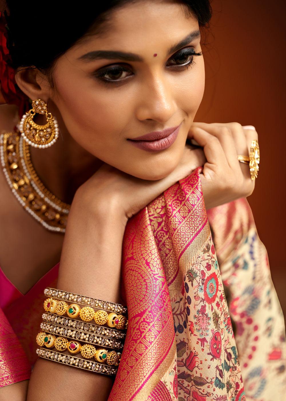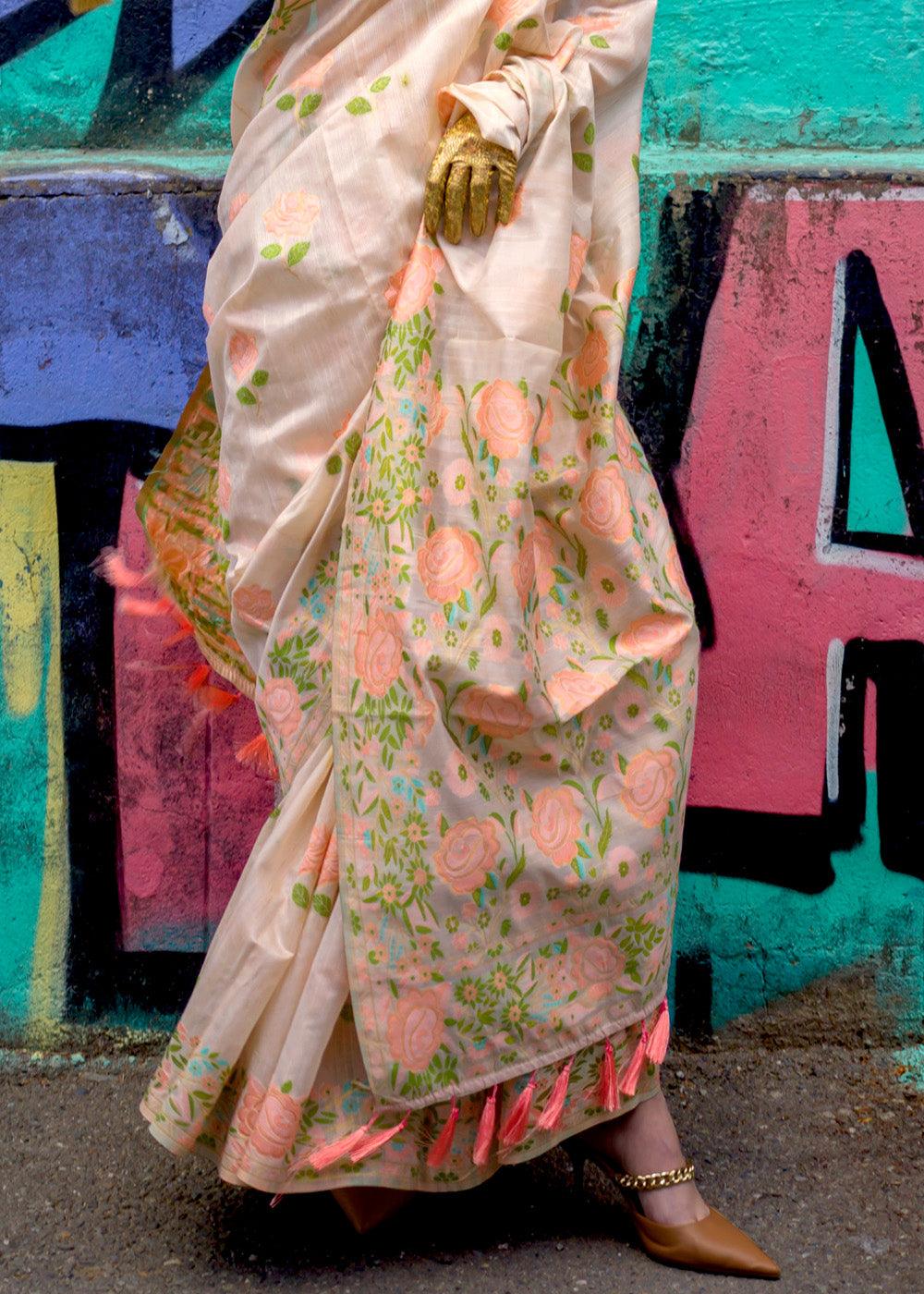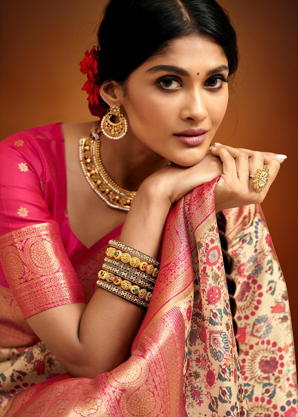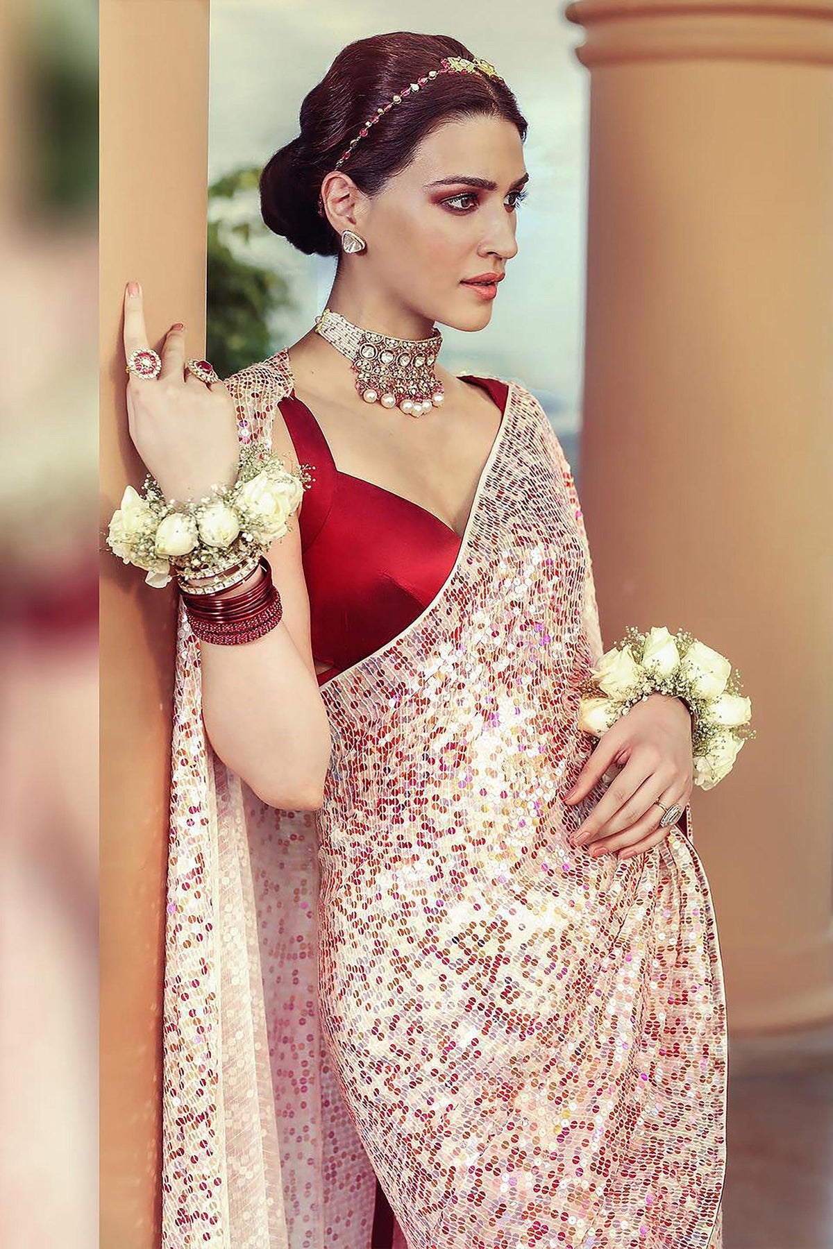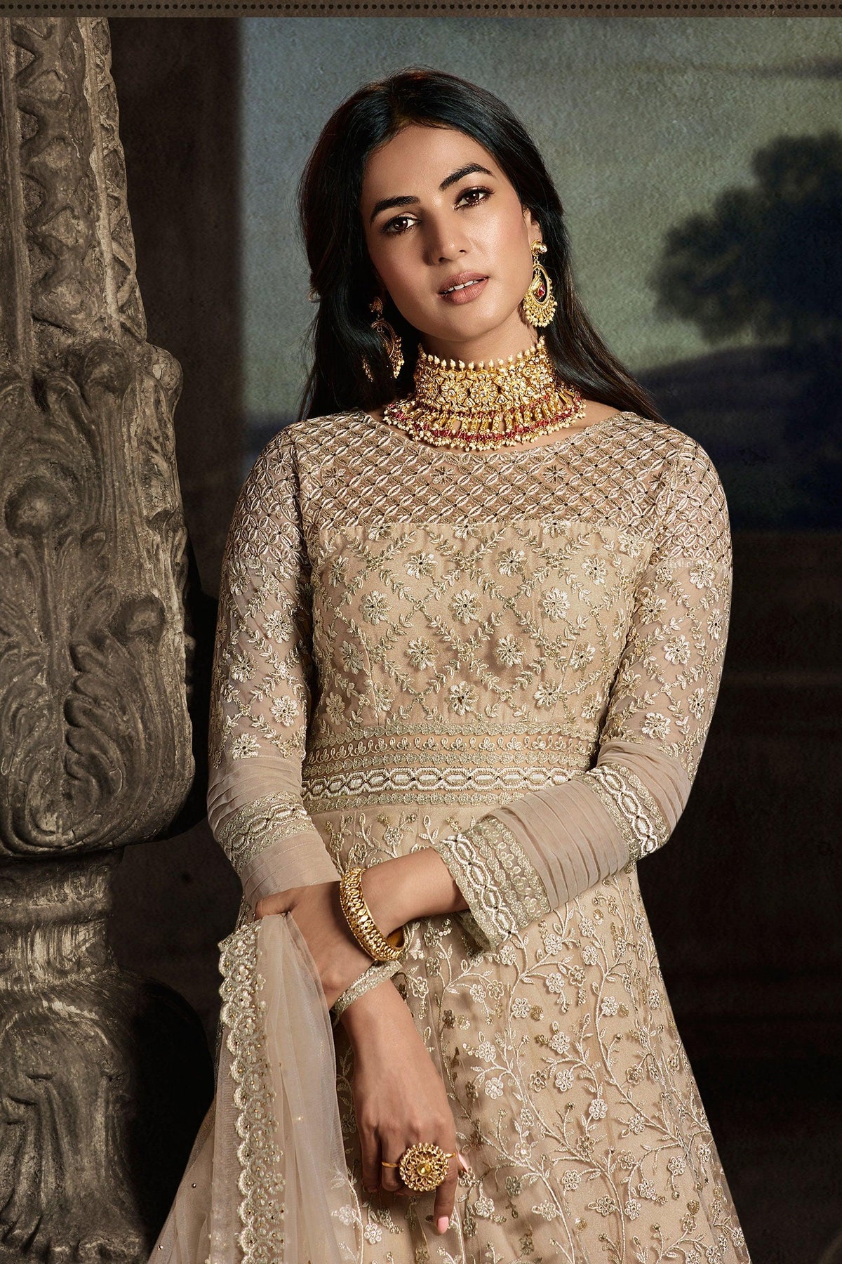 Incredible Satin Crepe Beige Color Saree With Contrast Blouse