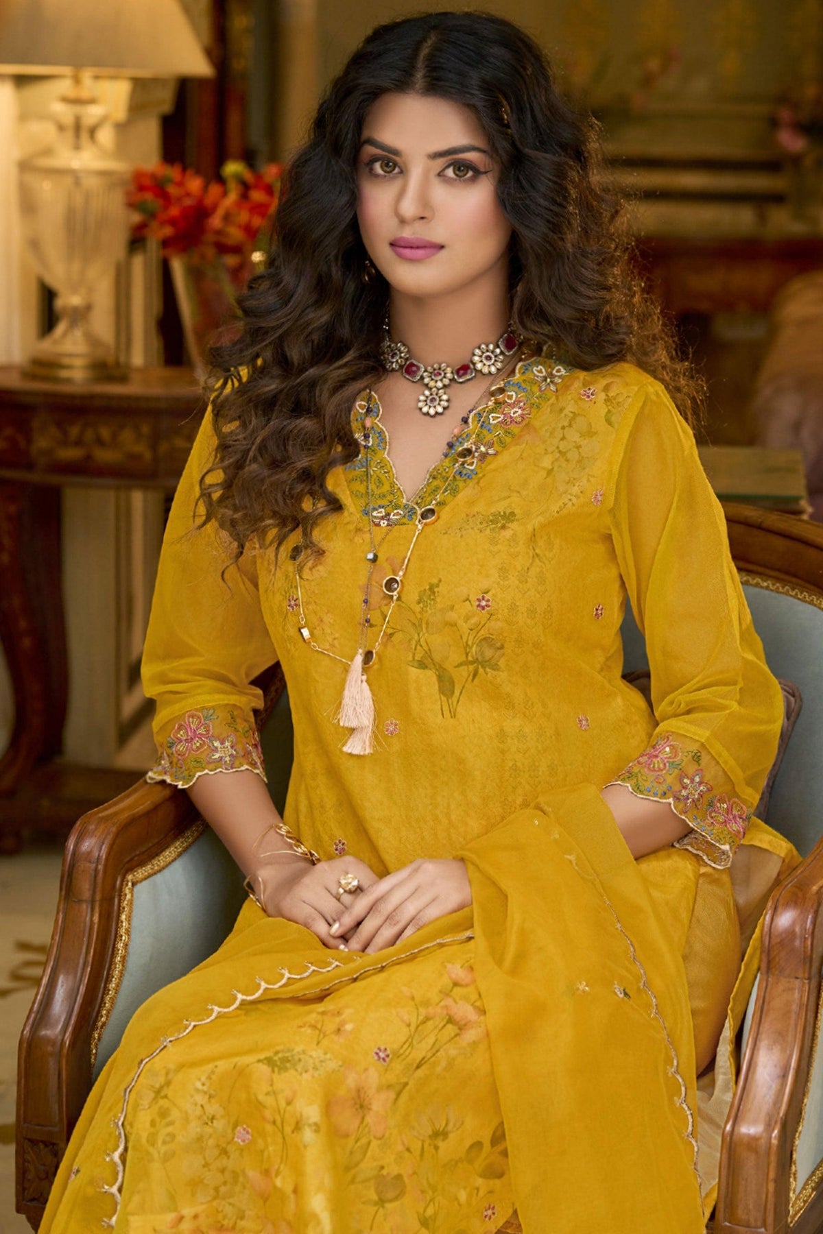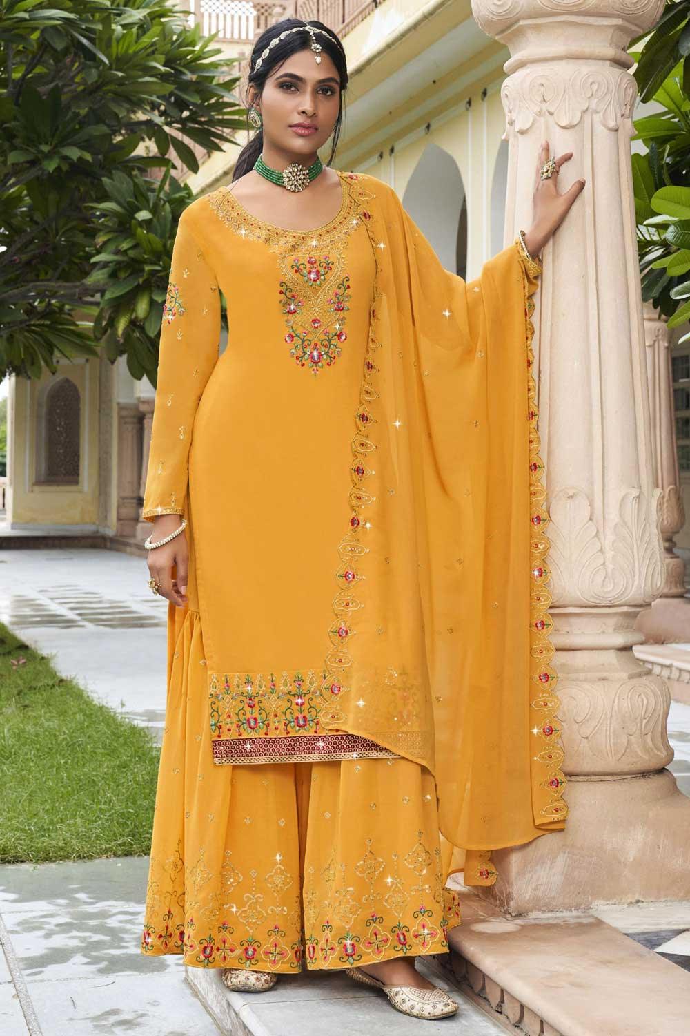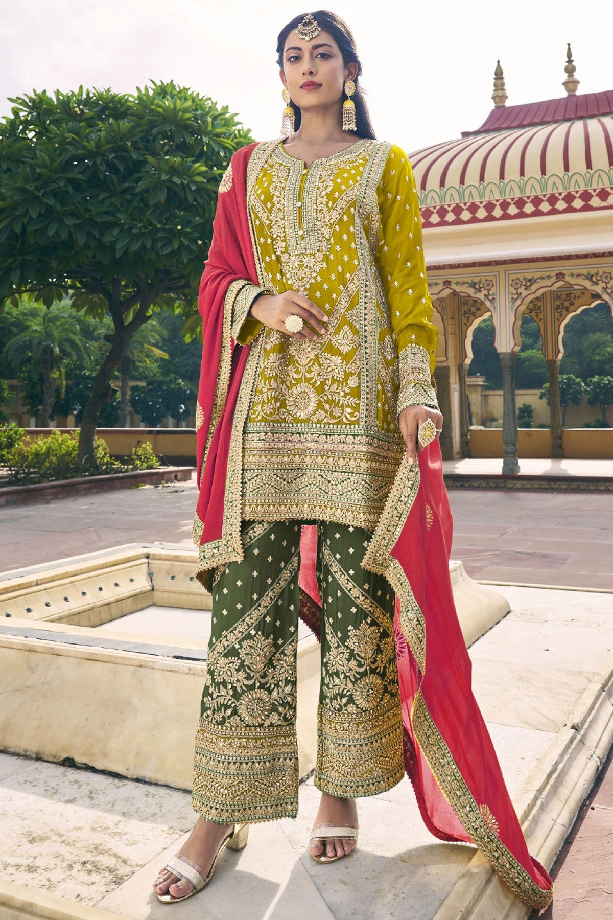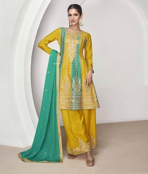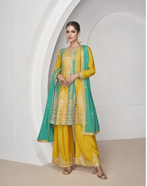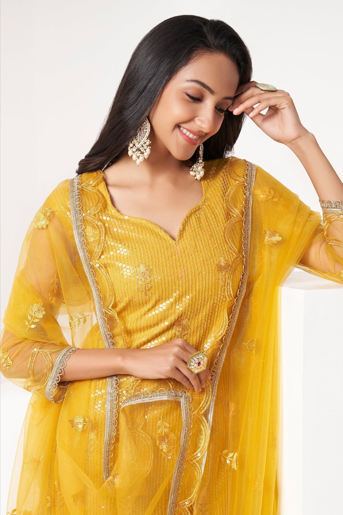 Yellow Color Chinon Fabric Enticing Sangeet Wear Readymade Palazzo Suit