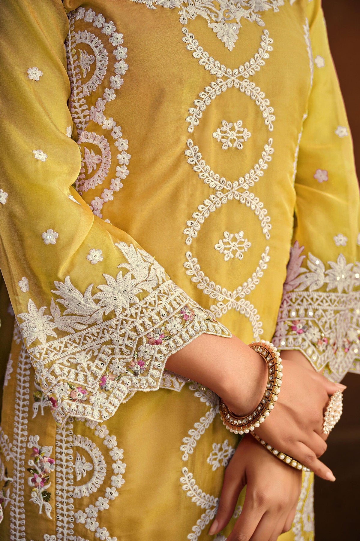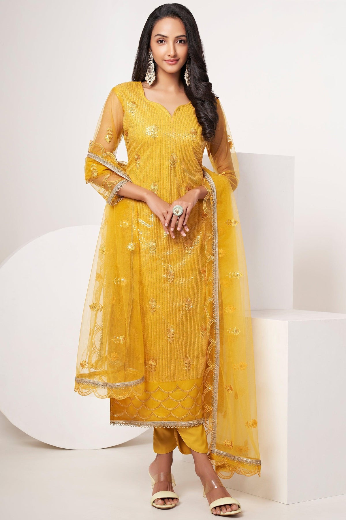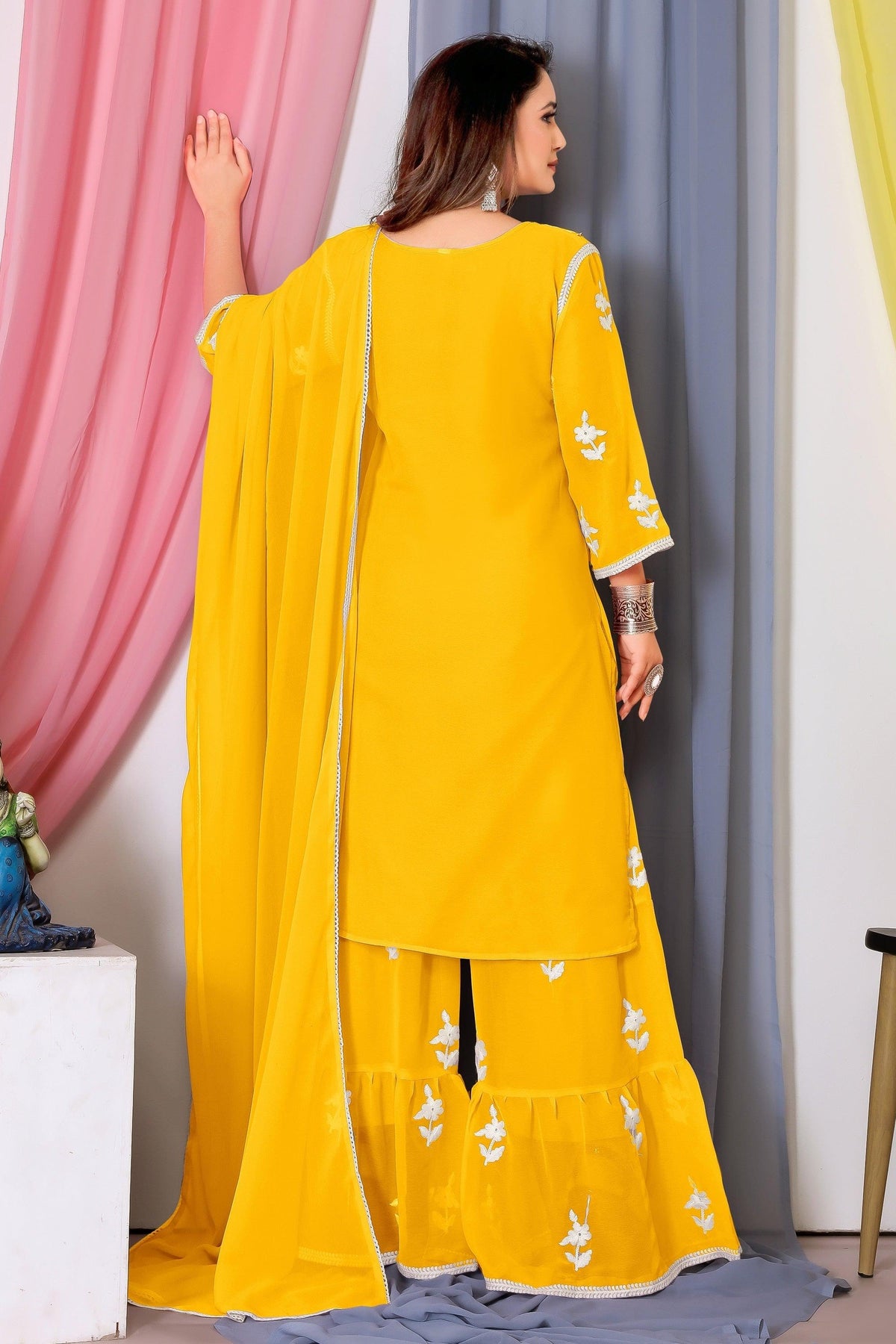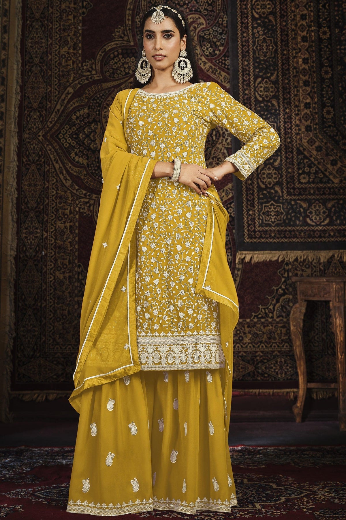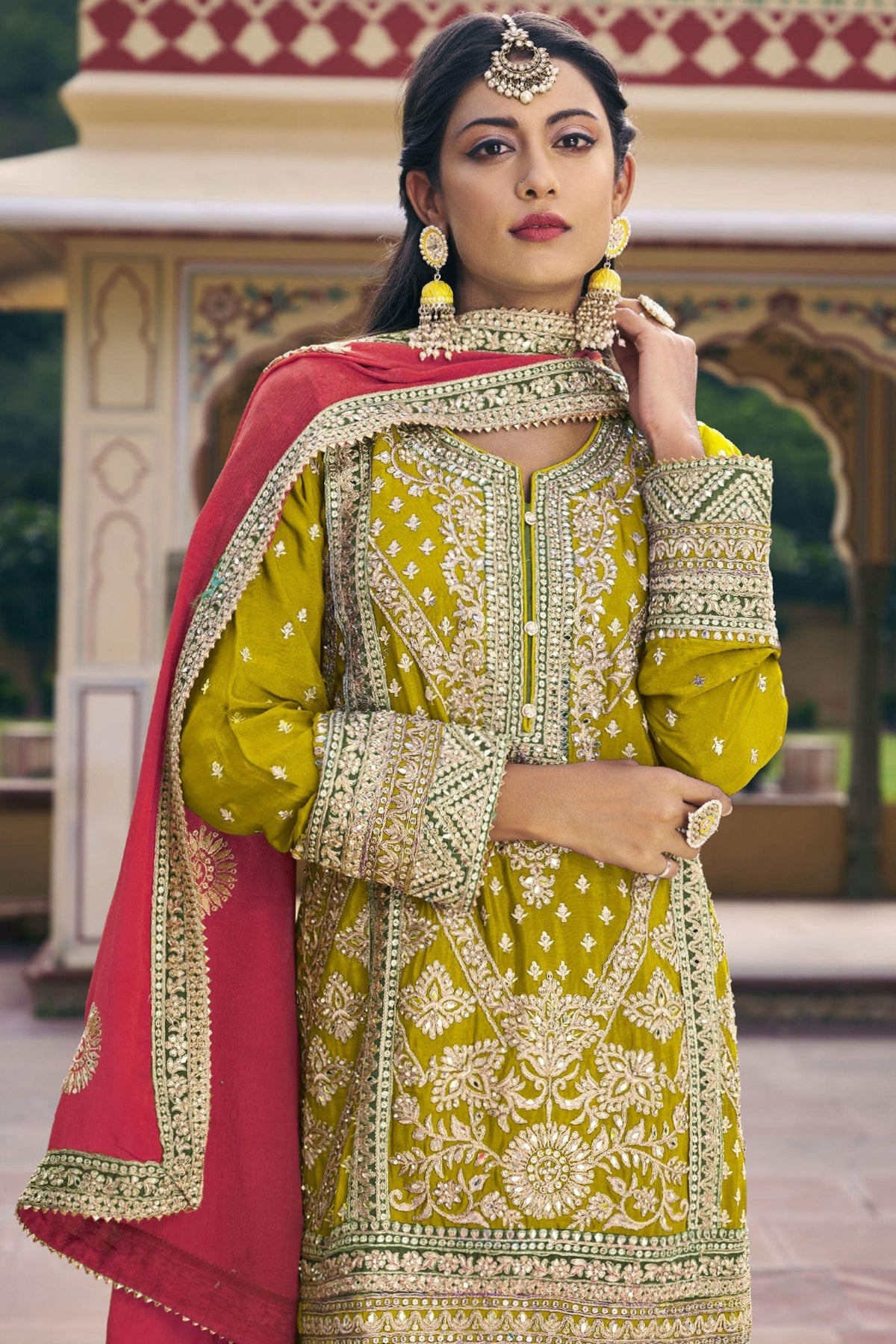 Yellow Color Chinon Fabric Enticing Sangeet Wear Readymade Palazzo Suit