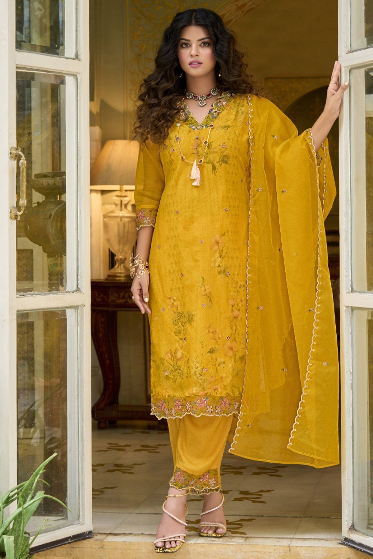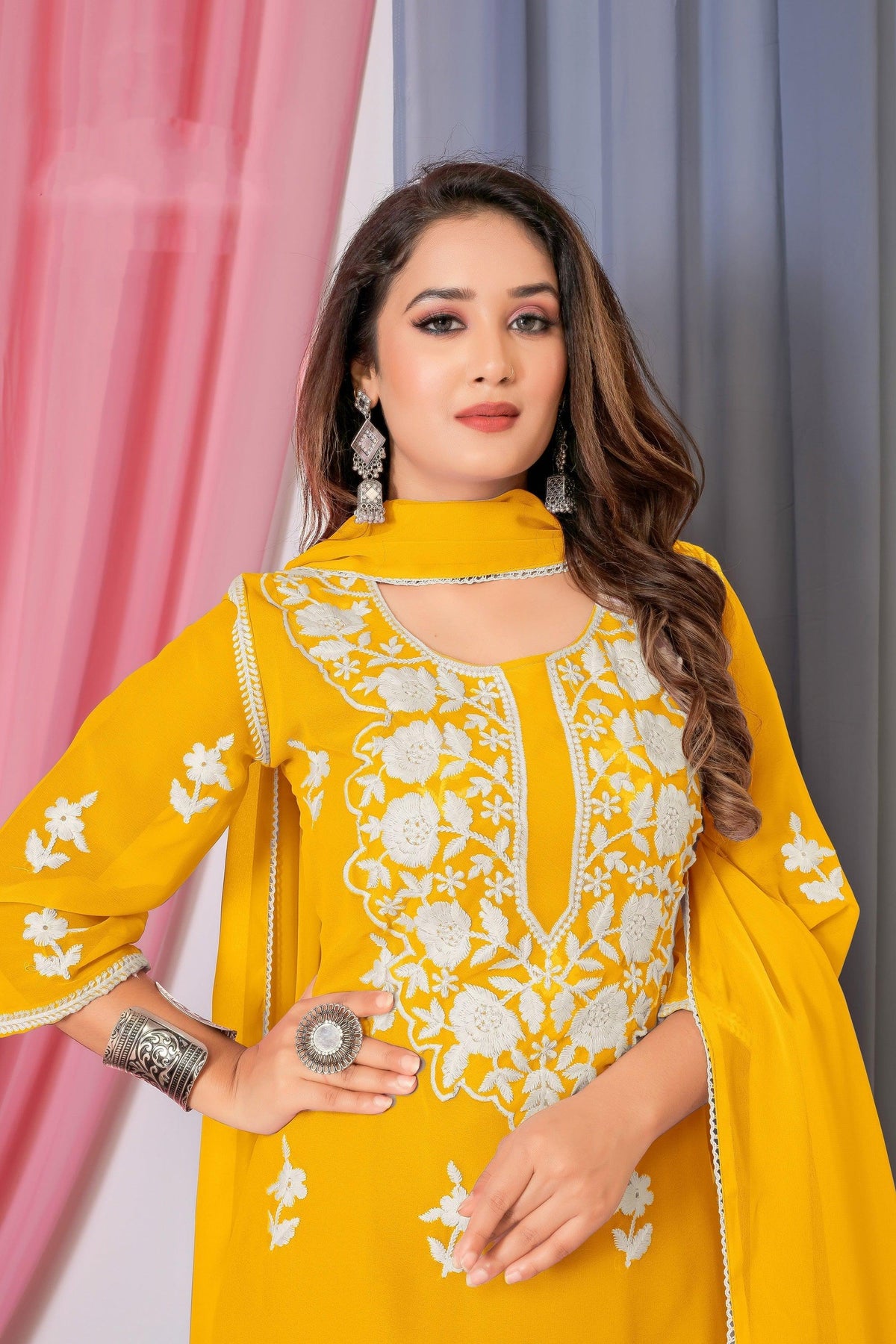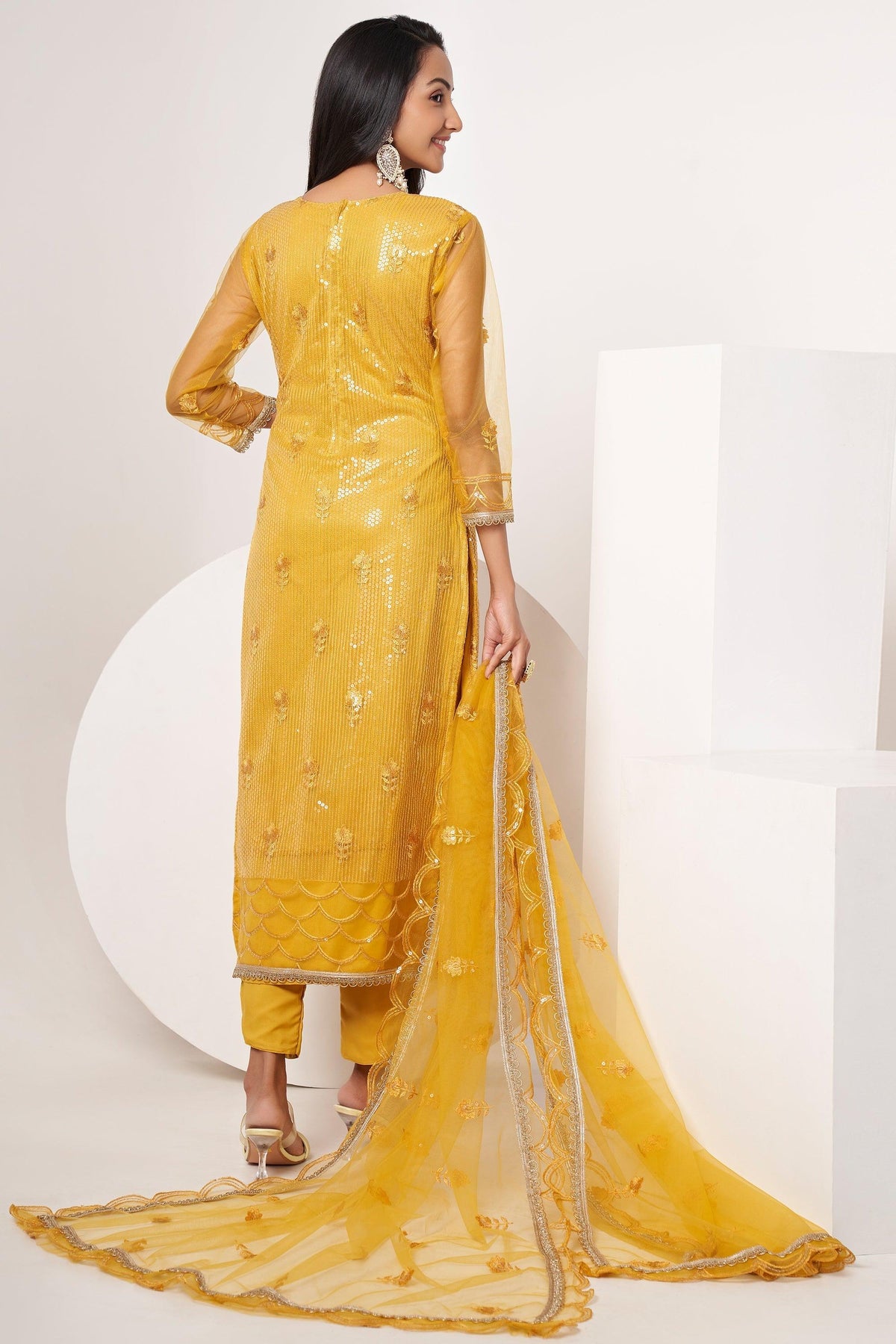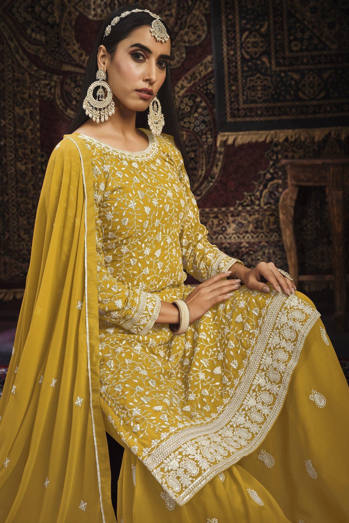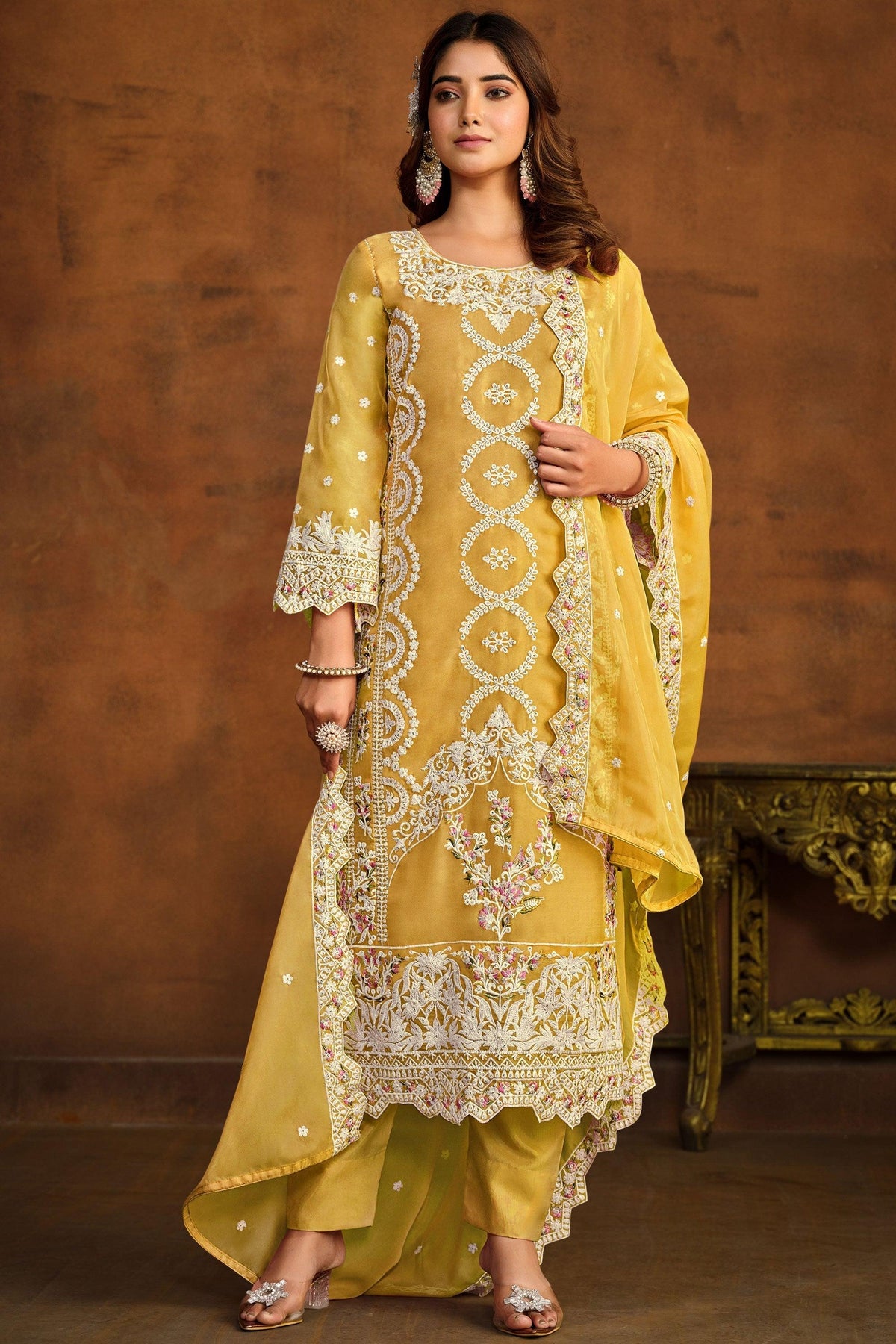 Yellow Color Chinon Fabric Enticing Sangeet Wear Readymade Palazzo Suit