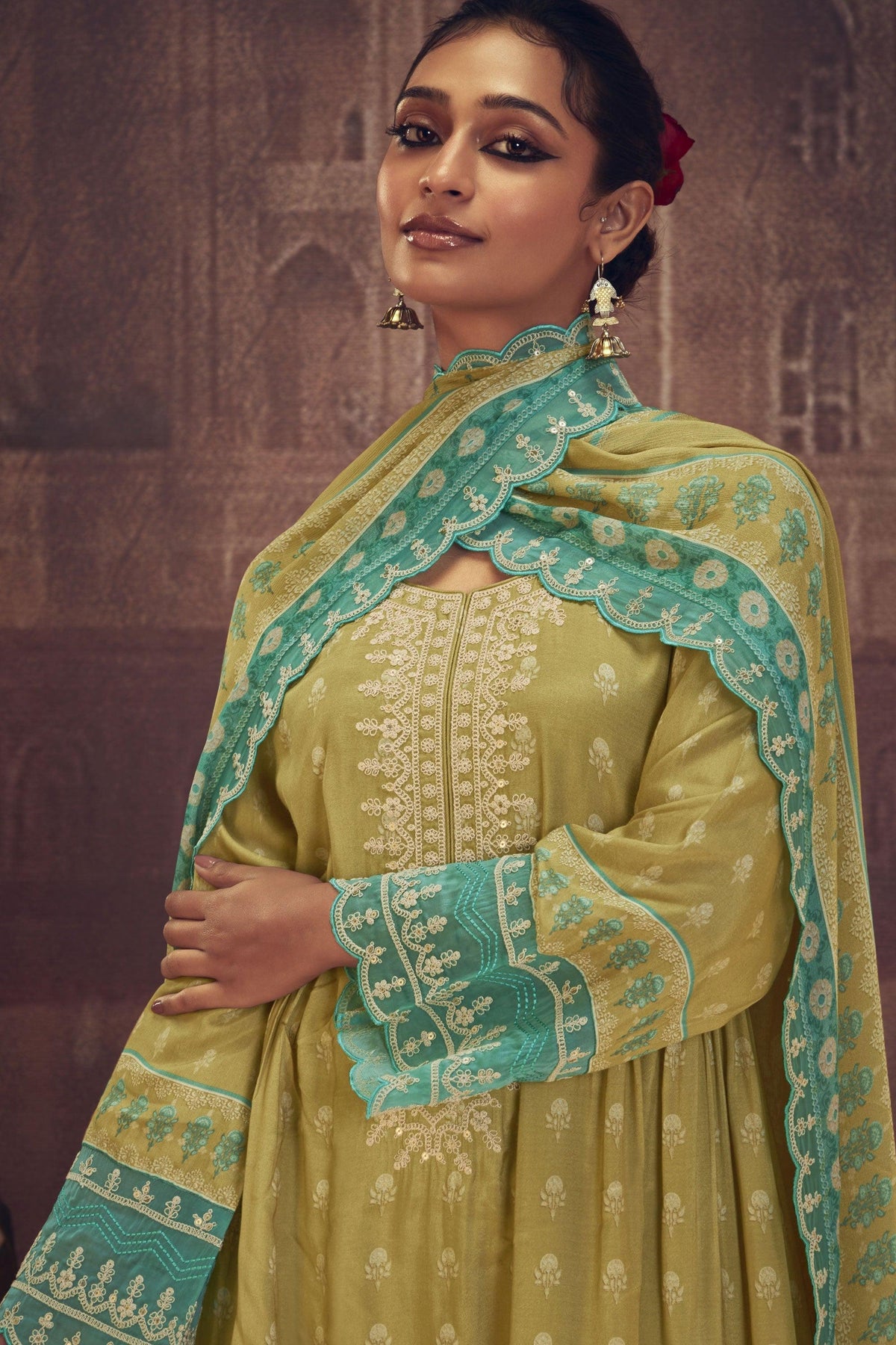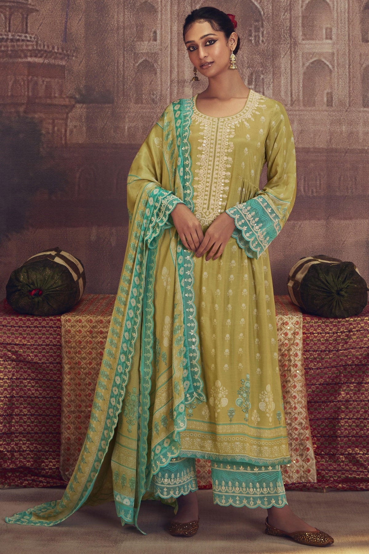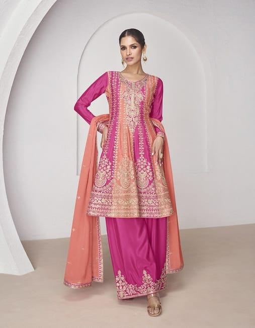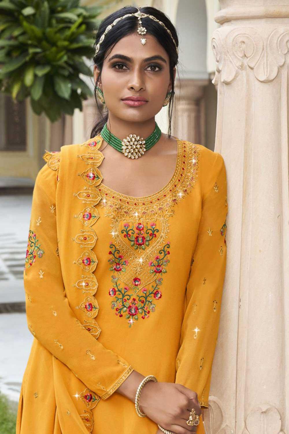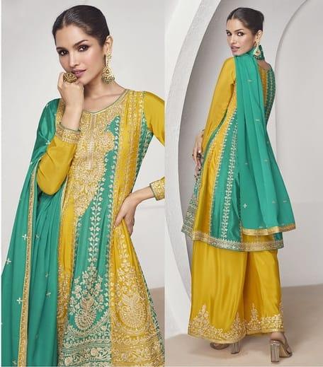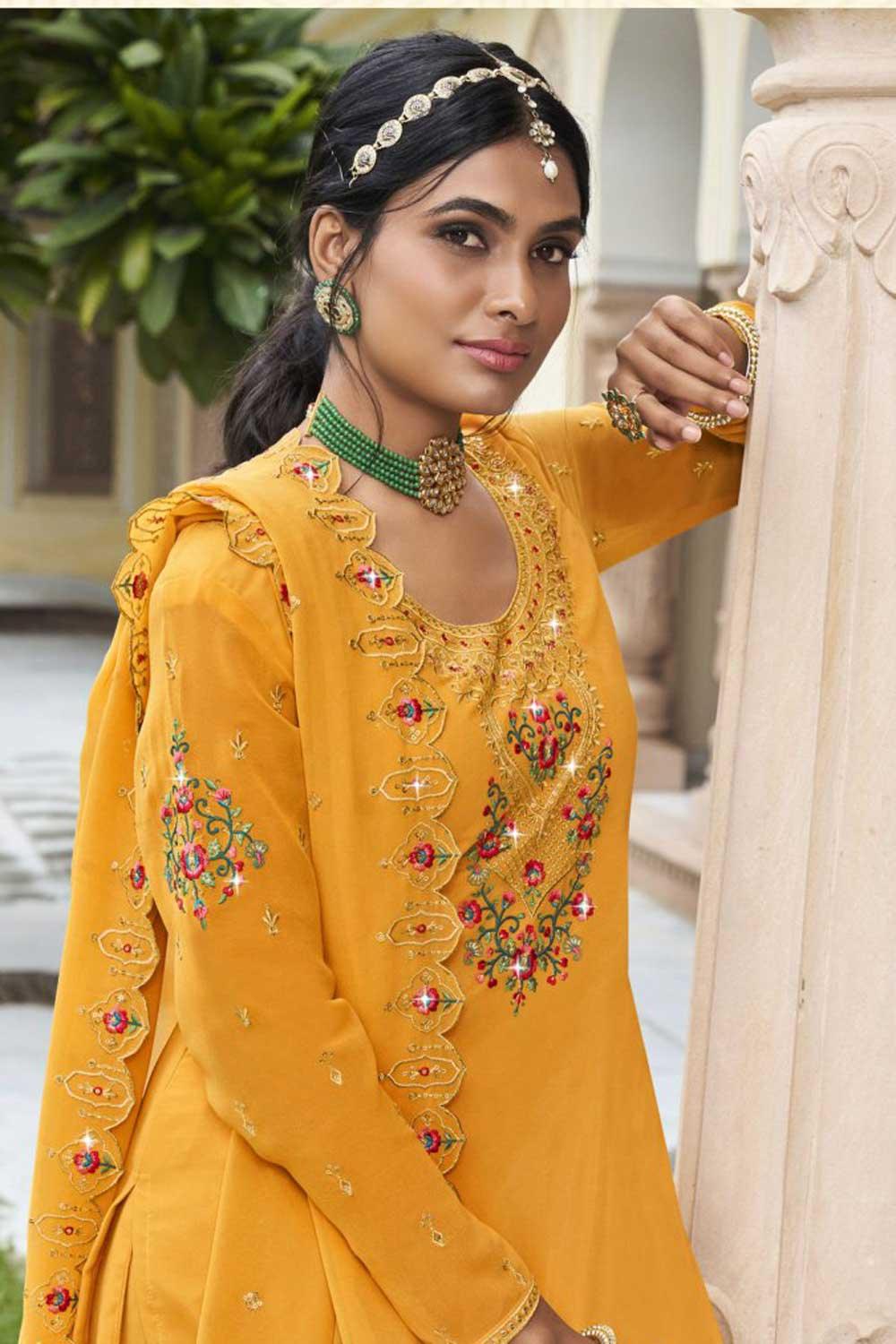 Elegant and ready-to-wear, our Chinon fabric Palazzo Suit is perfect for Sangeet wear. Adorned with exquisite embroidery, this outfit exudes charm and sophistication, making you the center of attention at any event.