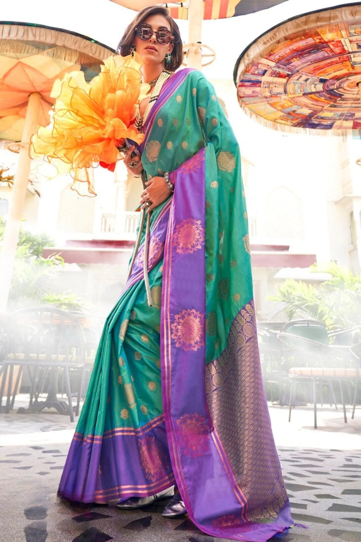 - Rock your party nights by adorning this printed saree with matching statement accessories. "