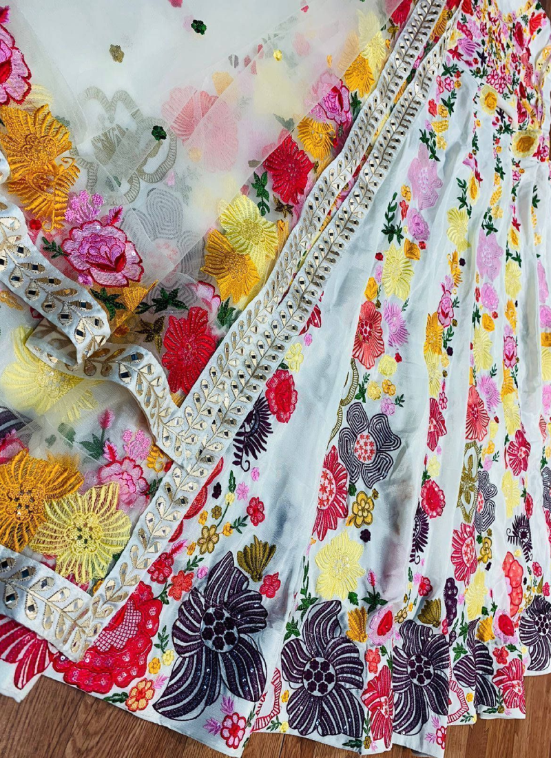 Wedding wear multi thread sequence work simple white lehenga choli. Embroidery work lehenga comes with chinon fabric white color choli and four side lace border net dupatta. Unique wedding wear lehenga choli for the upcoming festivals for weddings, parties, and ceremony season. Its pretty flared lehenga will give an attractive look to your personality.