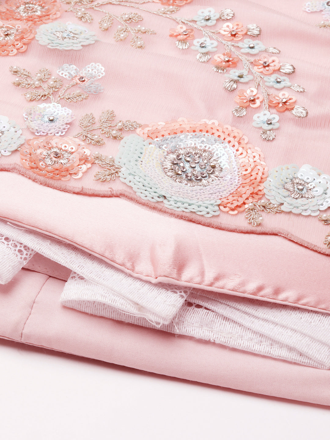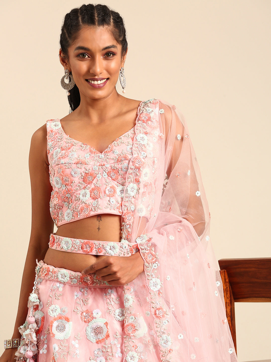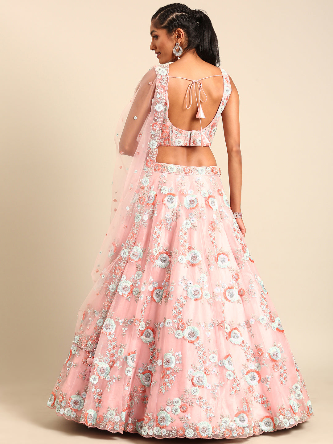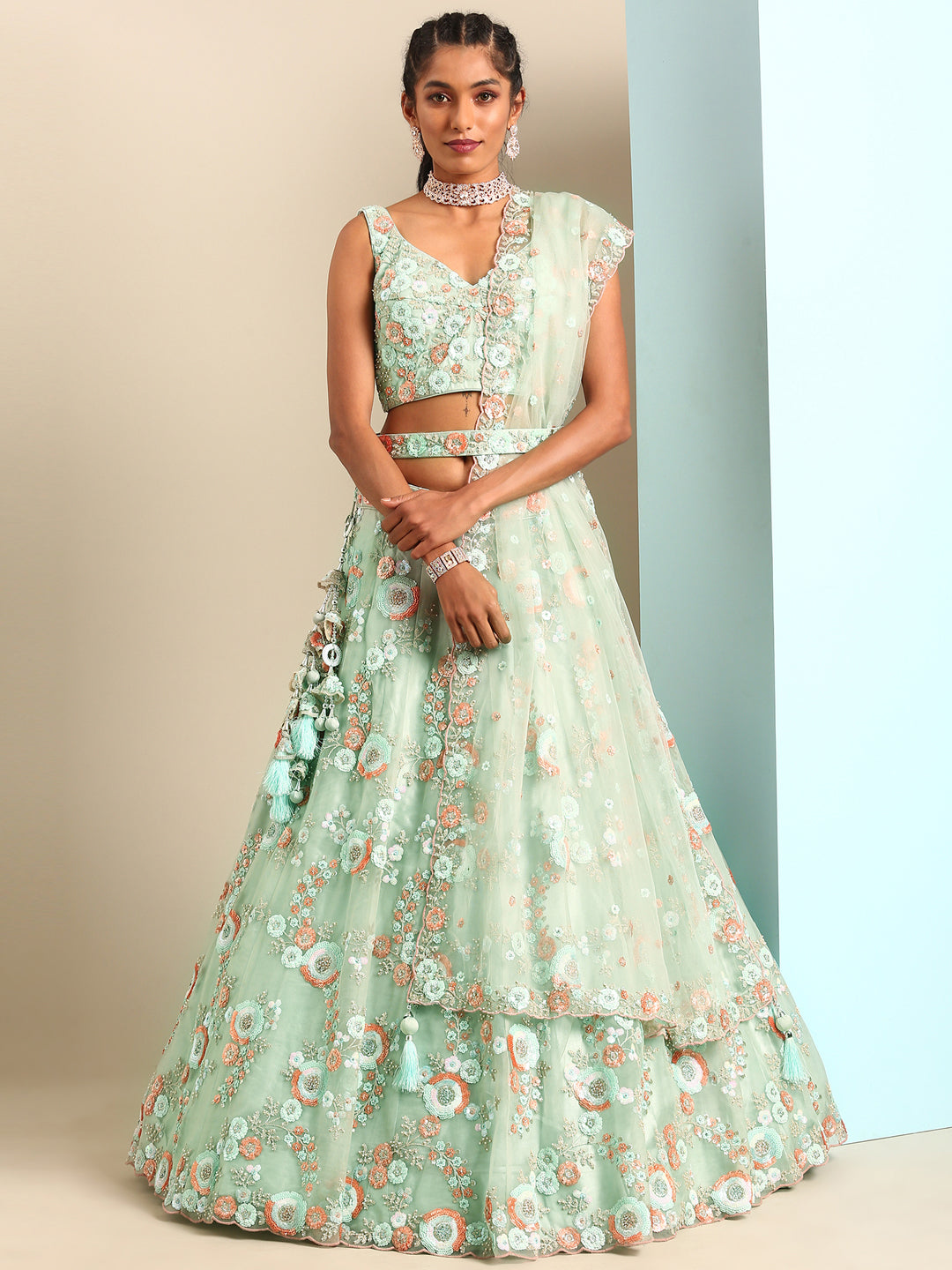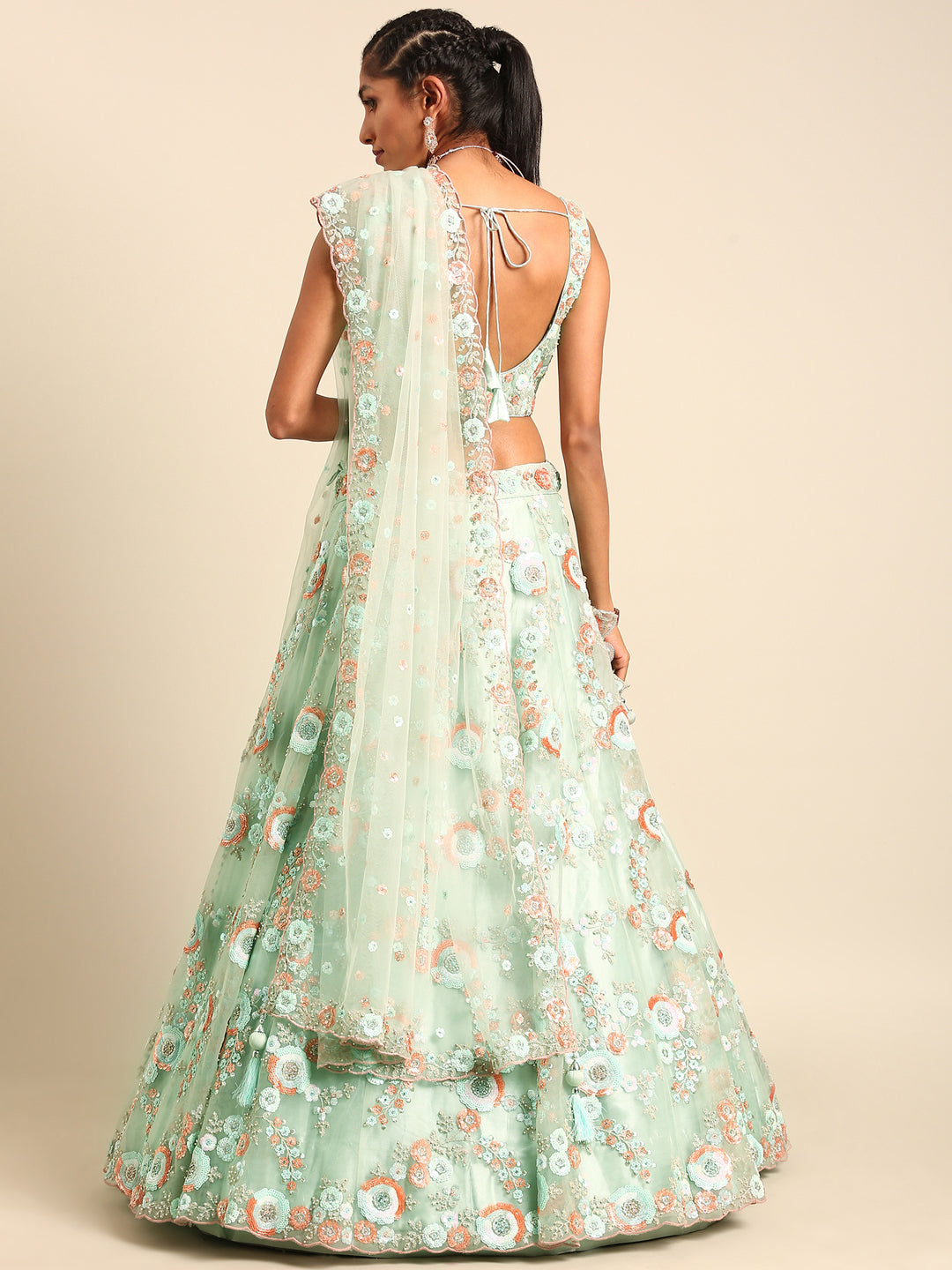 • Lehenga:-  Made of premium quality Lavender-Seagreen-Pink Colour Net fabric Full Flare Semi-Stitched Lehenga With heavy Sequins work, coding, with Zarkan and Moti Embroidery work. Has a thread cut work border on the hemline.