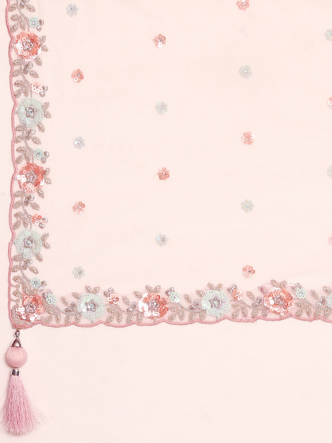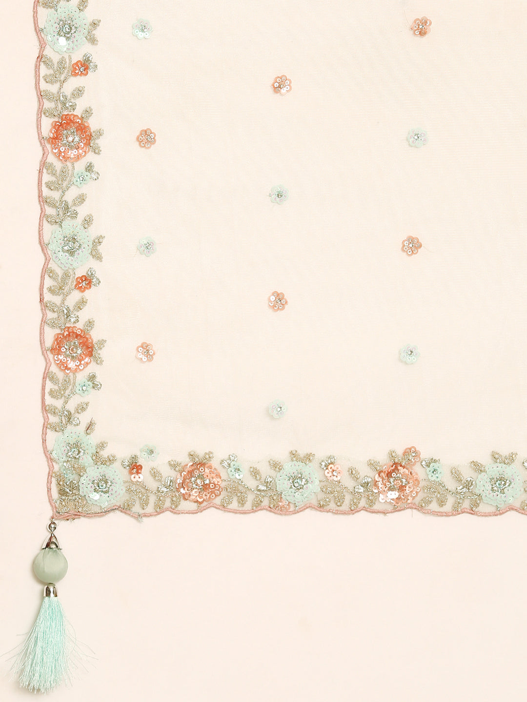 • Dupatta:- Lavender-Seagreen-Pink Net Dupatta has a sequins work Ethnic motif with Embroidery cut work Border.
