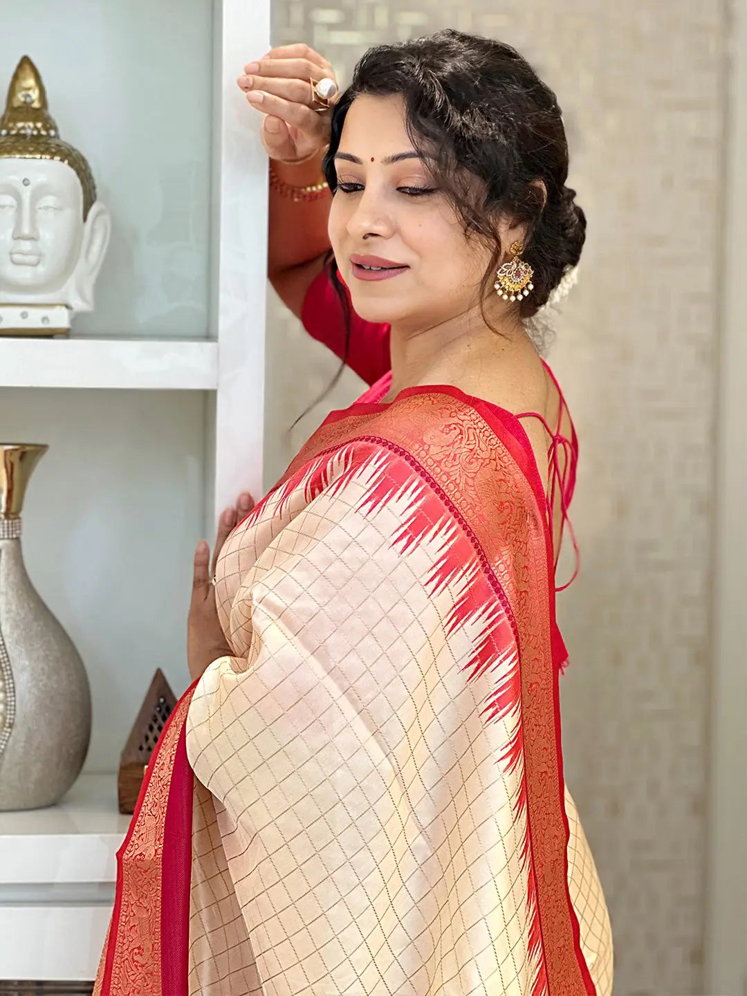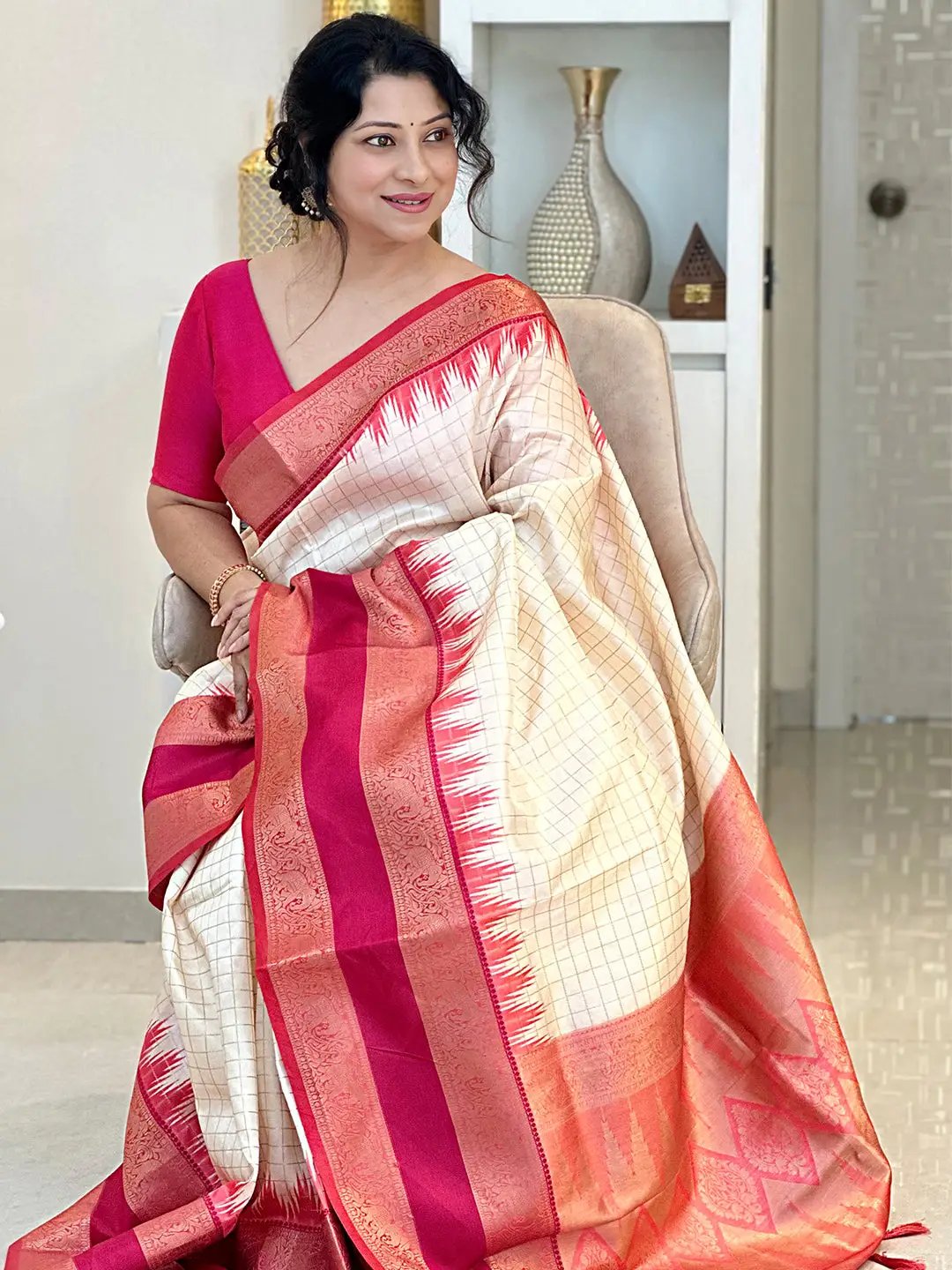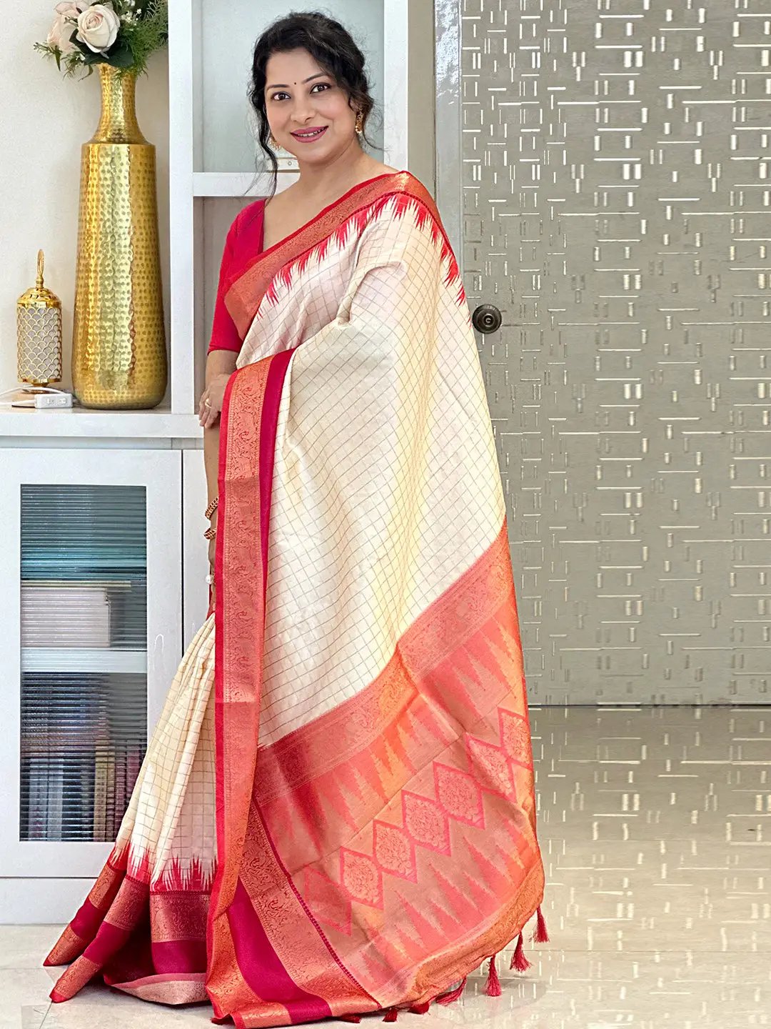 Transform your look with the stunning Designer White Colour Banarasi Silk Gadwal Pattu Saree. Crafted from premium quality Soft Silk material, it showcases a delicate Satin Border for an extra touch of elegance. This  White Colour Banarasi Silk Gadwal Pattu Saree offers utmost comfort and effortless maintenance, making it ideal for various events.  White Colour Banarasi Silk Gadwal Pattu Saree comes with an unstitched fabric blouse piece that can be customized according to your liking. Complete the ensemble with traditional accessories for a perfect finish.