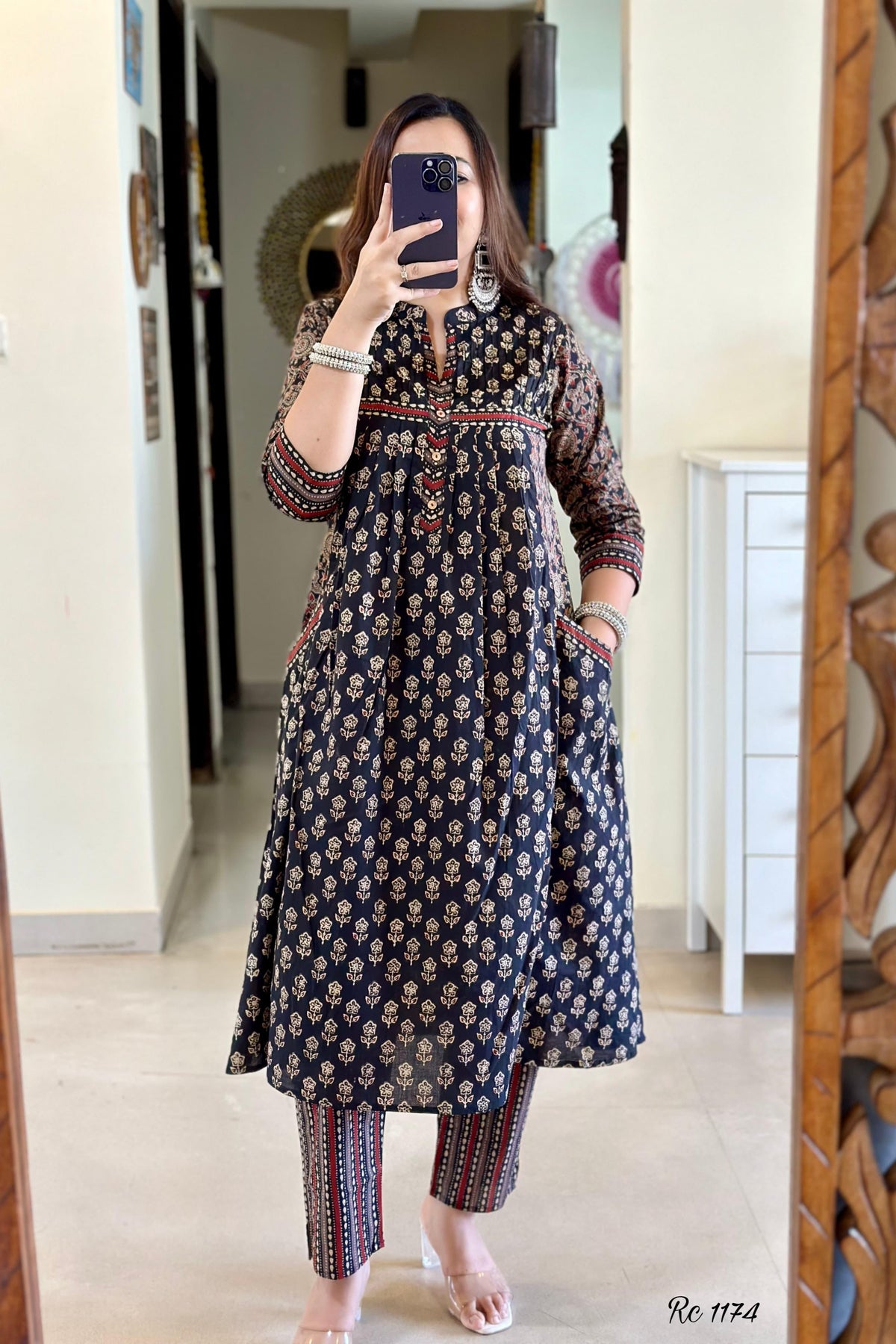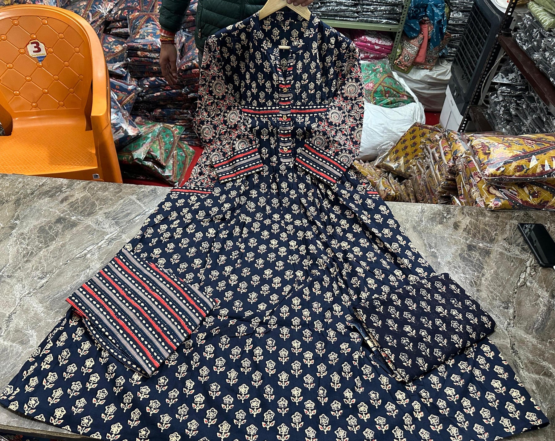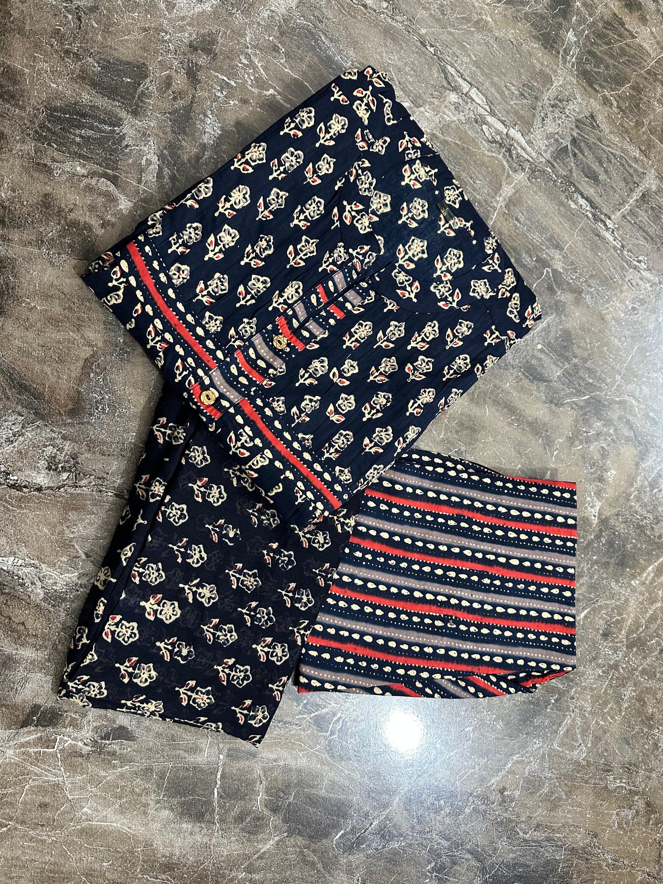 • Kurti: A-line cut with machine print & adda work detailing for an extra flair