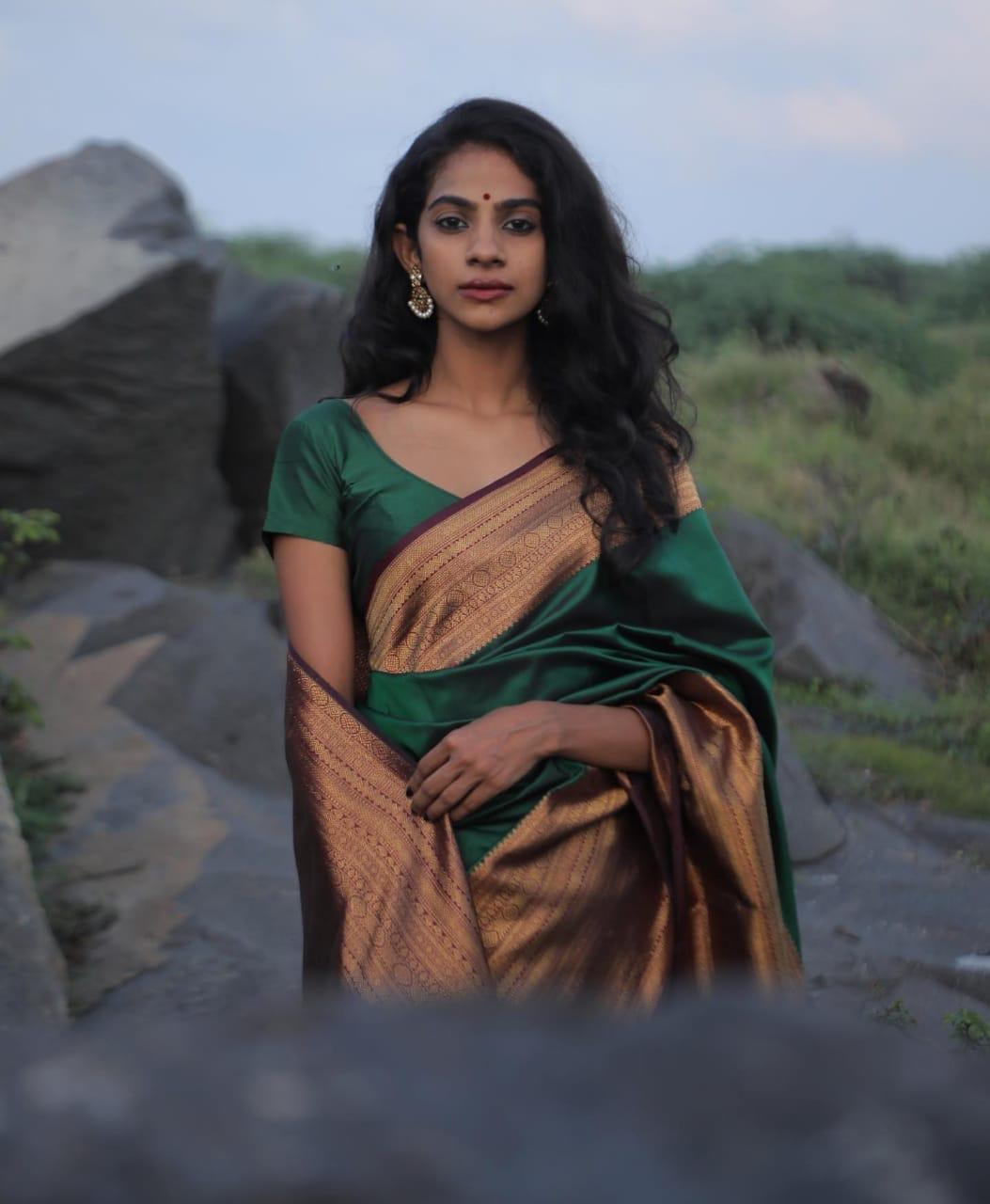 Experience the enchanting beauty of this exquisite green Kanjivaram Silk Saree, designed to captivate on special occasions. The saree features a stunning bottle green body complemented by a rich maroon border adorned with intricate zari detailing, showcasing traditional craftsmanship and elegance.