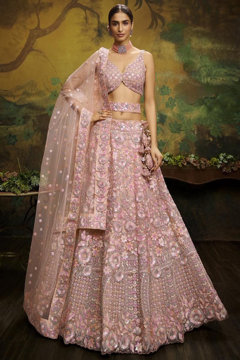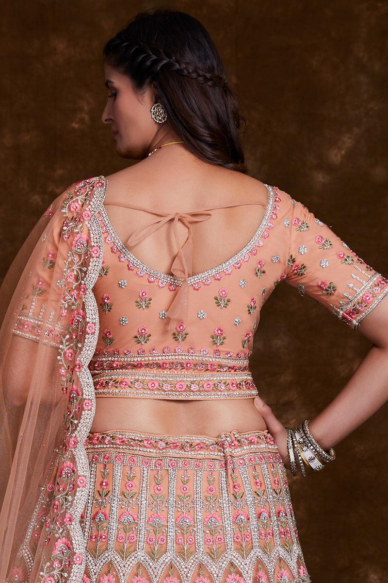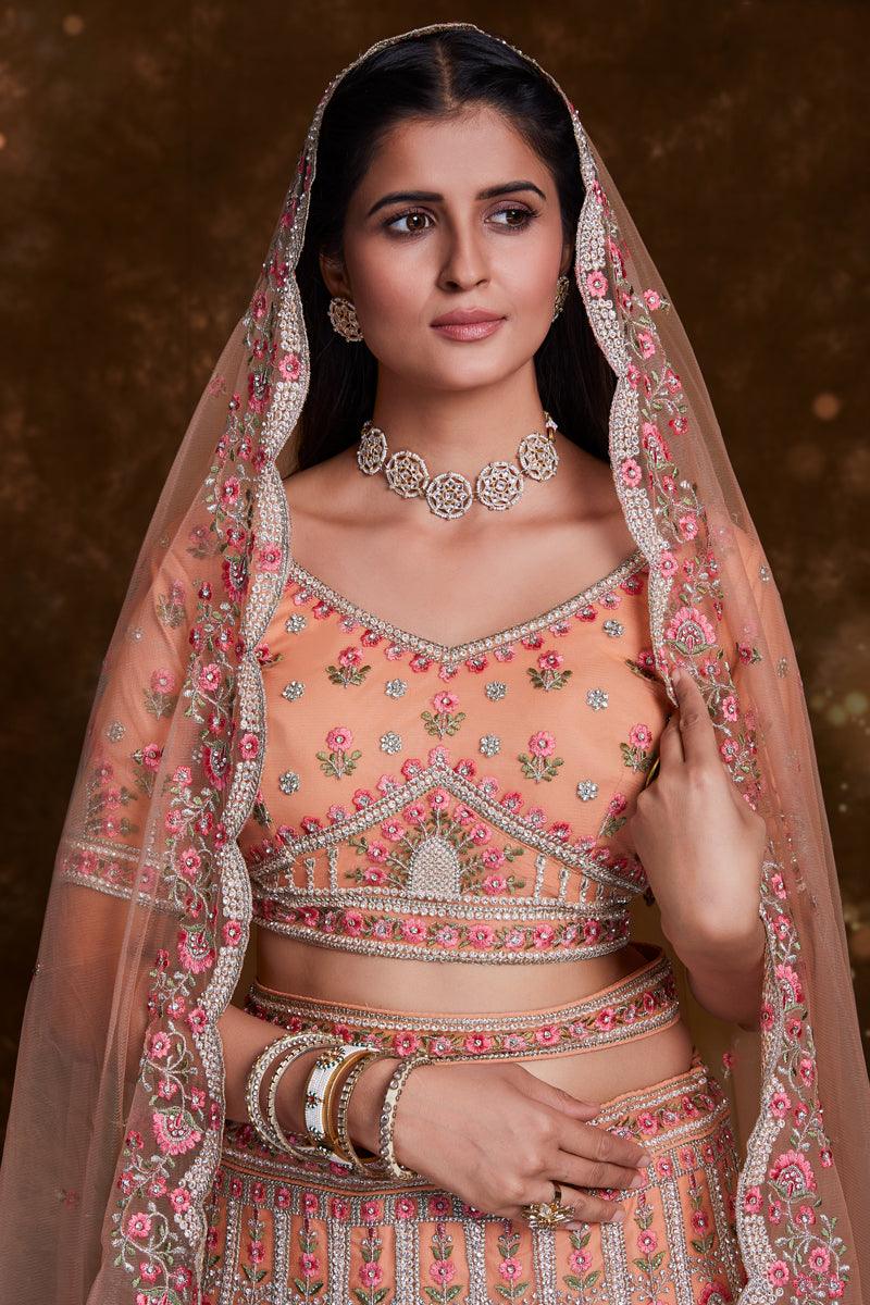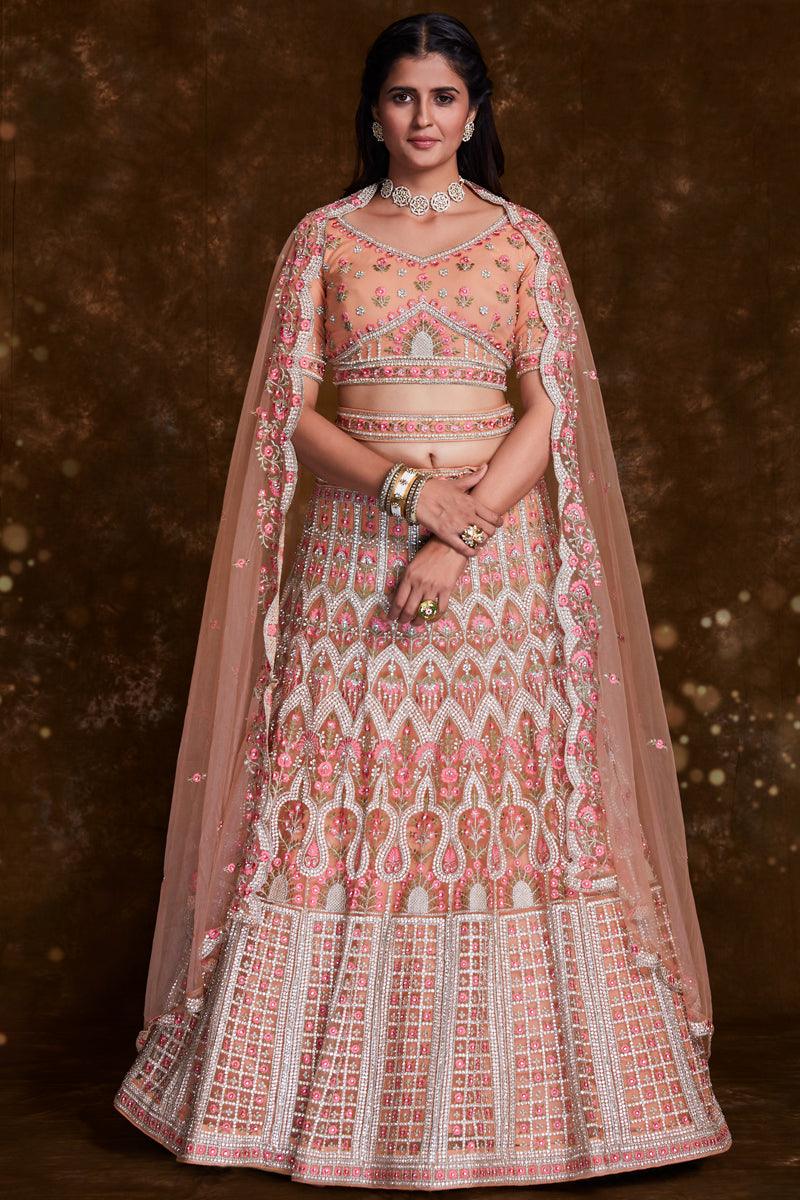 Sangeet Wear Peach Color Tempting Net Readymade Lehenga Choli