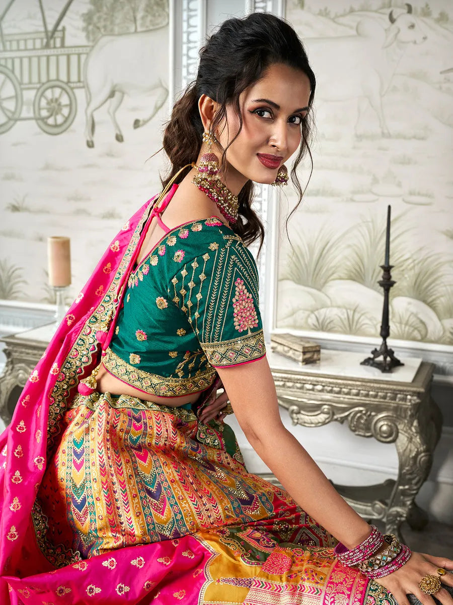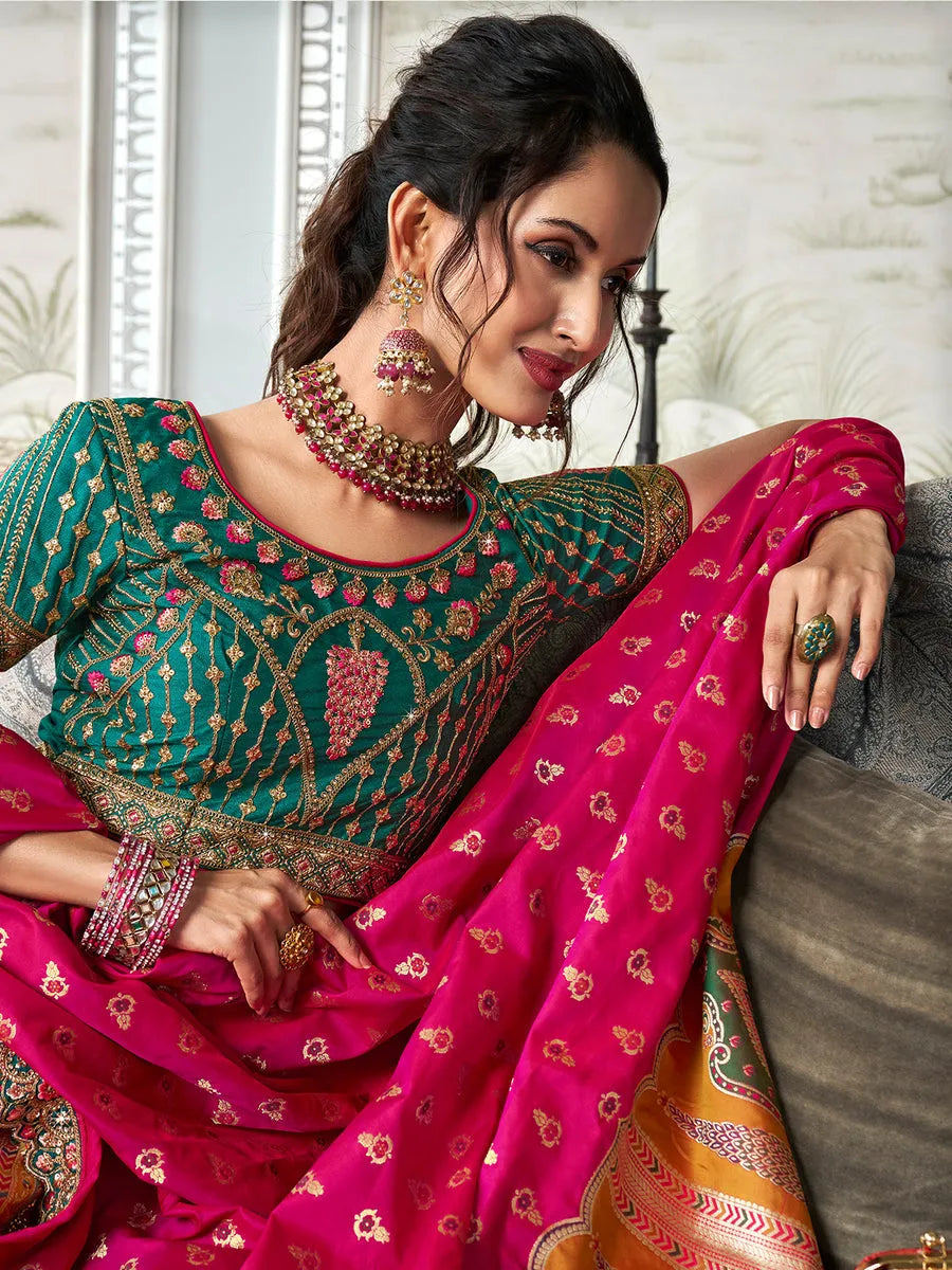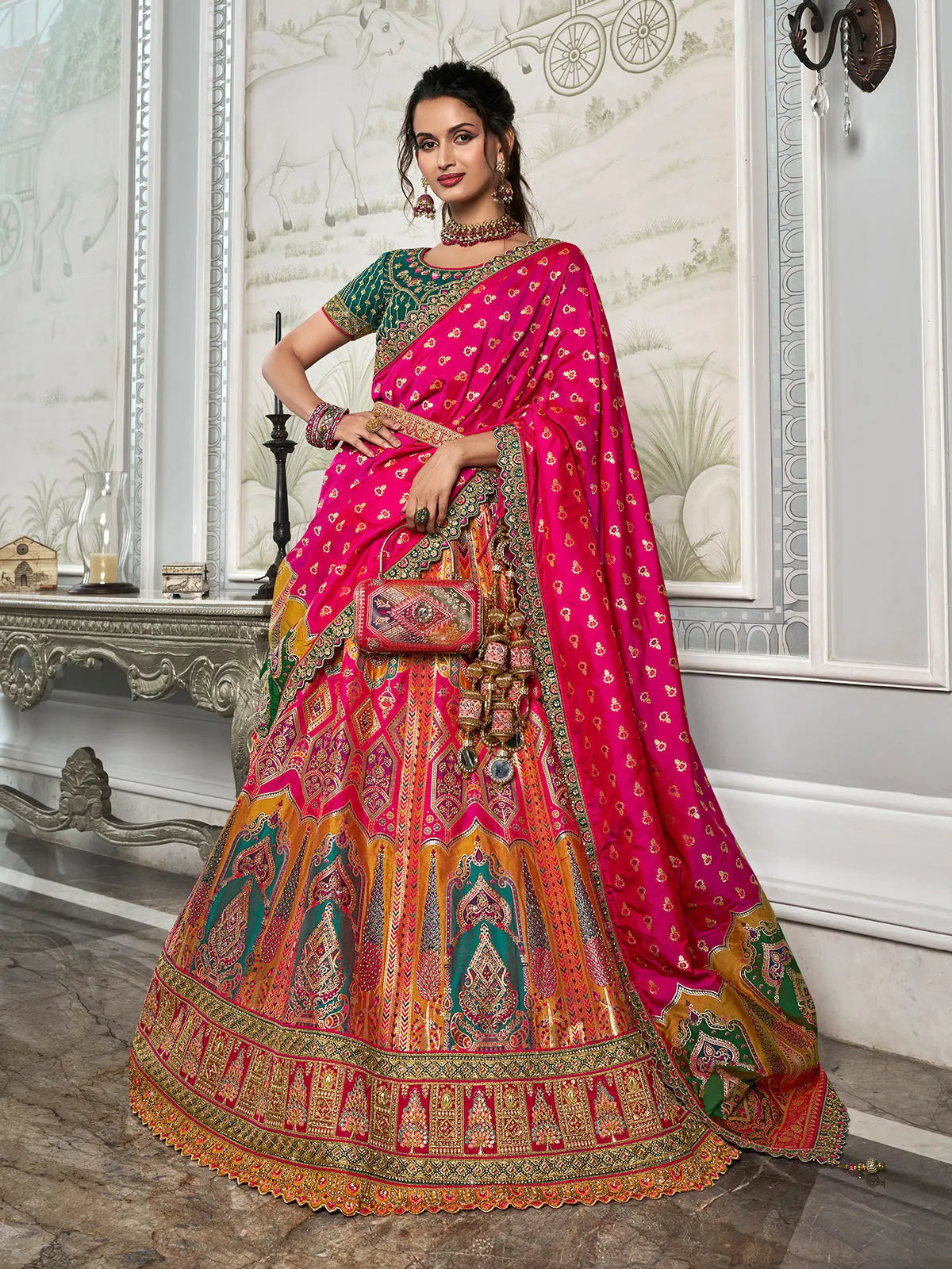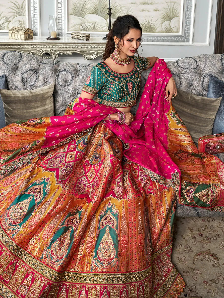Enhance your ethnic wardrobe with this exquisite pink Dola silk lehenga choli set from Suratikart. Its luxurious fabric, intricate detailing, and vibrant design make it a remarkable choice for any special occasion, allowing you to look and feel your best.