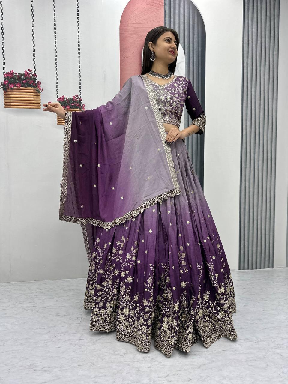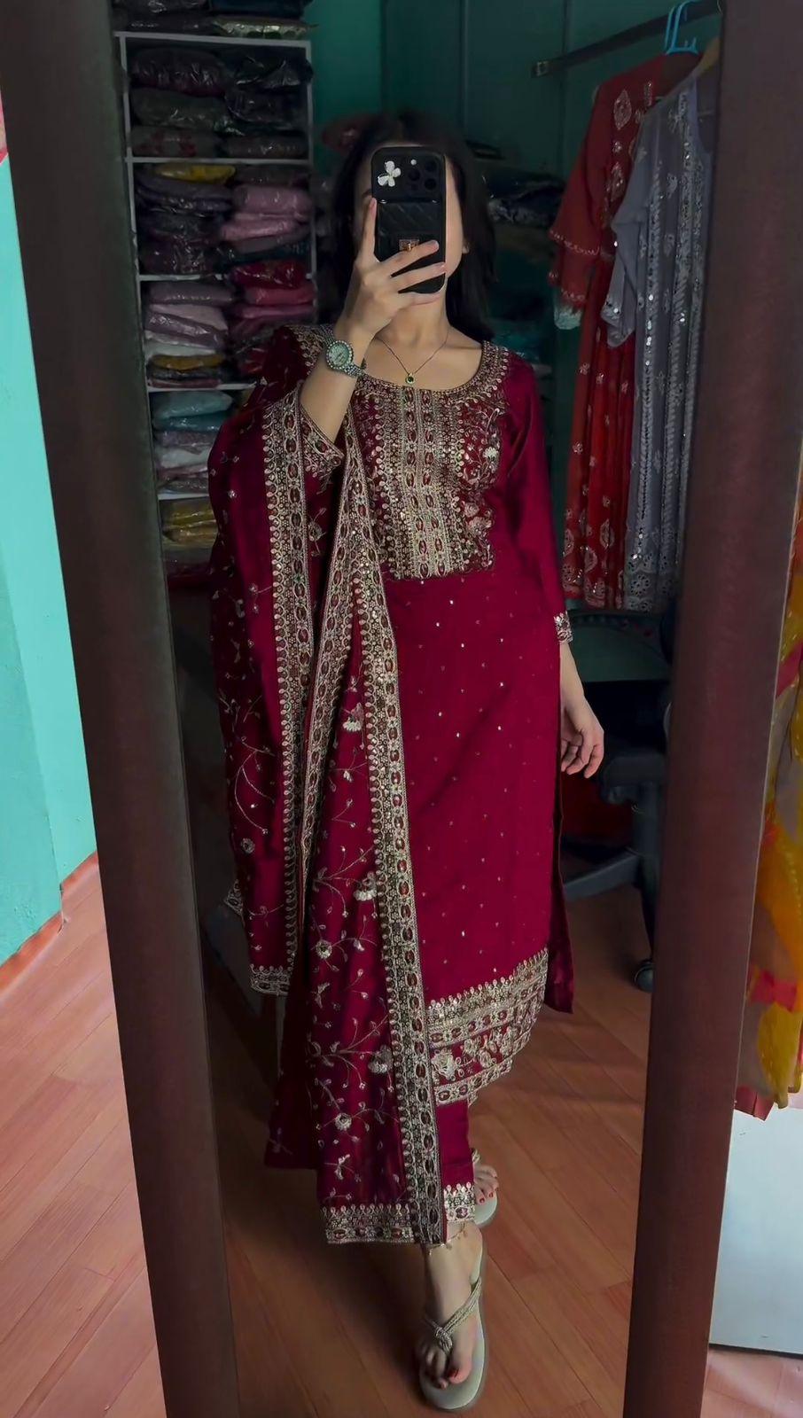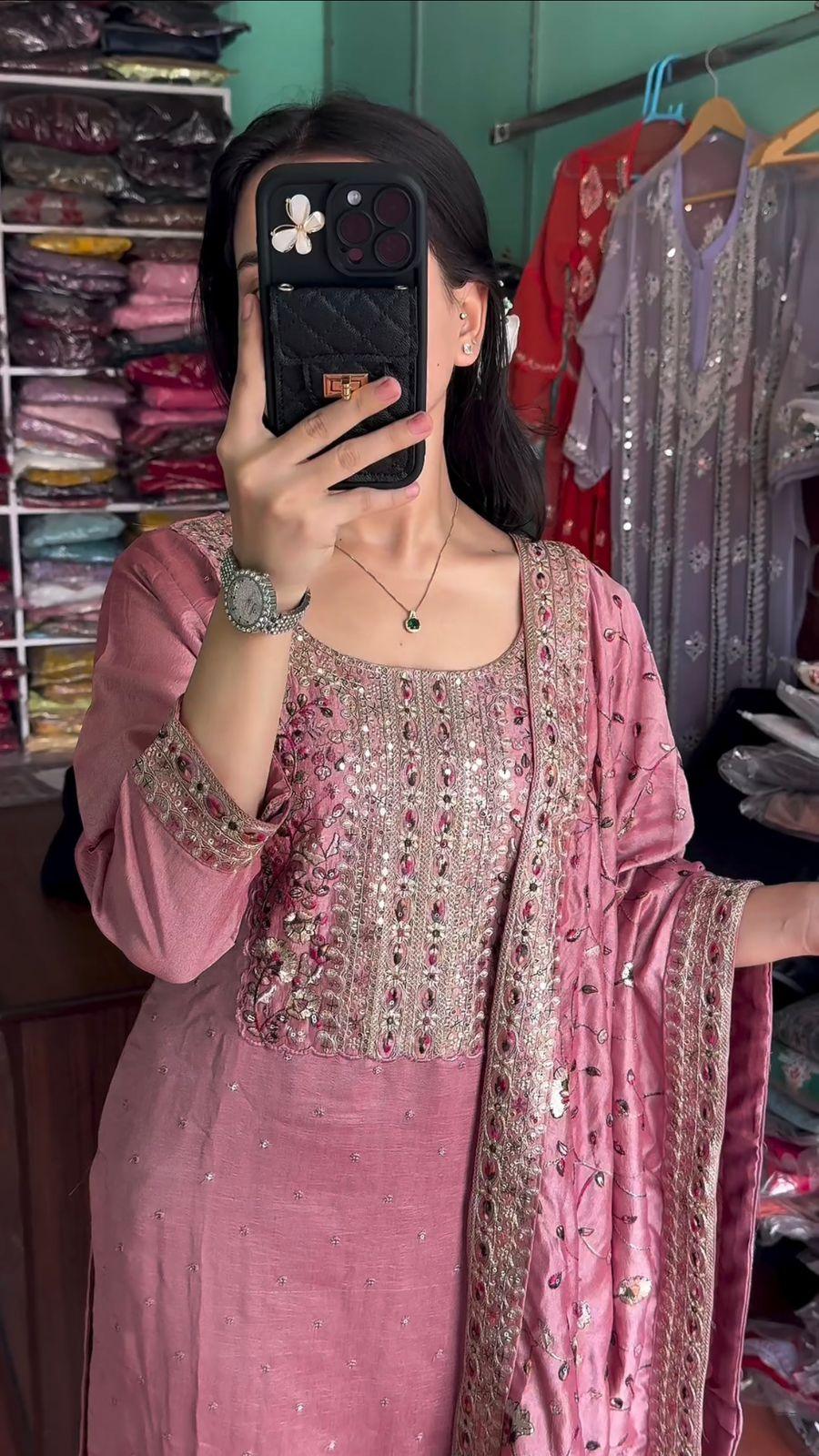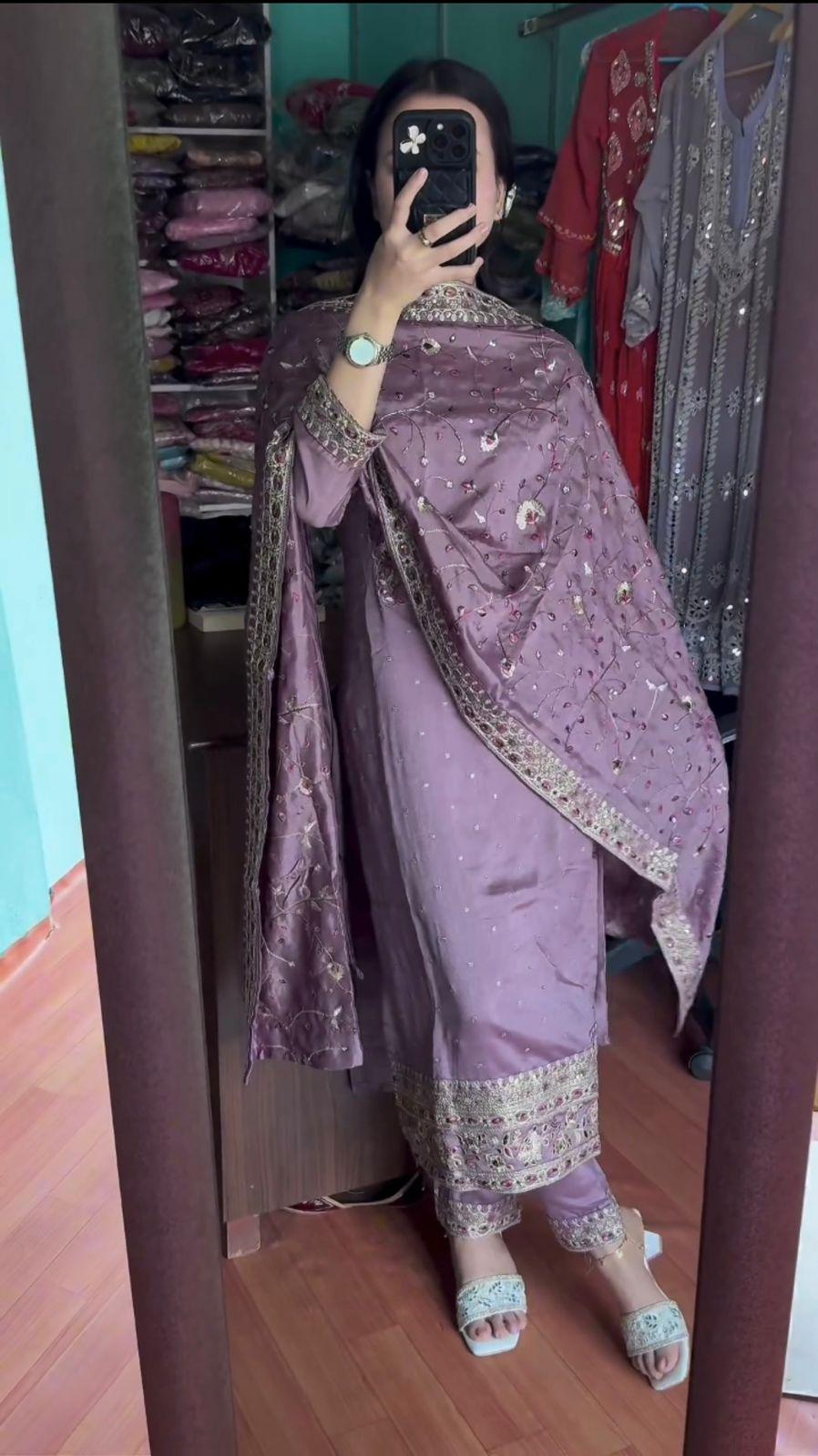 This stunning palazzo suit is made from heavy Vichitra silk, featuring intricate embroidery work and a beautiful pink and purple color scheme. The top, palazzo, and dupatta are all made from high-quality Vichitra silk, ensuring a luxurious and comfortable fit. Elevate your style with this elegant ensemble.