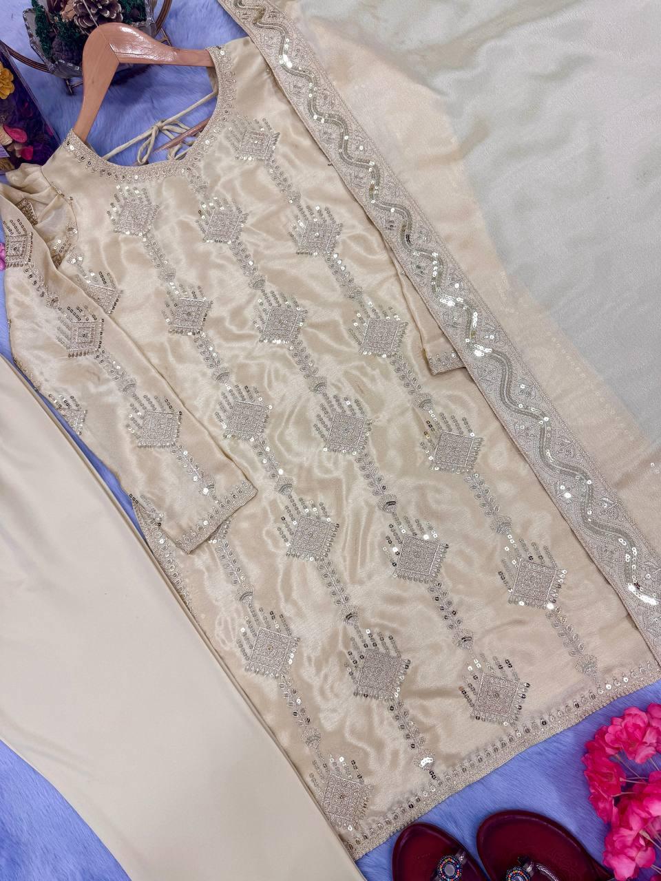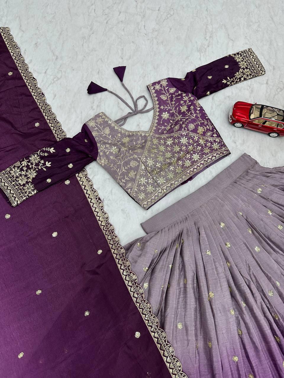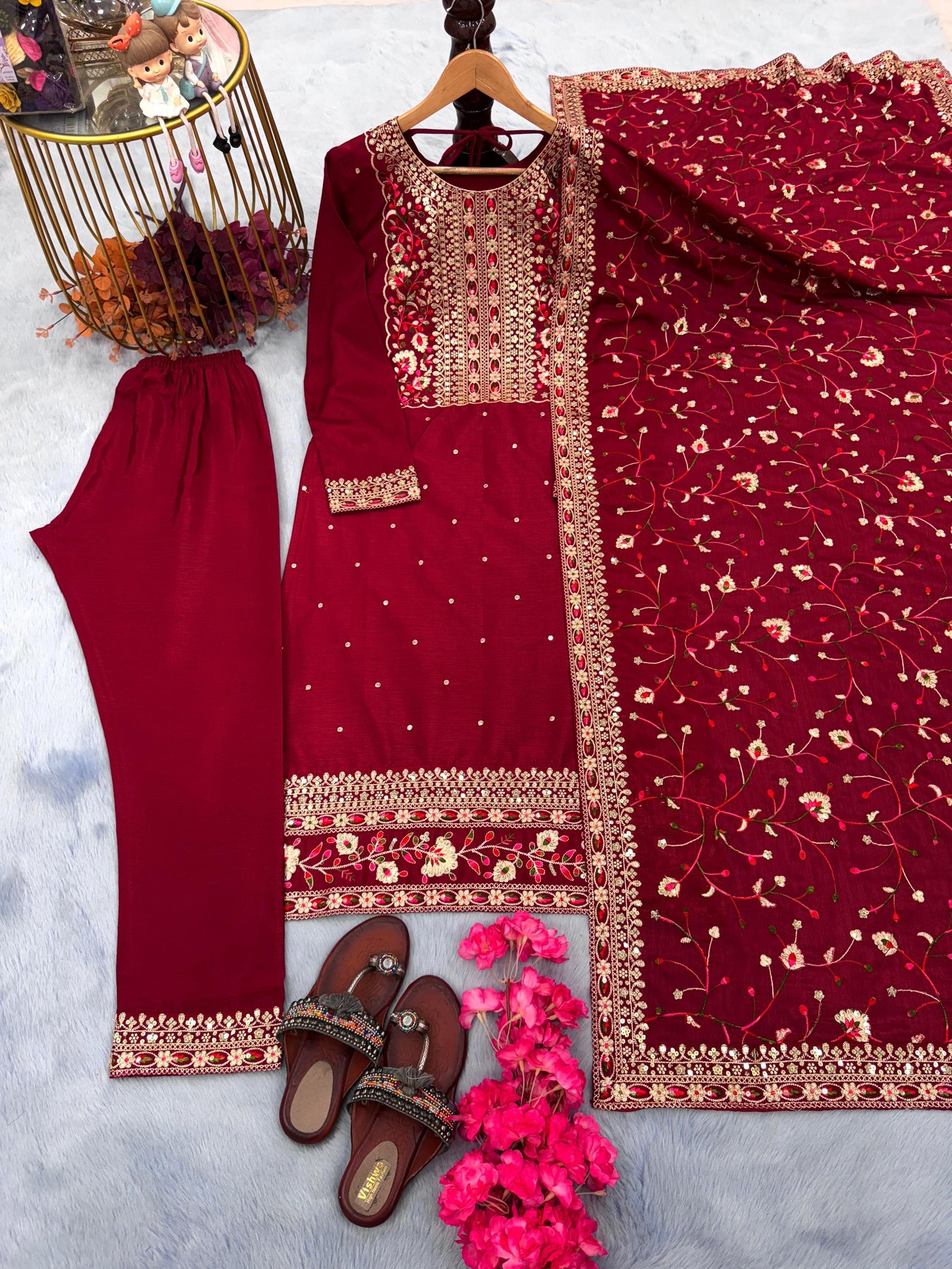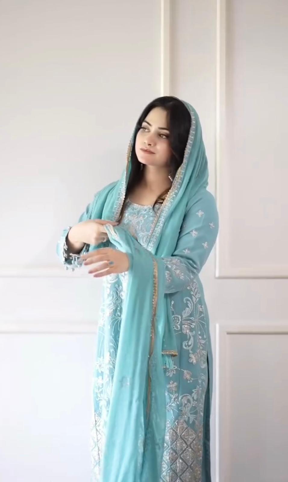 This stunning palazzo suit is made from heavy Vichitra silk, featuring intricate embroidery work and a beautiful pink and purple color scheme. The top, palazzo, and dupatta are all made from high-quality Vichitra silk, ensuring a luxurious and comfortable fit. Elevate your style with this elegant ensemble.