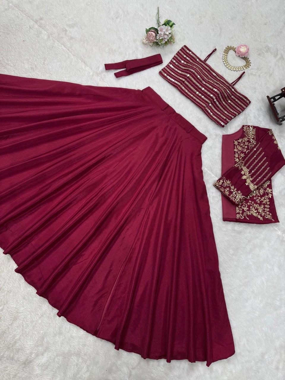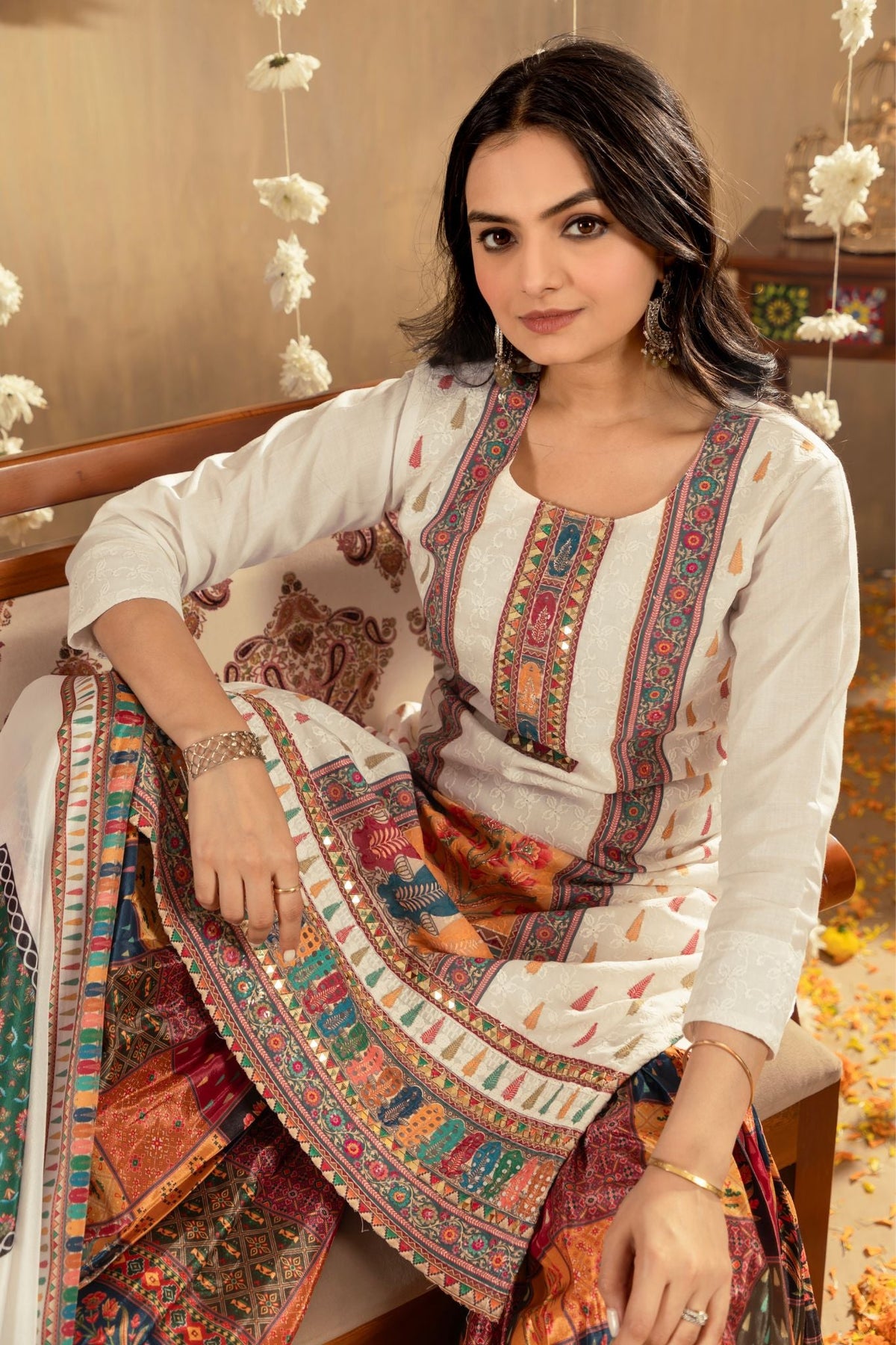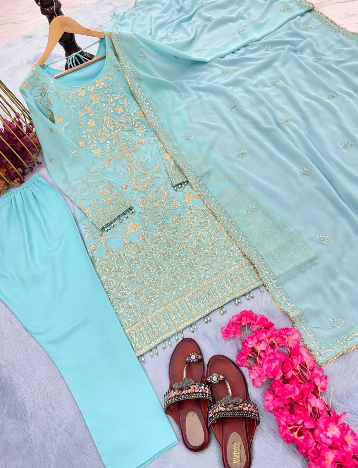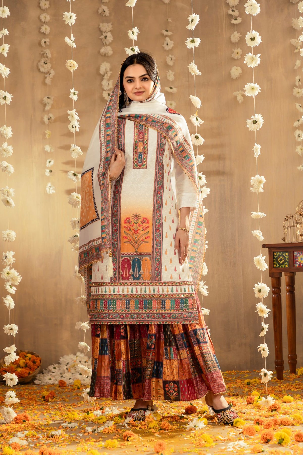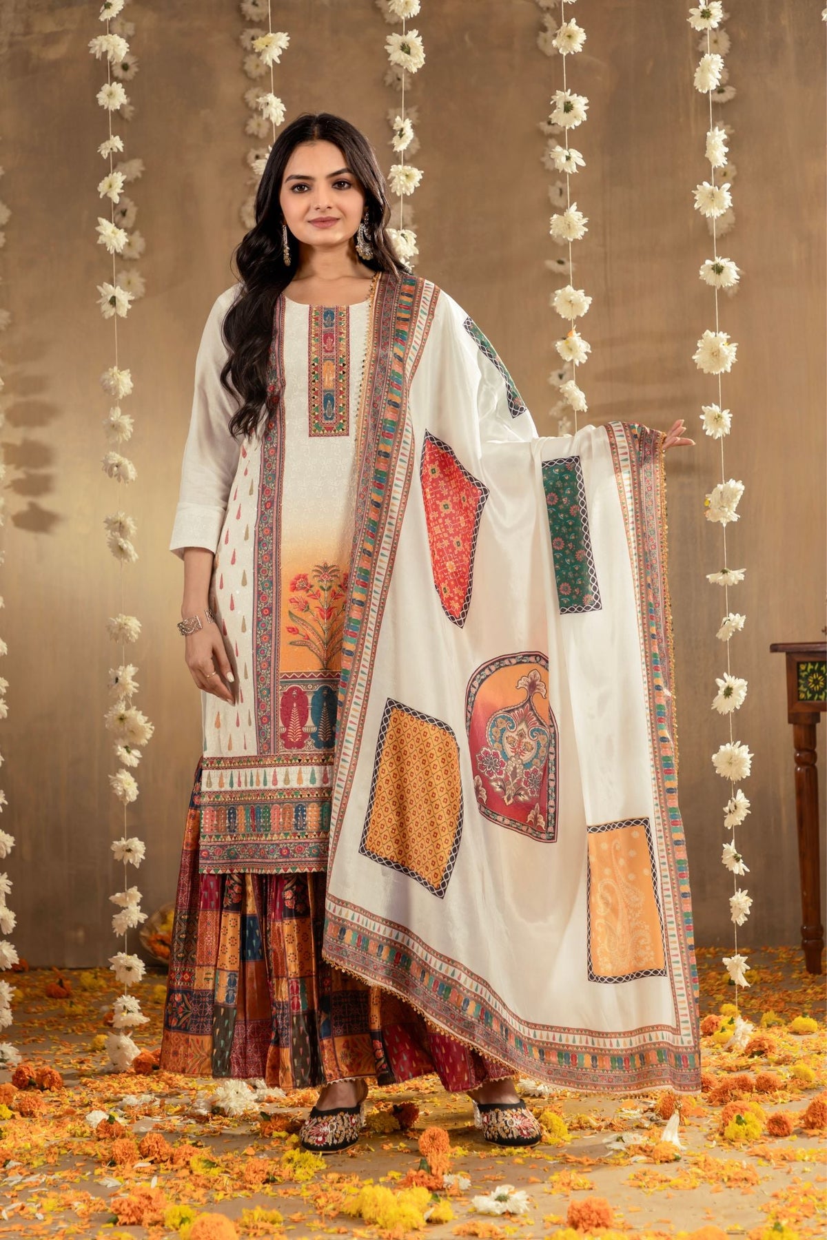 This stunning palazzo suit is made from heavy Vichitra silk, featuring intricate embroidery work and a beautiful pink and purple color scheme. The top, palazzo, and dupatta are all made from high-quality Vichitra silk, ensuring a luxurious and comfortable fit. Elevate your style with this elegant ensemble.