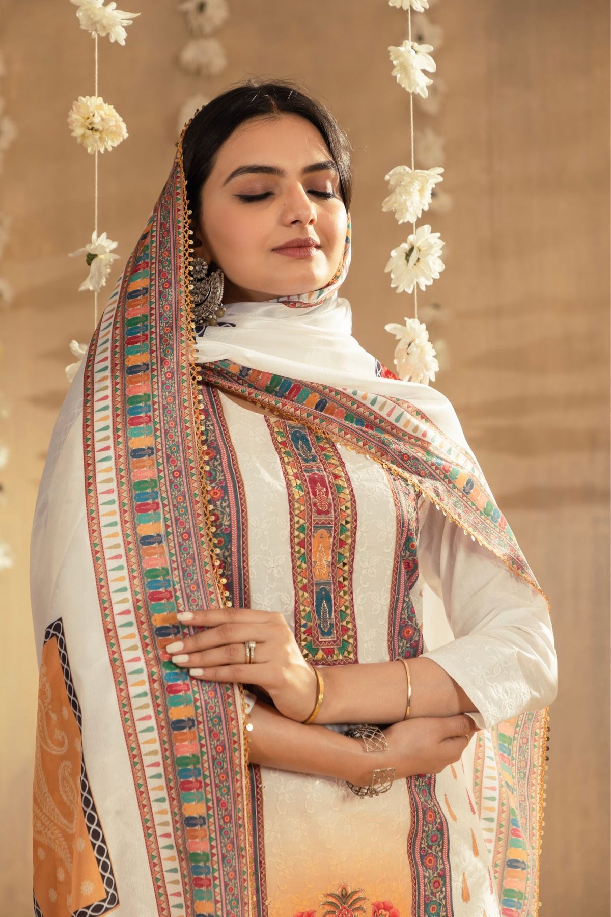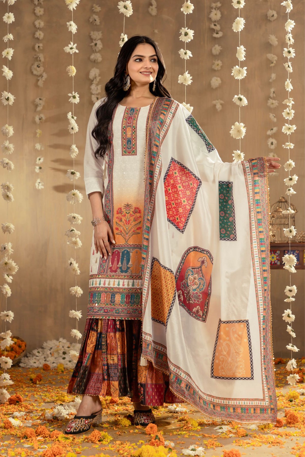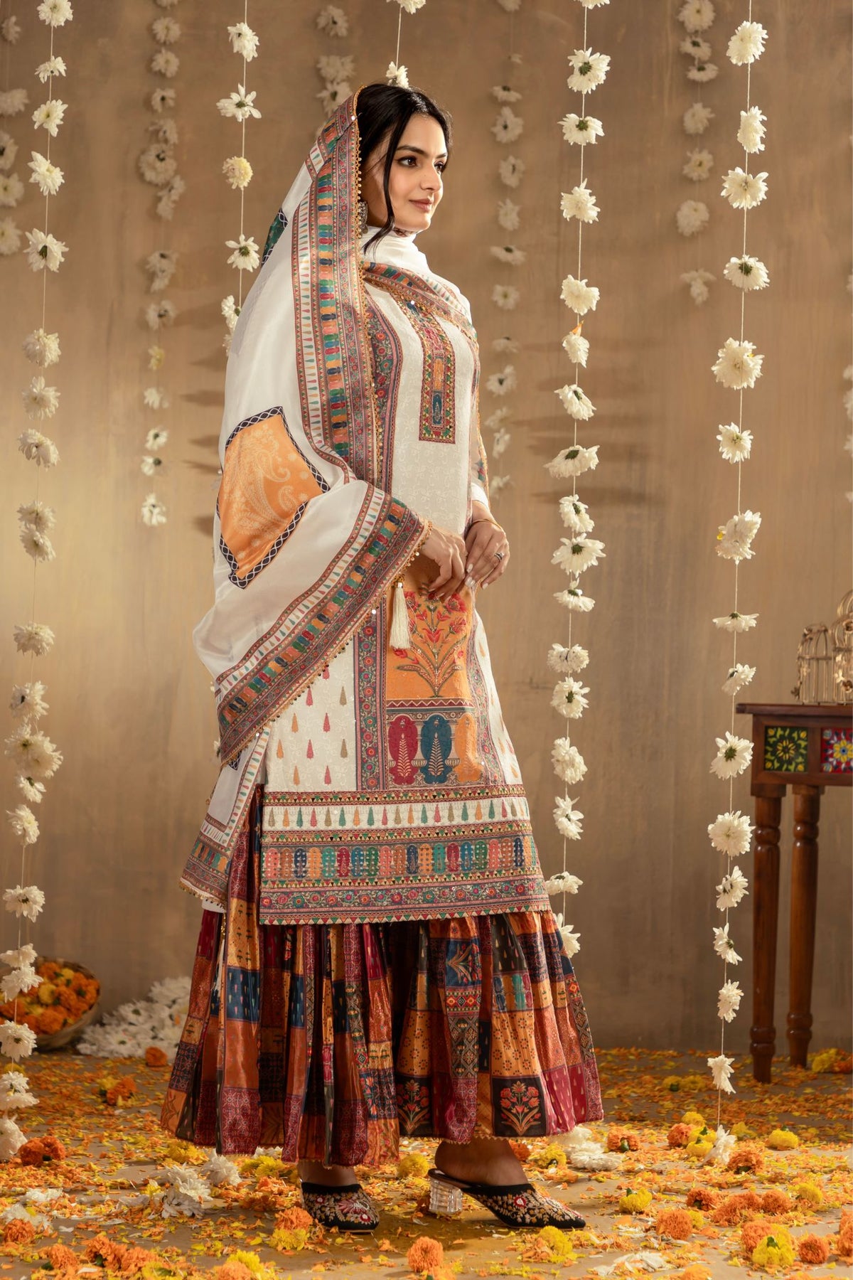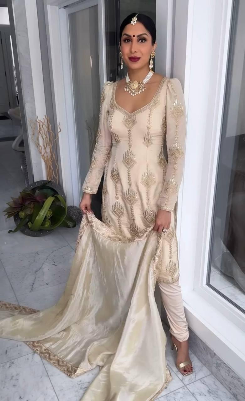 This stunning palazzo suit is made from heavy Vichitra silk, featuring intricate embroidery work and a beautiful pink and purple color scheme. The top, palazzo, and dupatta are all made from high-quality Vichitra silk, ensuring a luxurious and comfortable fit. Elevate your style with this elegant ensemble.