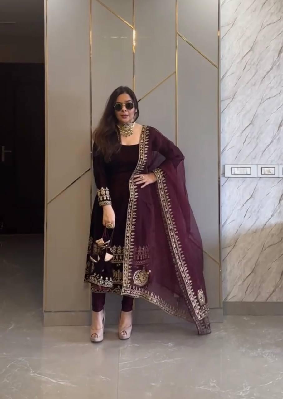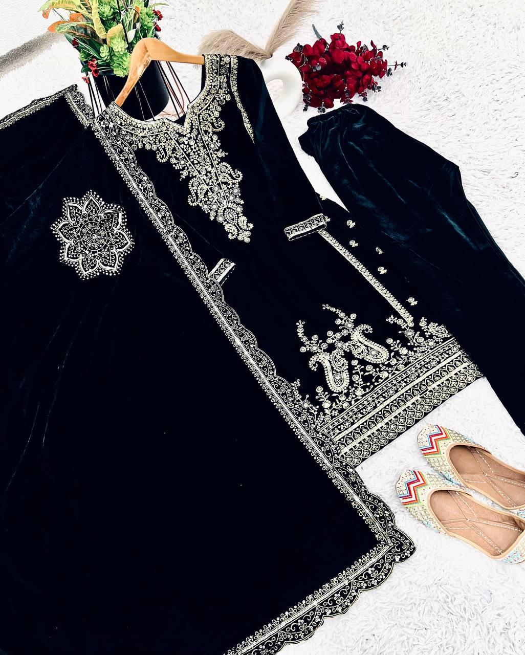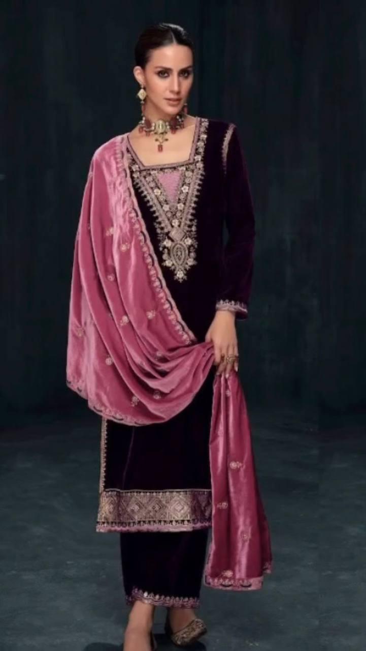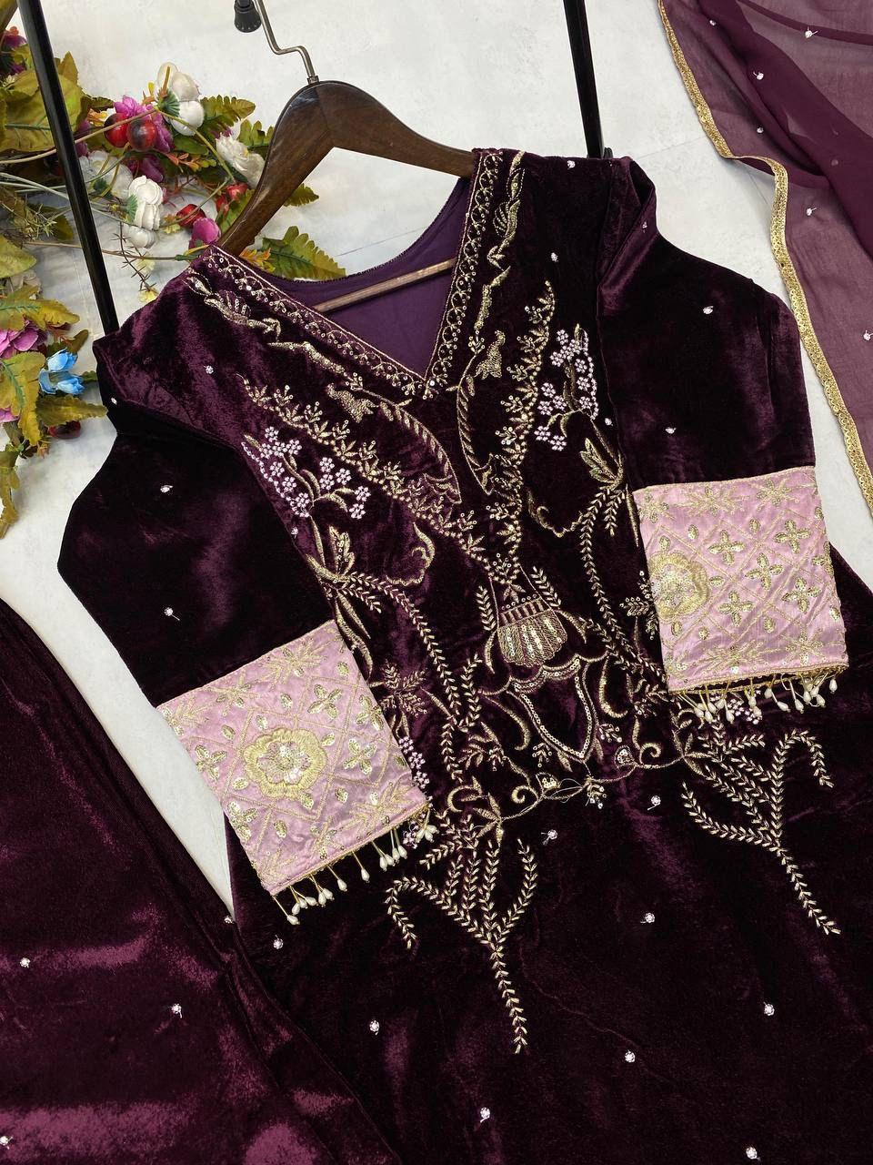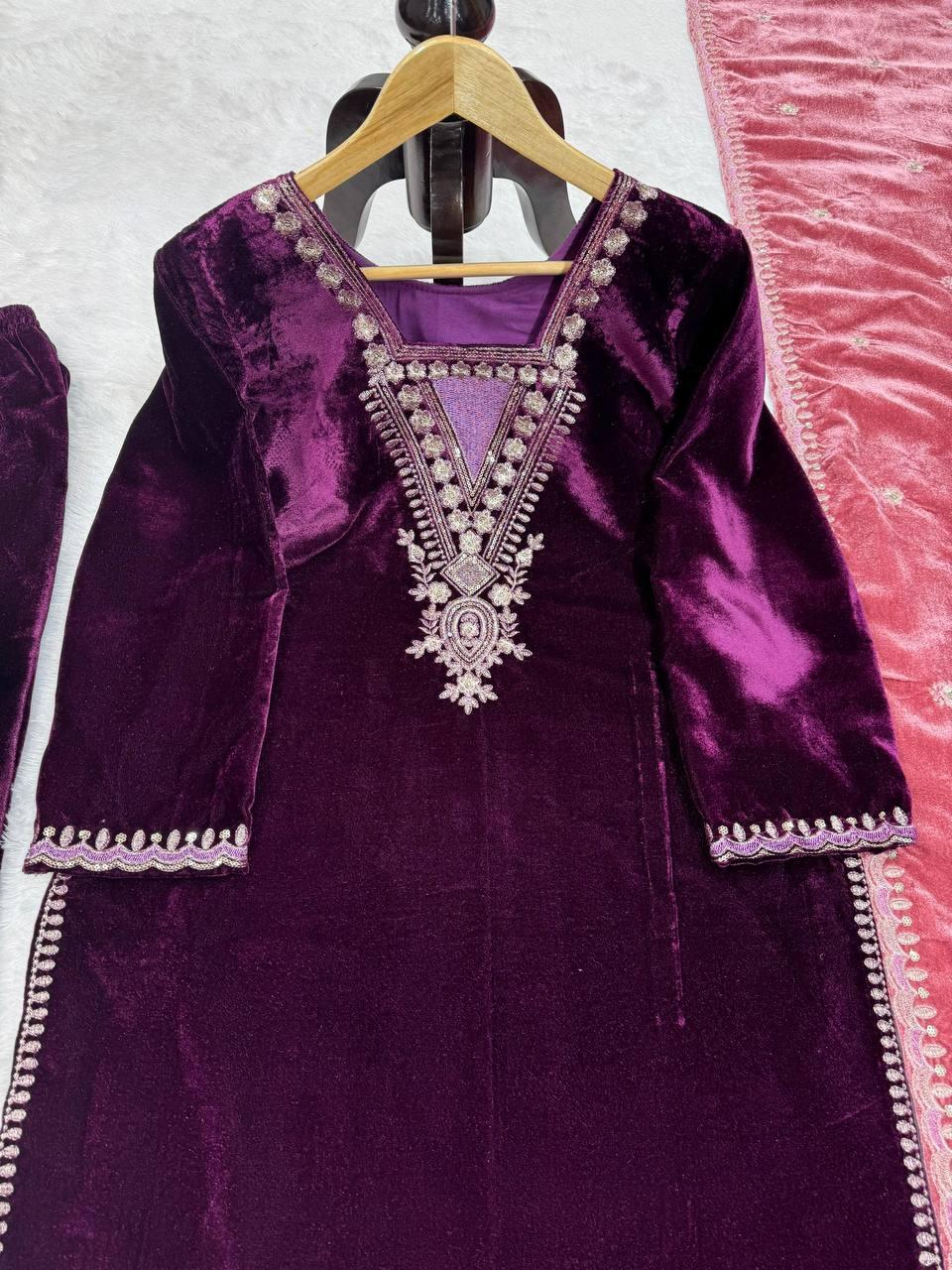 Traditional wear Purple Color Velvet Embroidery Work Salwar Suit
