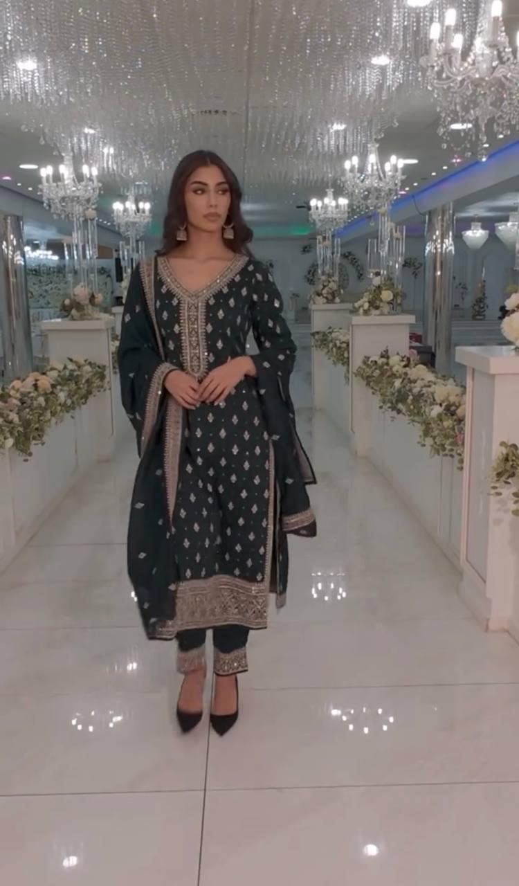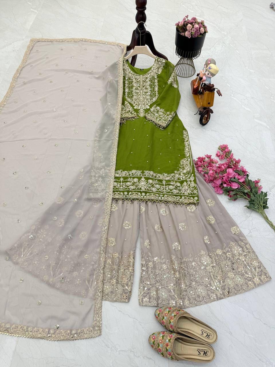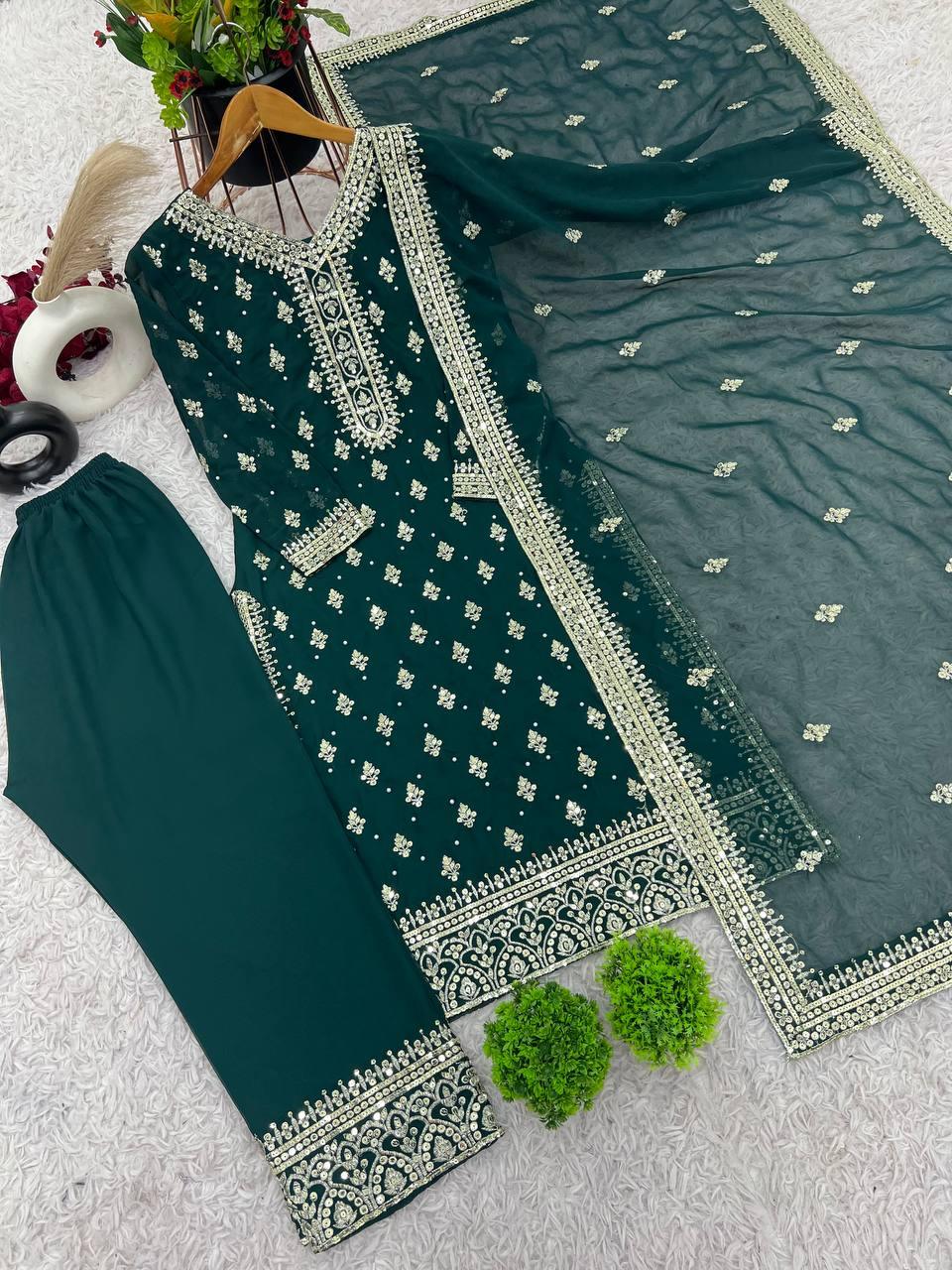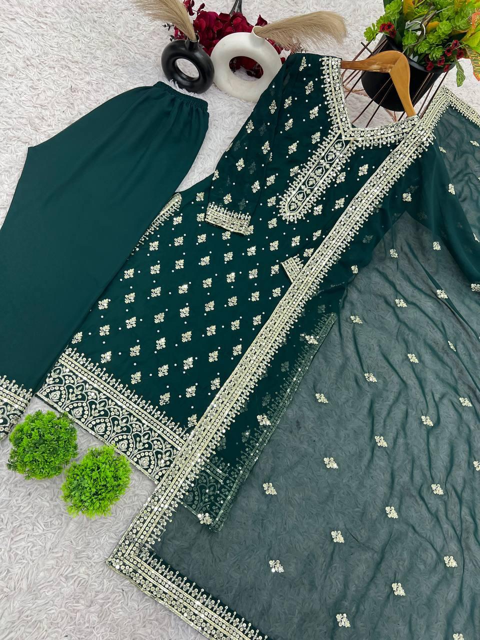 Marvelous Sequence Work Green Color Top Bottom With Dupatta