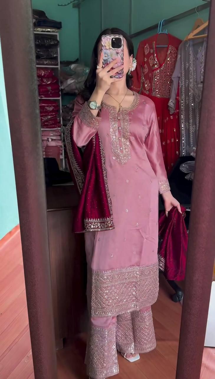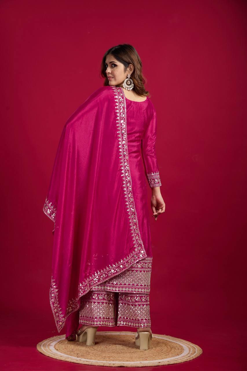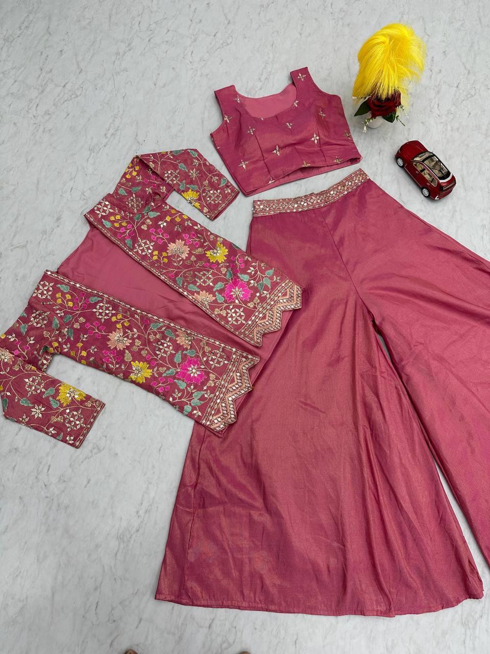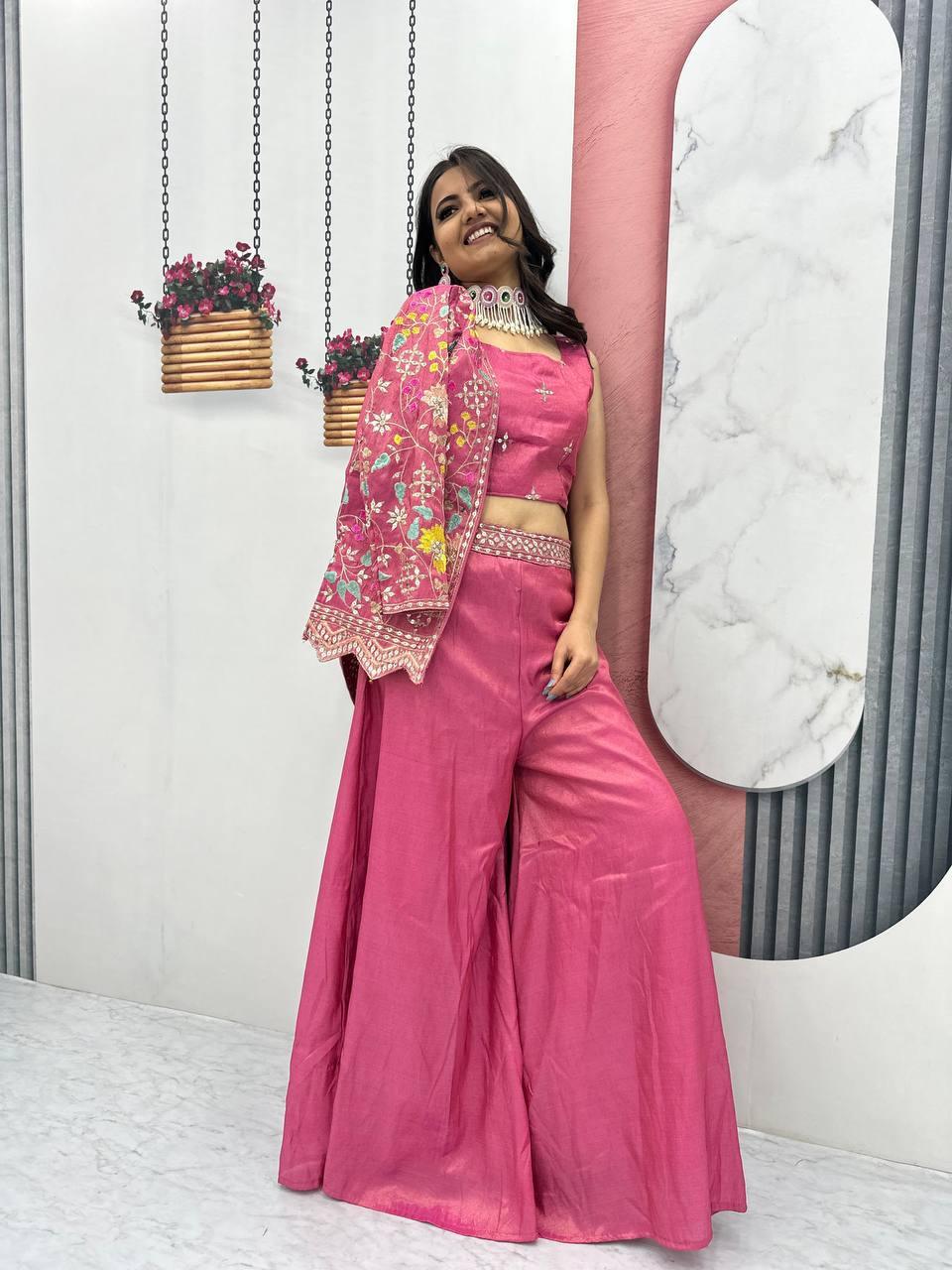 Glorious Tissue Simmer Pink Color Palazzo Suit With Shrug