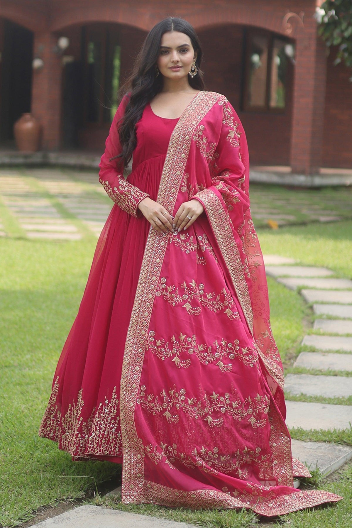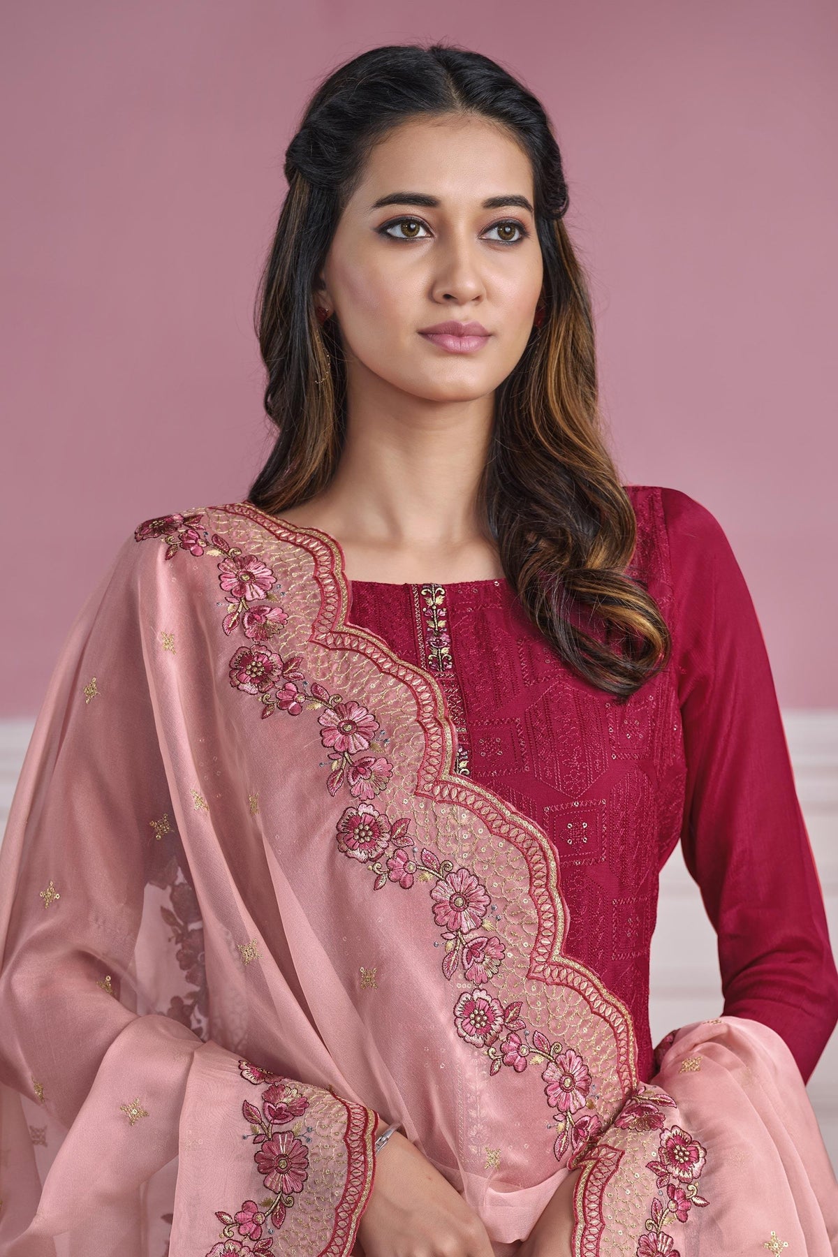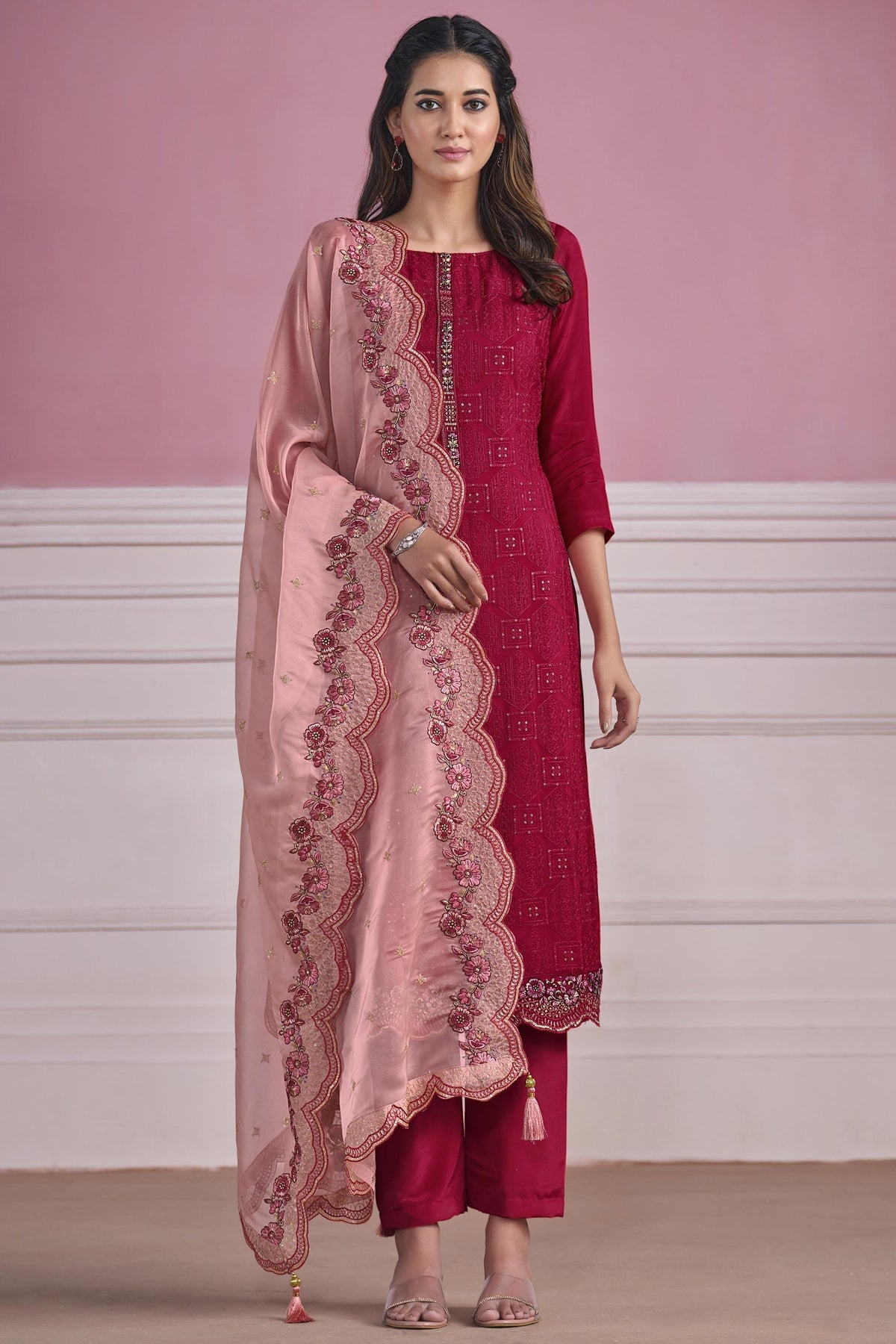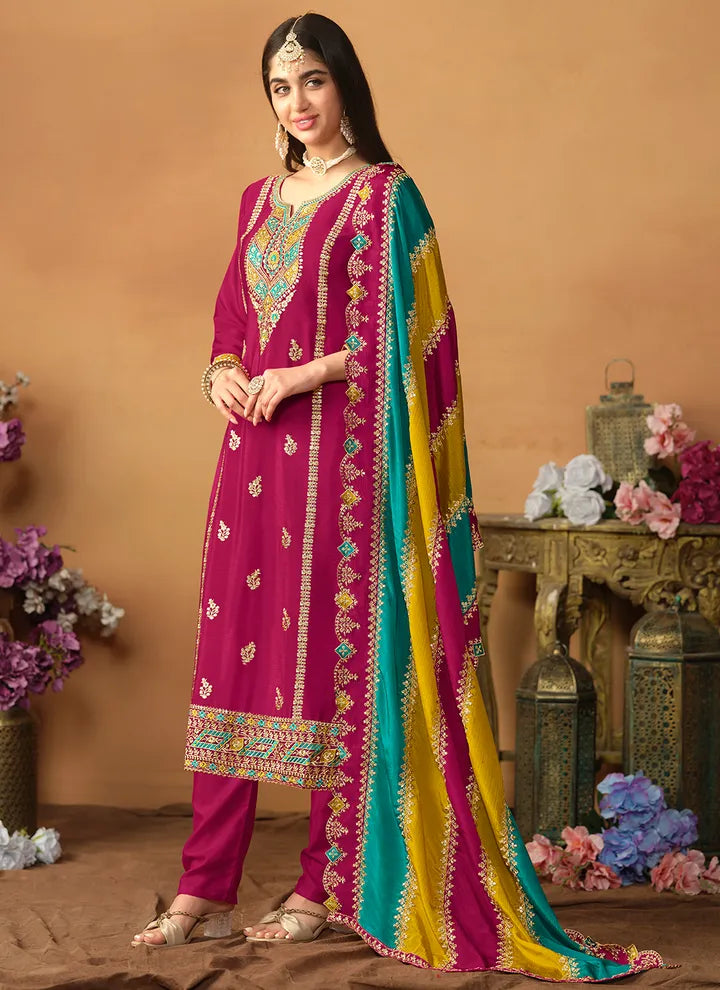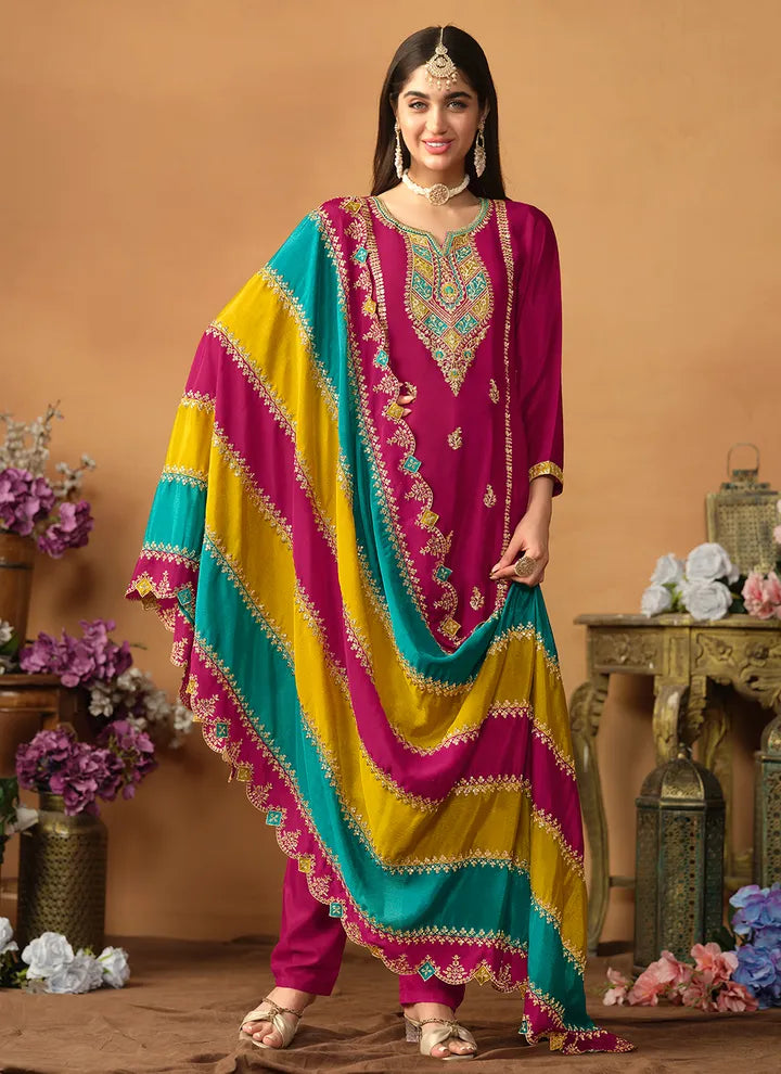 Rani Color Festive Wear Embroidered Straight Cut Salwar Suit In Chiffon Fabric