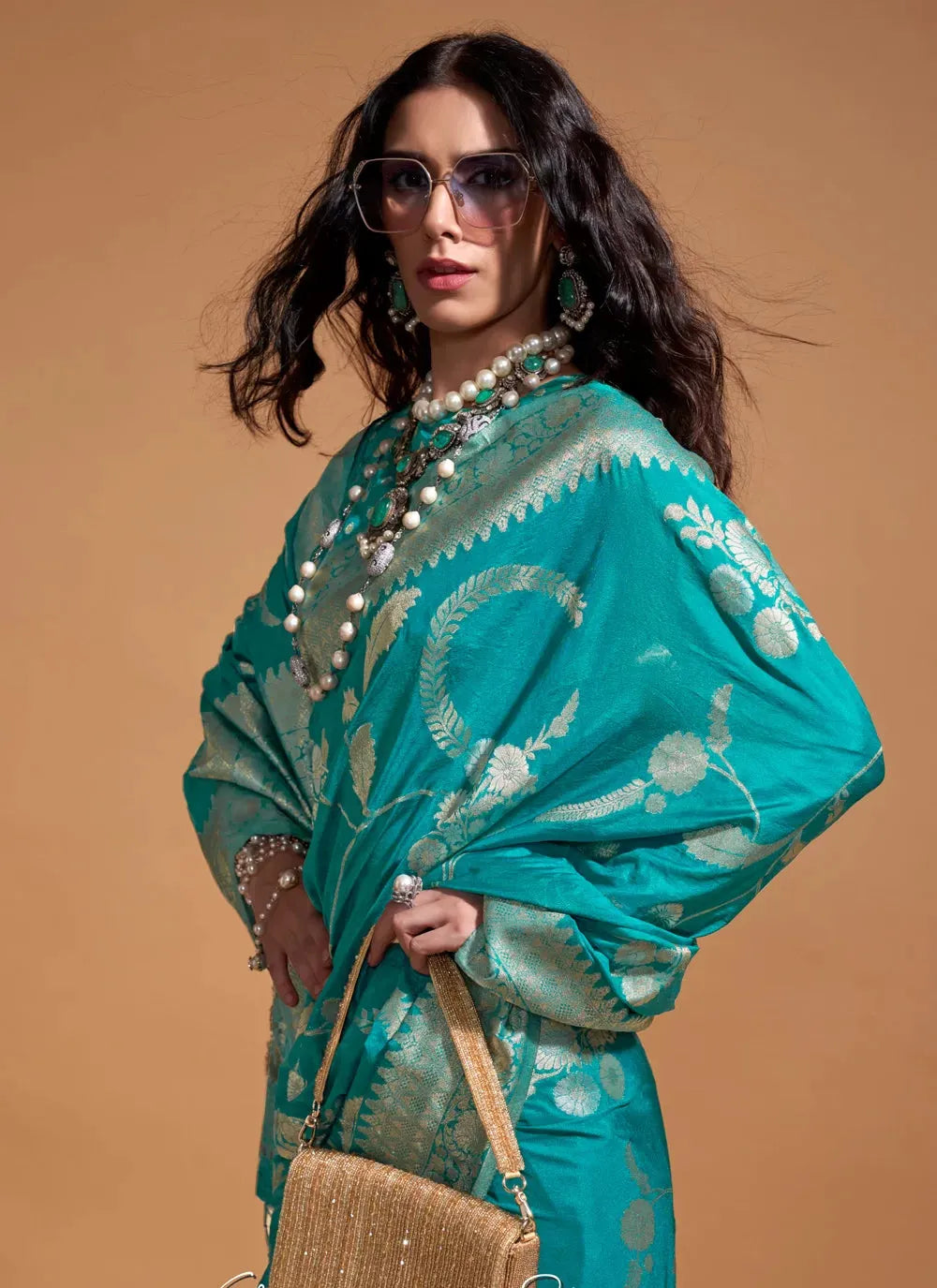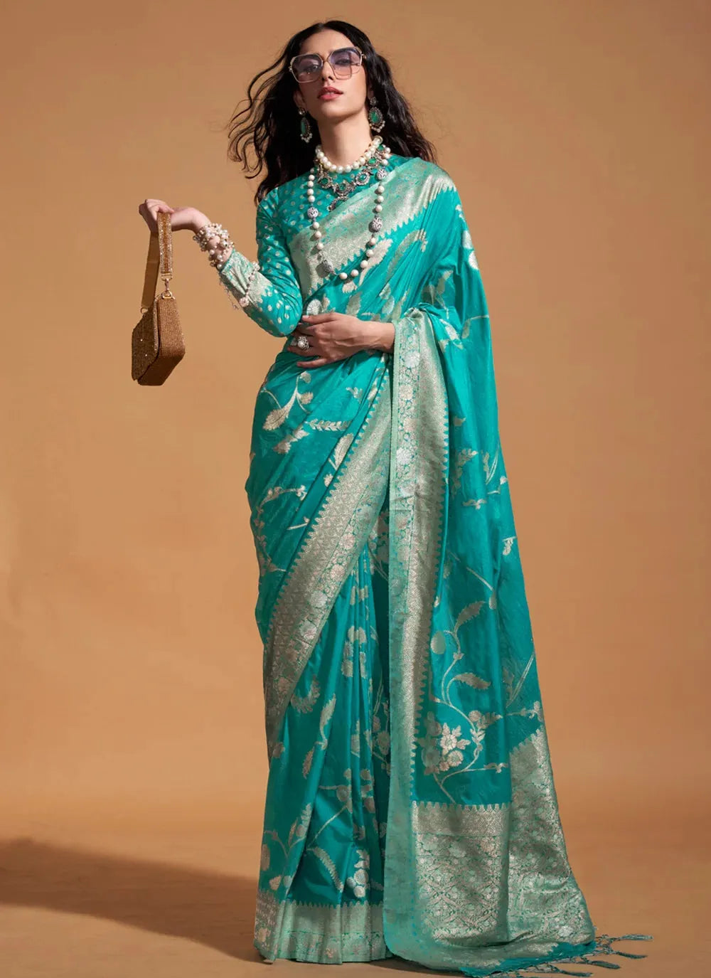 Experience the luxurious elegance of our Classic Designer Hand Woven Turquoise Silk Saree. Made from pure silk and handloom weaving, this saree boasts a stunning turquoise color that is sure to turn heads. The heavy blouse adds a touch of opulence to this timeless piece. Elevate your style with this exquisite saree.