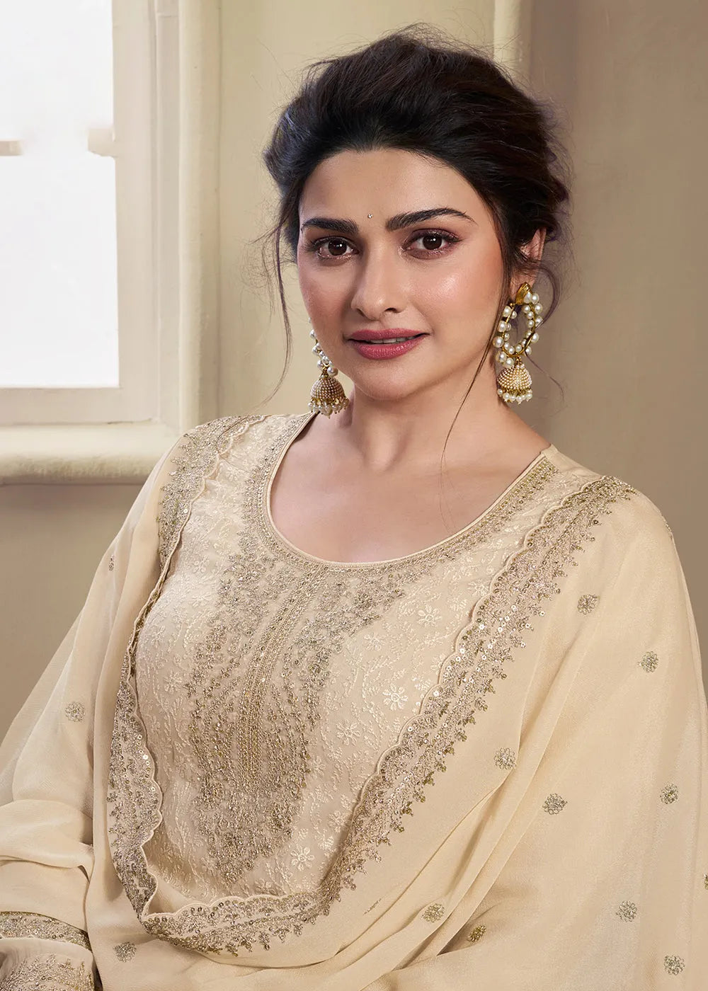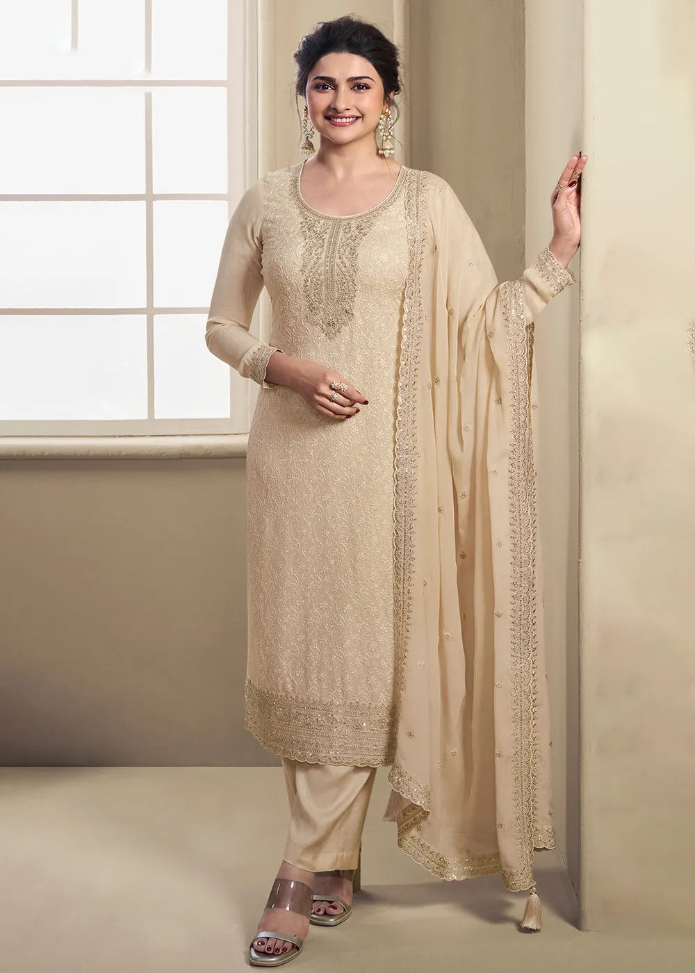 Cream Colored Organza Schiffli Embroidered Designer Suit