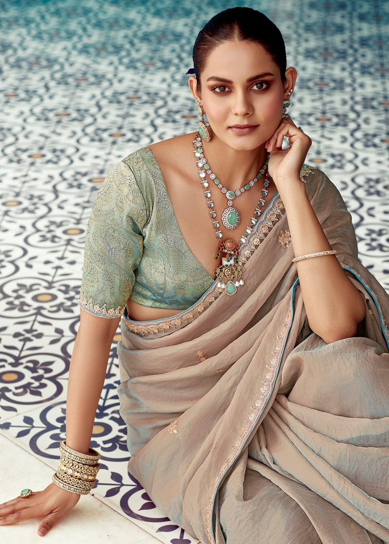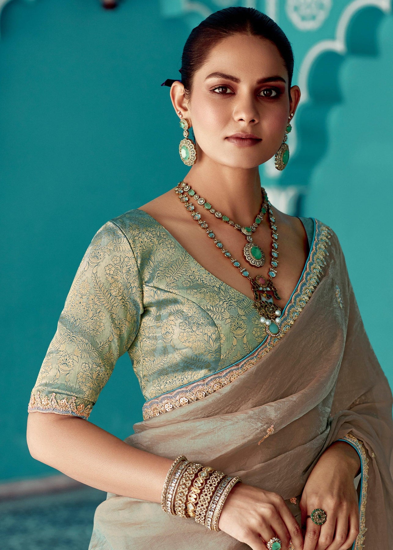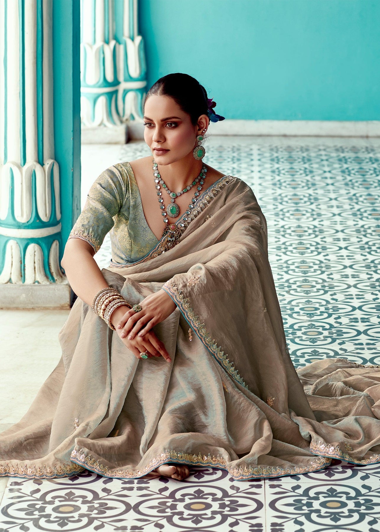 Crystal Grey Designer Embroidered Silk Saree With Contrast Blouse
