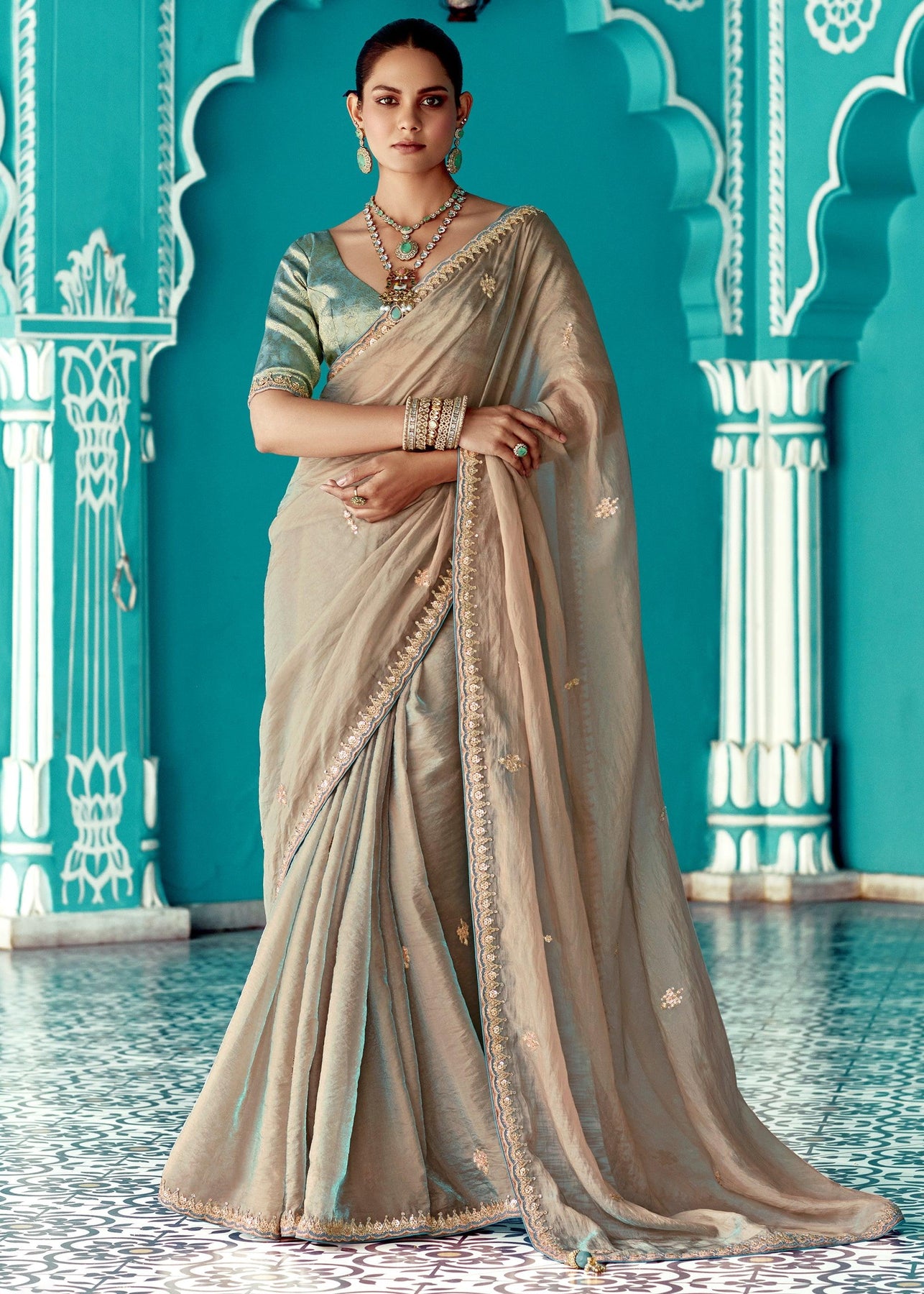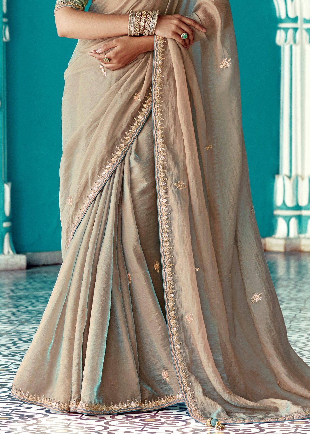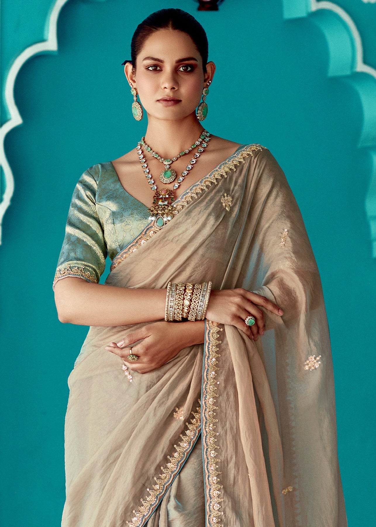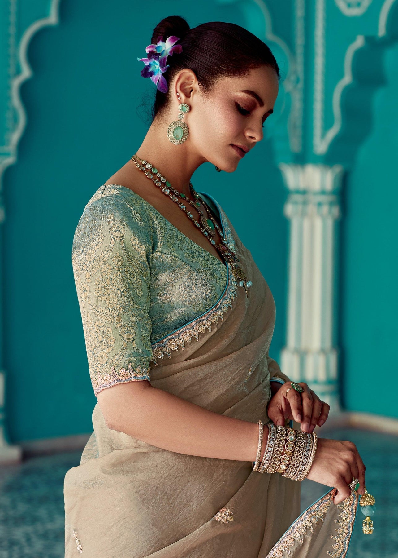 Crystal Grey Designer Embroidered Silk Saree With Contrast Blouse