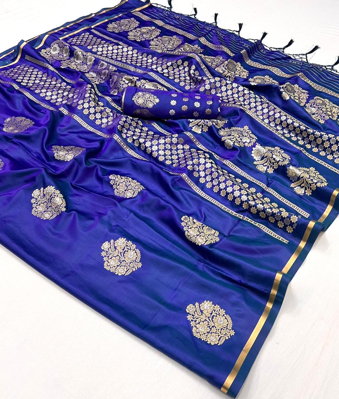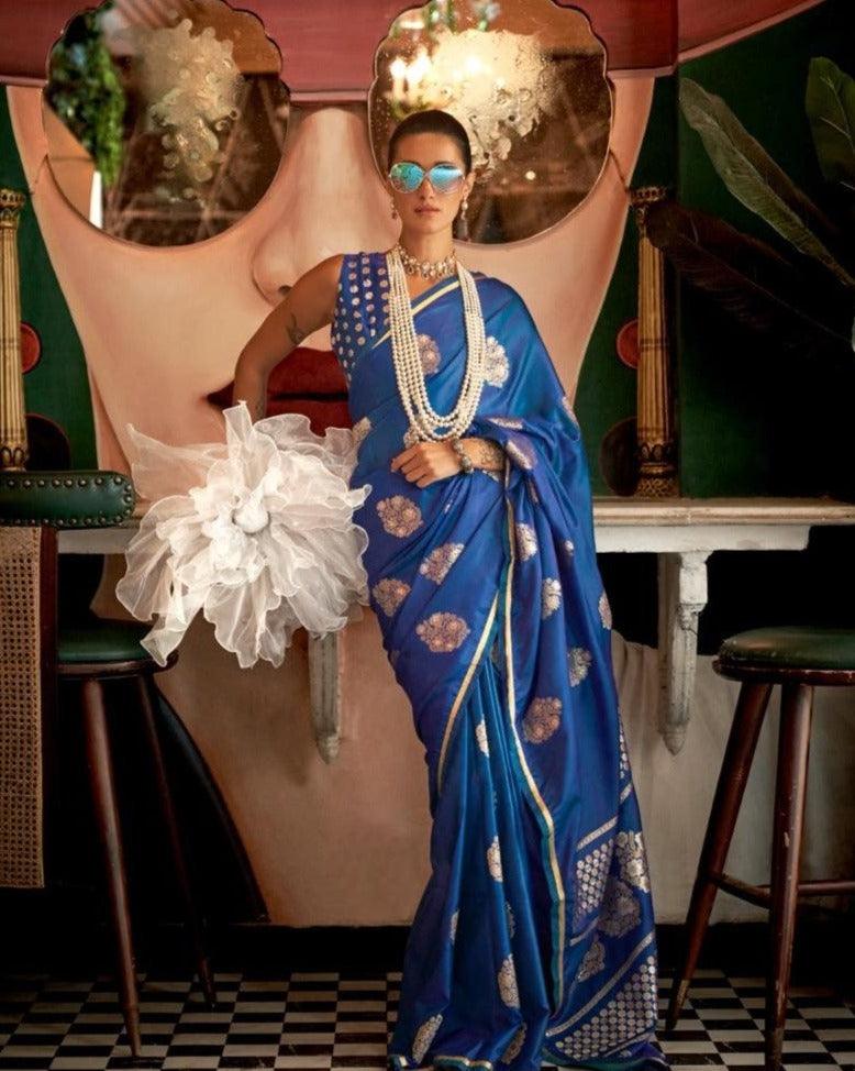 Denim Blue Designer Pure Satin Weaving Event Wear Silk Saree