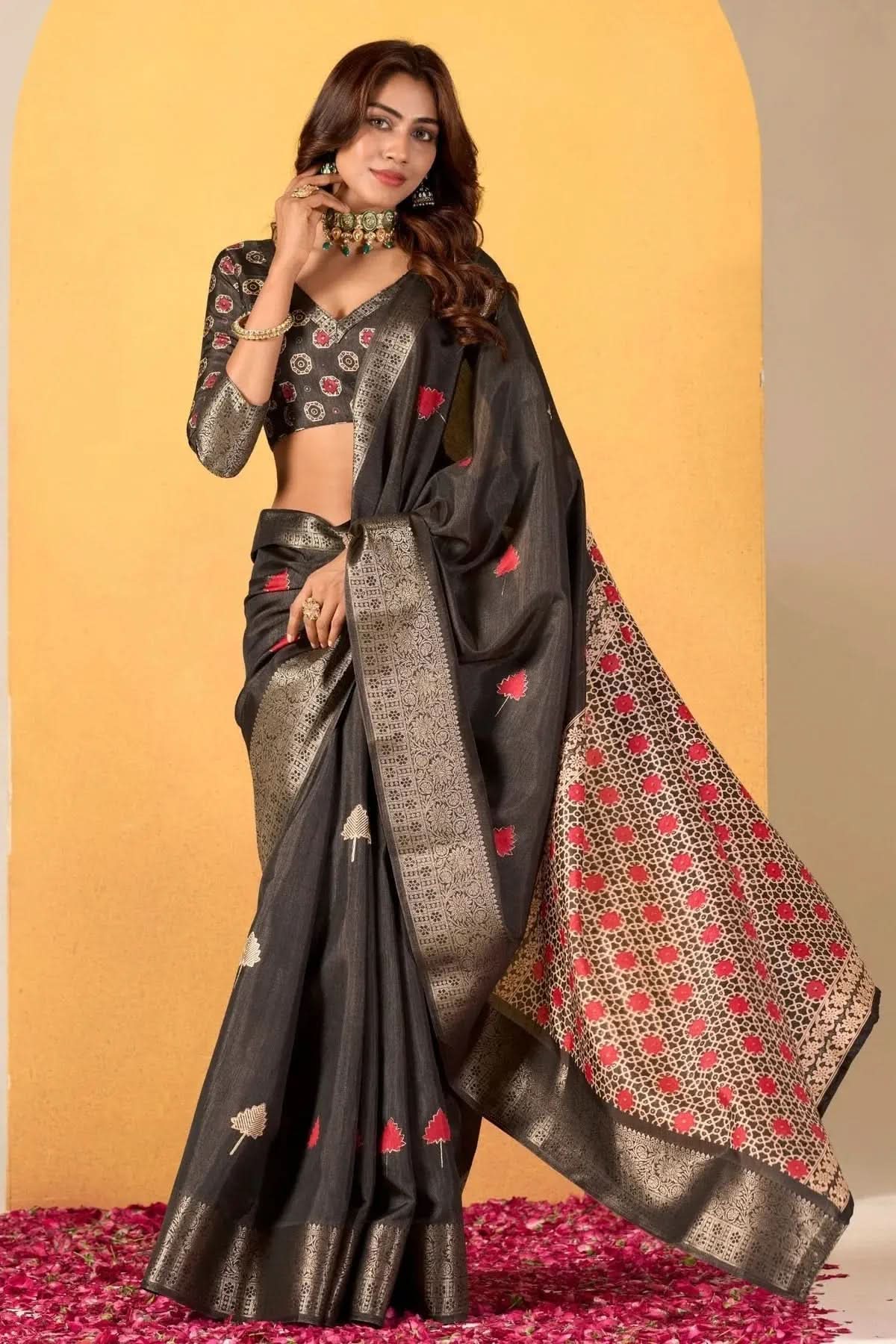 This elegant black saree is made of soft dola silk, with a delicate foil print and dusty color matching. Its intricate woven pattern adds a touch of sophistication and charm. The soft dola silk fabric of the blouse completes the look, making it comfortable and stylish.