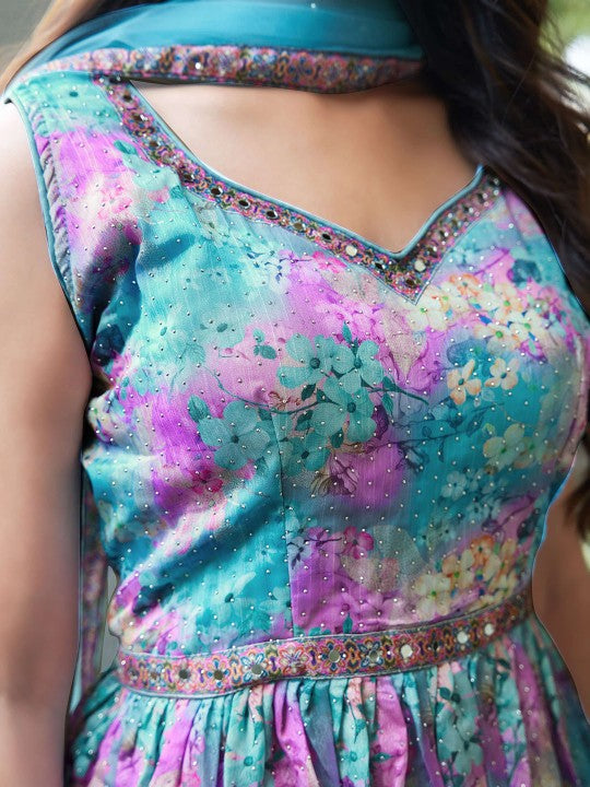 Experience elegance and style with our Enchanting Aqua Blue Floral Printed Chiffon Palazzo Suit. The chiffon crop top features beautiful floral embroidery, while the full flared palazzo adds a trendy touch. The net dupatta completes the look with delicate embroidery. Perfect for any occasion.
