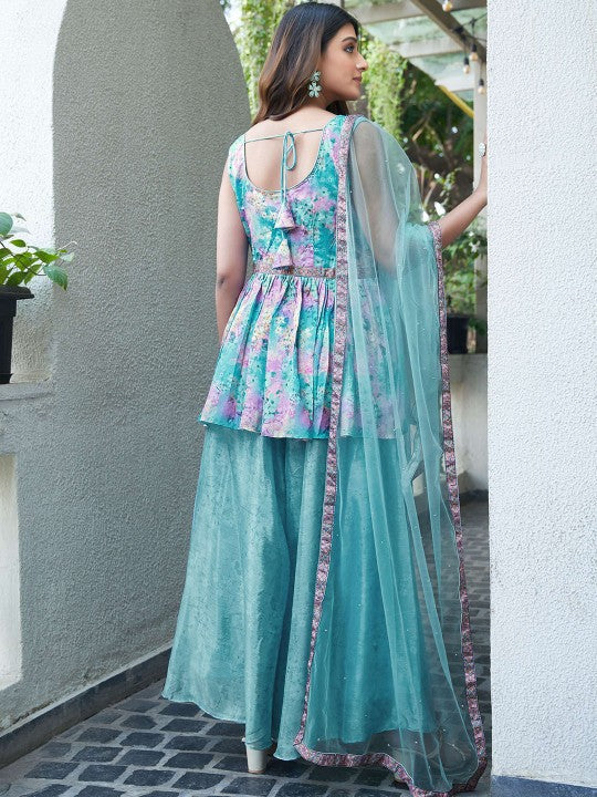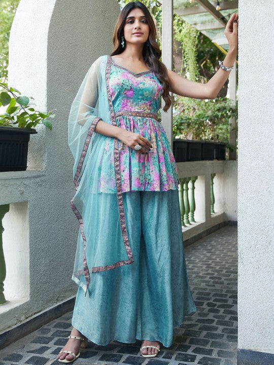 Enchanting Aqua Blue Floral Printed Chiffon Palazzo Suit