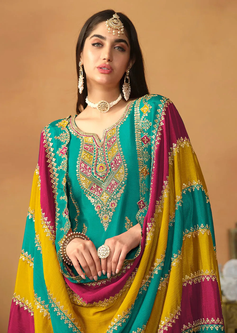 Glowing and Dazzling Chinon Silk Turquoise Salwar Suit