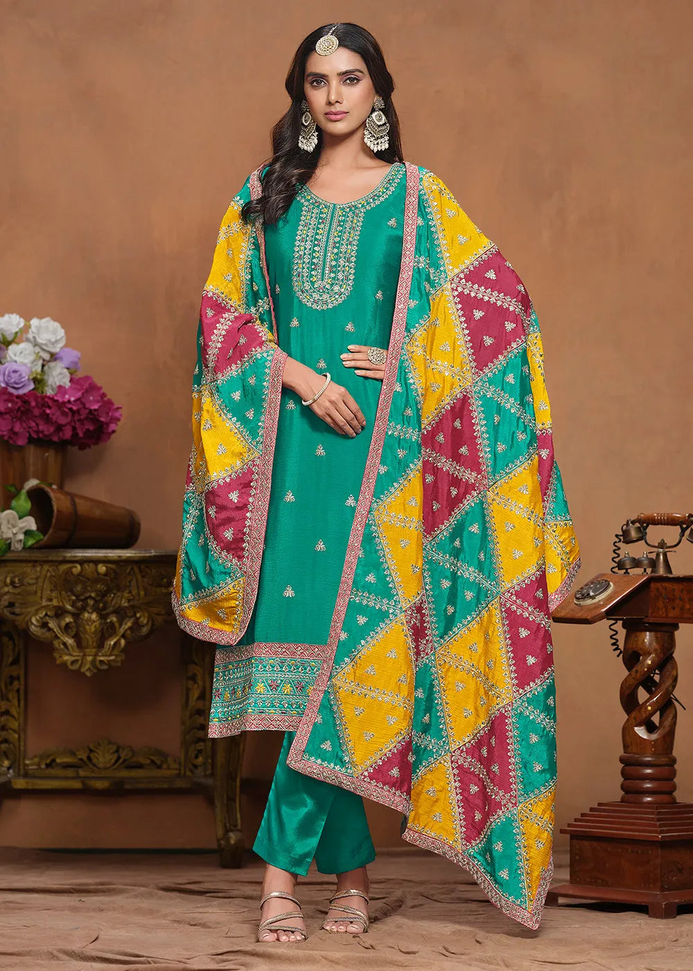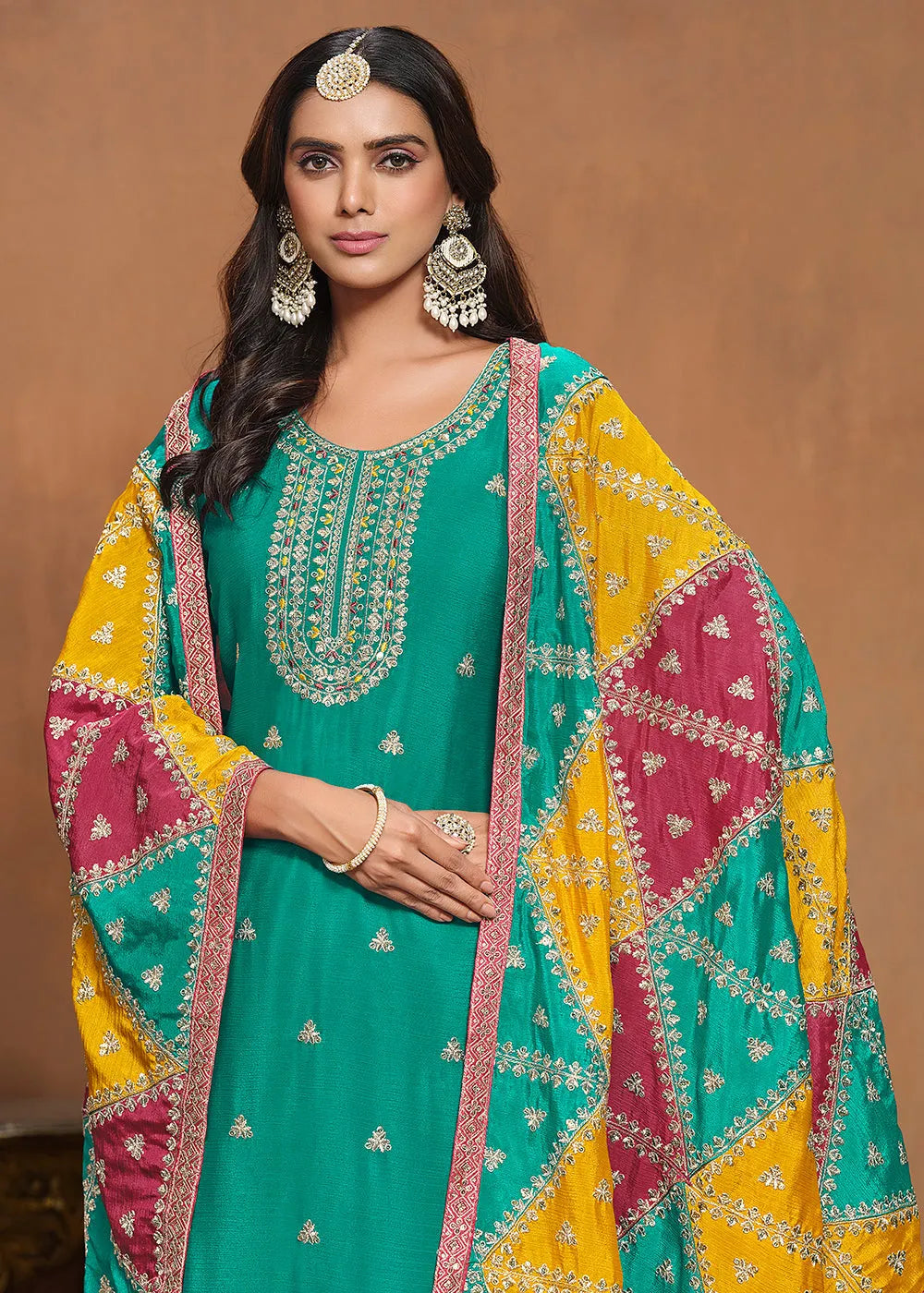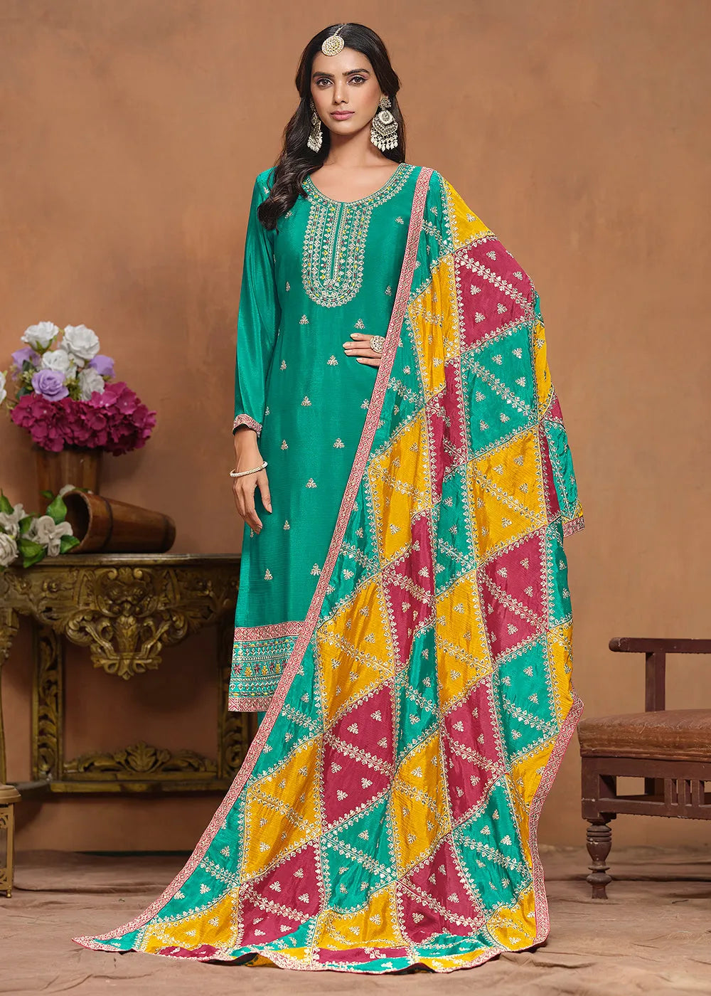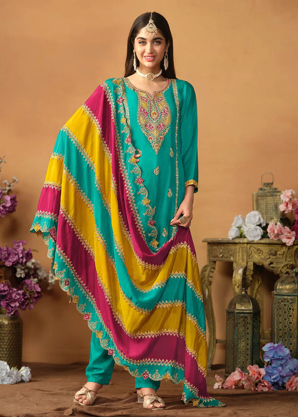 Expertly crafted, this Glowing and Dazzling Chinon Silk Tuquoise Salwar Suit boasts a top and dupatta made of luxurious Chinon Silk, with a soft and comfortable Santoon bottom. The striking triangle shape patchwork on the dupatta adds a unique touch to this stunning piece. Elevate your style with this elegant suit.