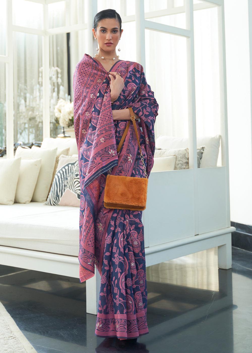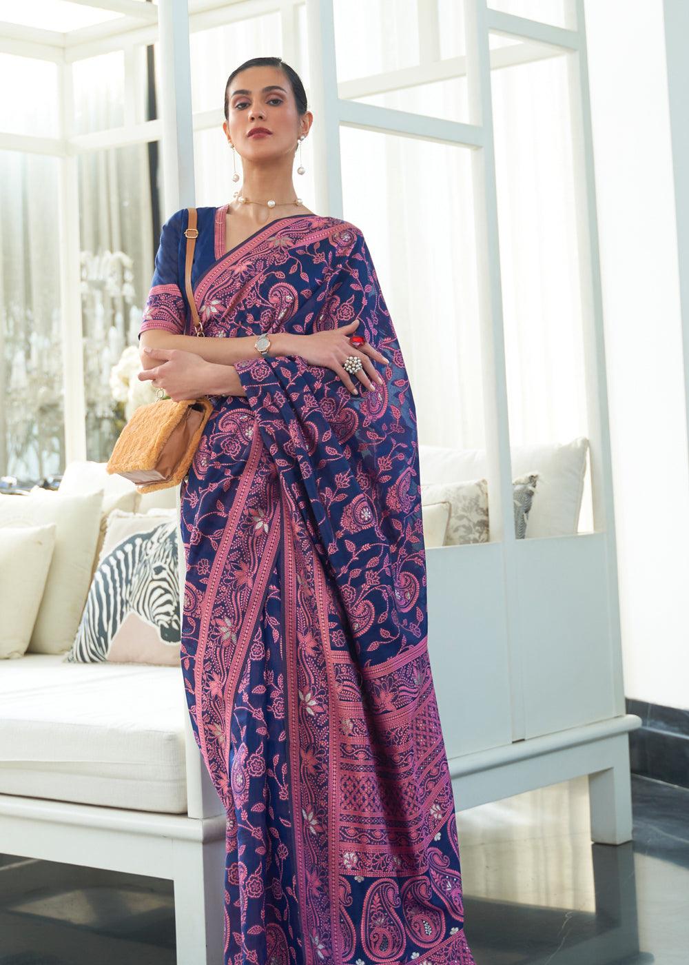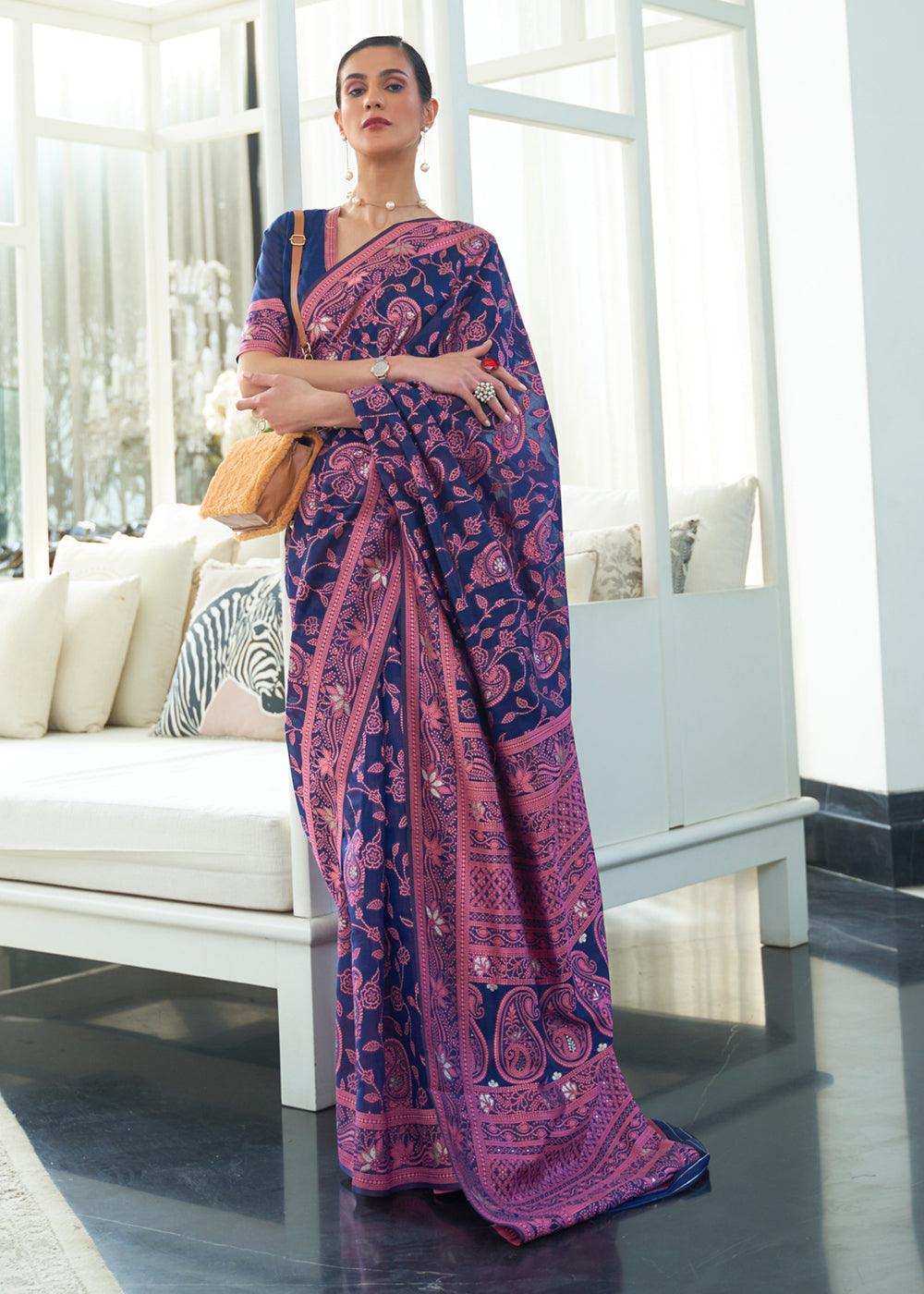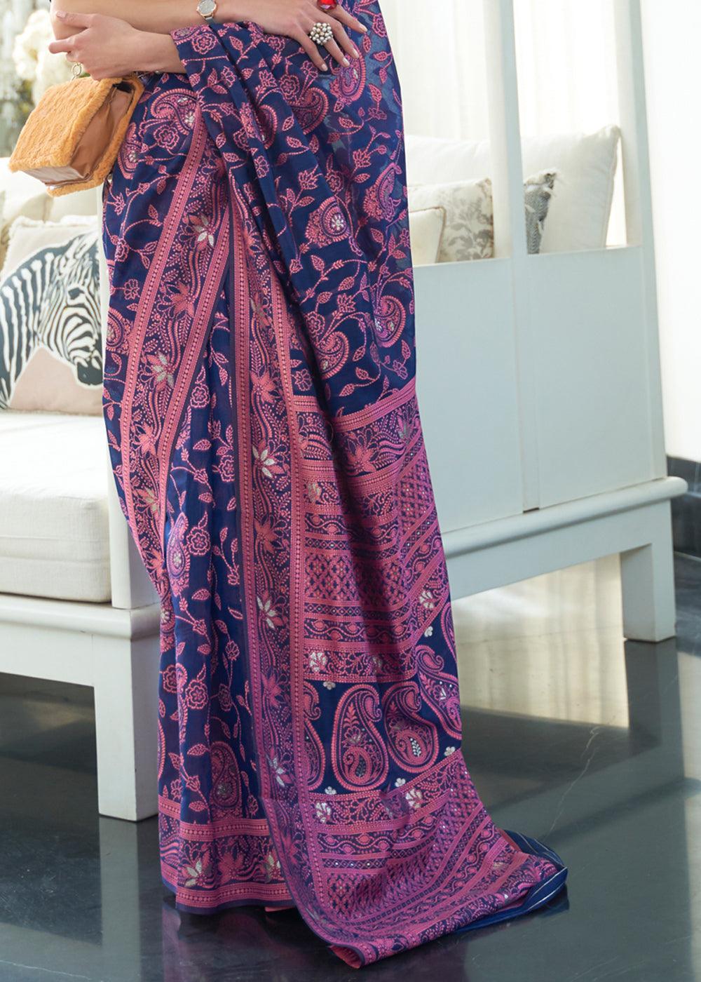 Indian Blue Lucknowi Chikankari Woven Silk Saree
