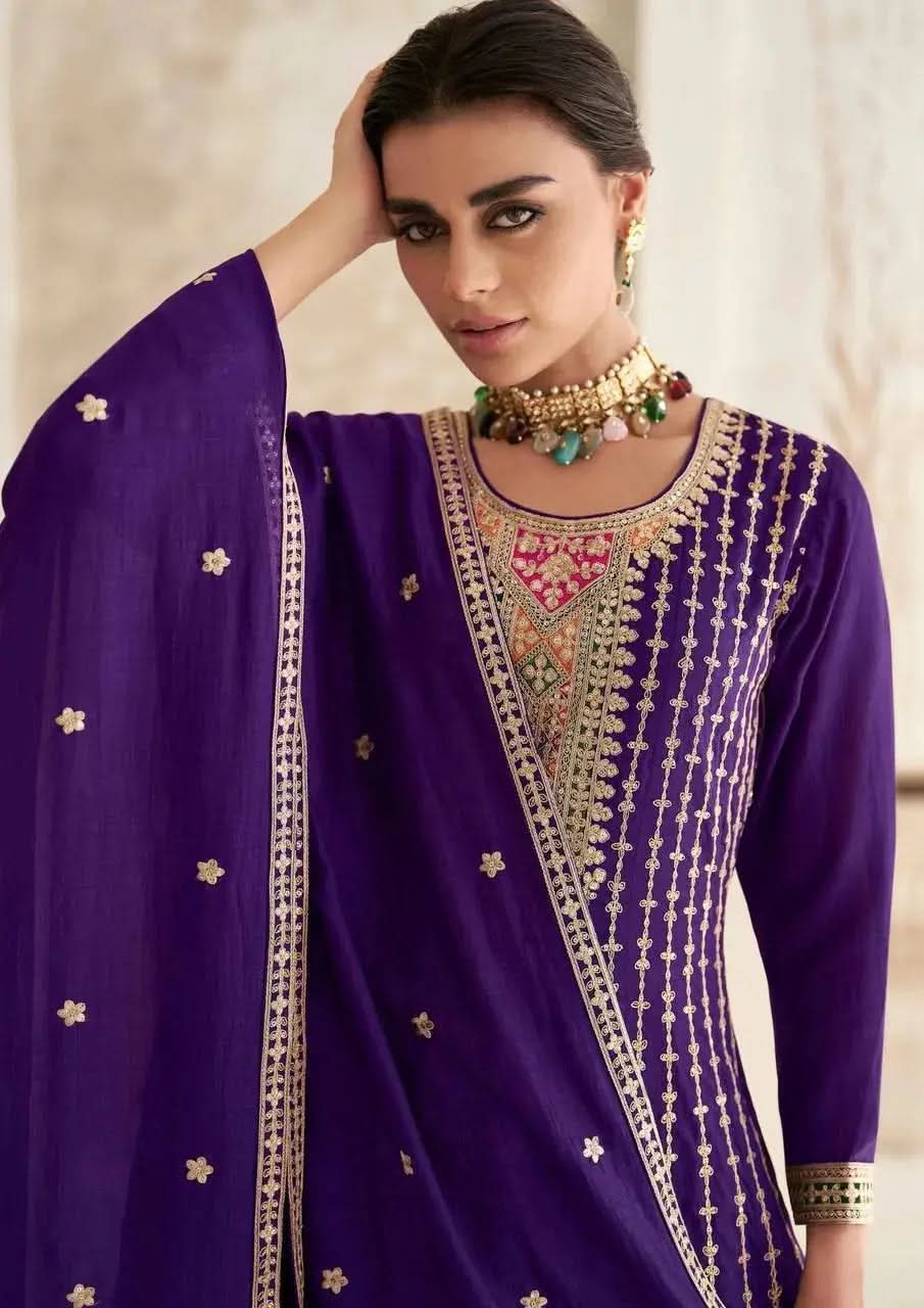 Elevate your wardrobe with the Jubilant Purple Chinon Embroidered Salwar Kameez. Made from high-quality Chinon fabric, this set features intricate embroidery work that adds a touch of elegance. The top, bottom, and dupatta, all made from Chinon, offer a luxurious feel and a comfortable fit. Perfect for any occasion.
