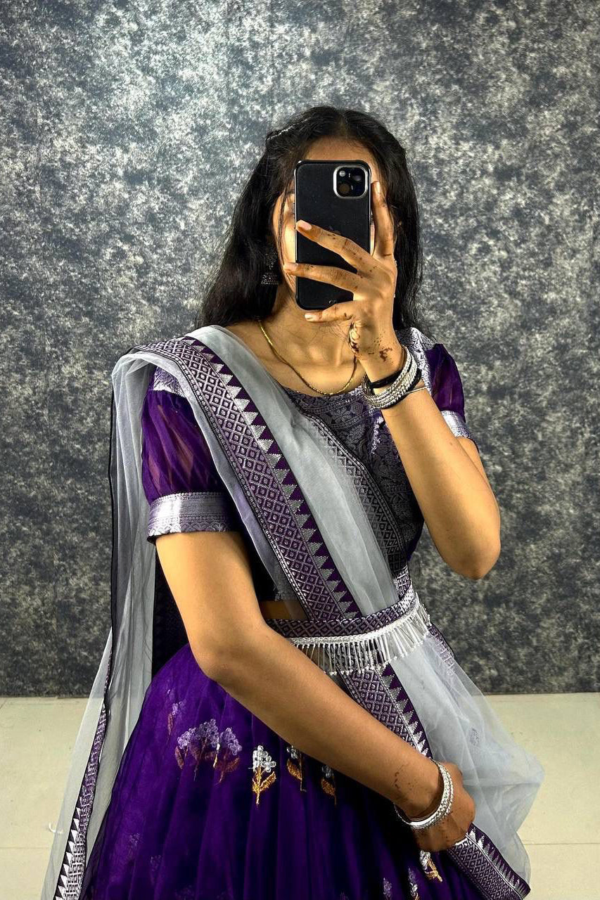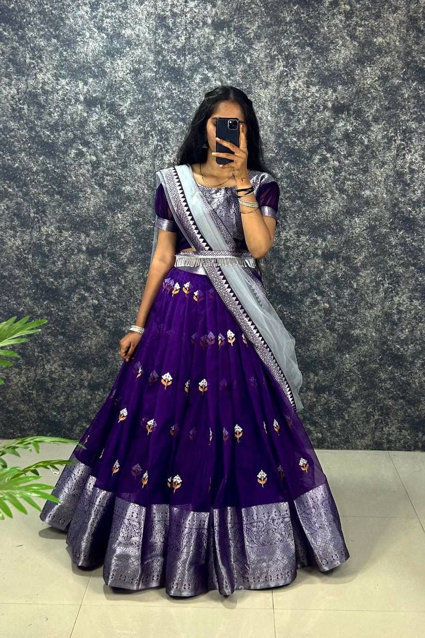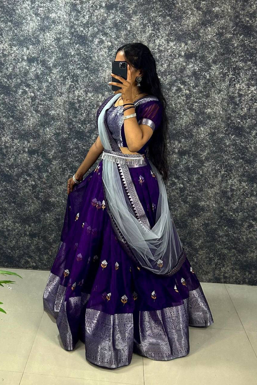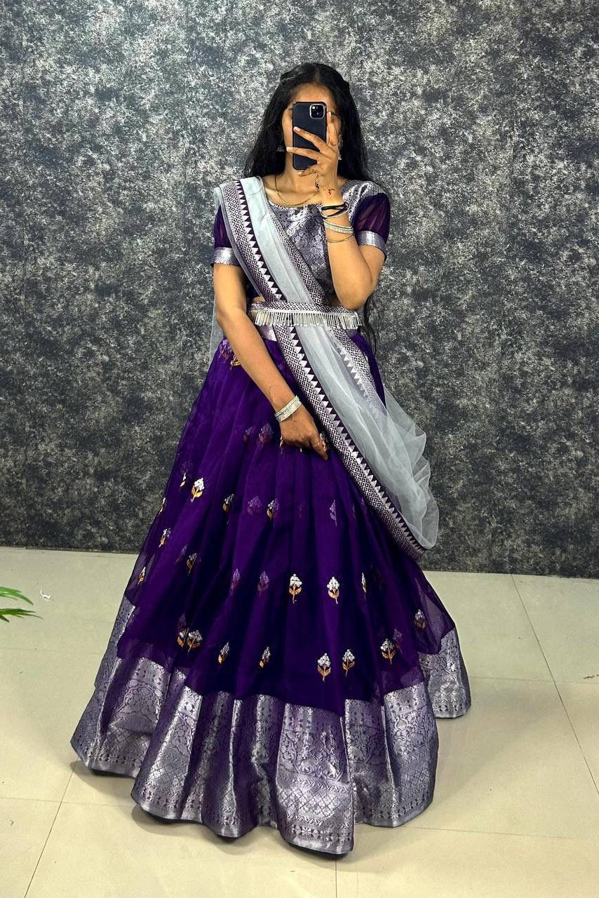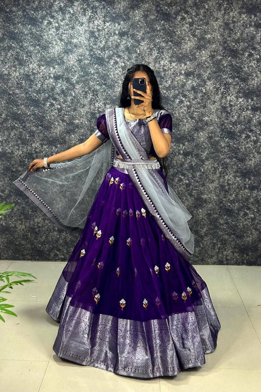 Embrace timeless beauty with the Lavender Radiance Embroidery Organza Lehenga choli, a perfect blend of tradition and modern elegance. This soft organza lehenga features intricate embroidery and weaving zari borders that add a luxurious touch. The matching organza blouse complements the ensemble with its delicate design, while the beautifully bordered Voni enhances its regal charm. Complete with a sparkling belt, this outfit is designed to make you shine at any celebration. Step into sophistication and grace with this stunning lavender purple lehenga set, ideal for creating unforgettable memories