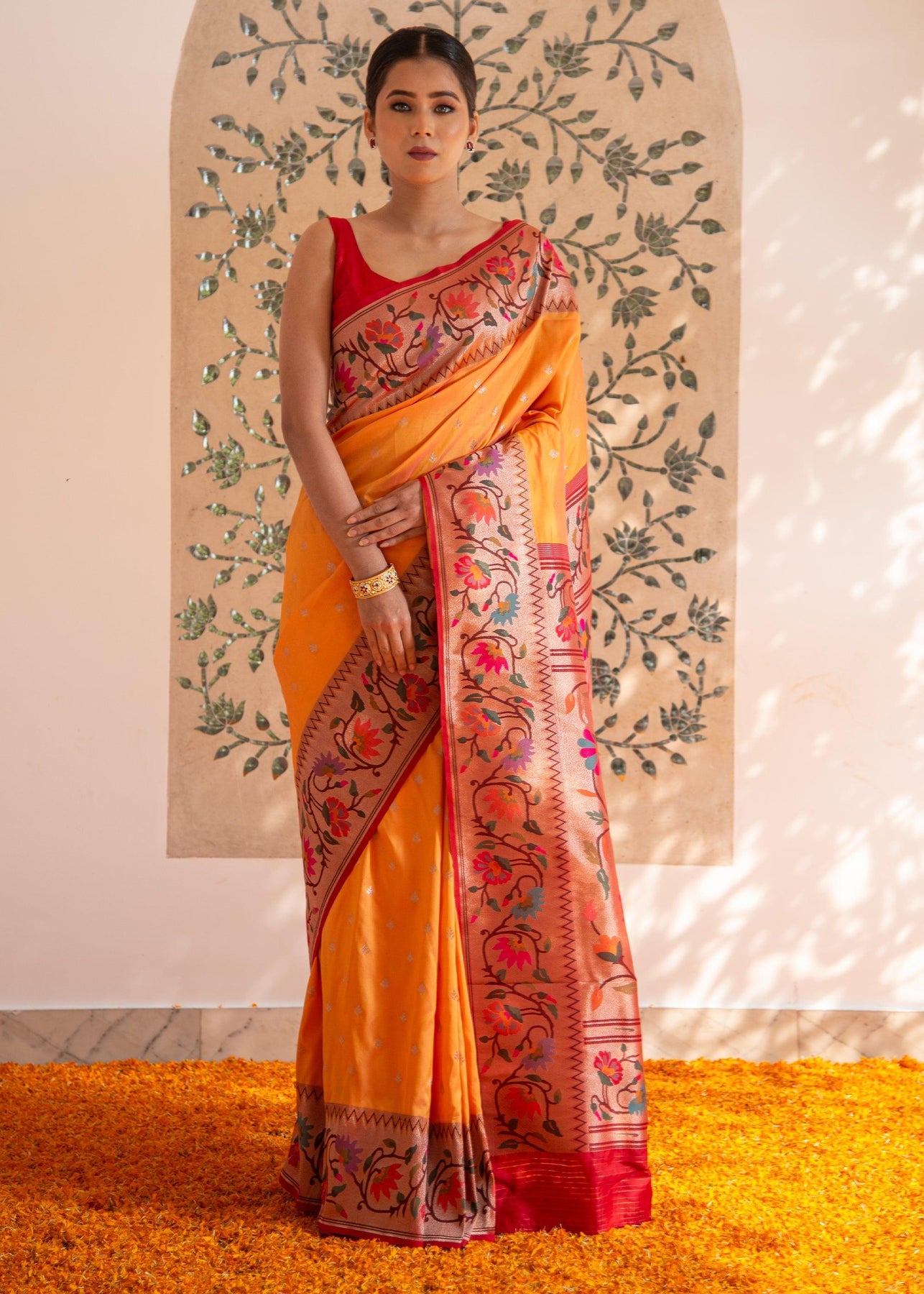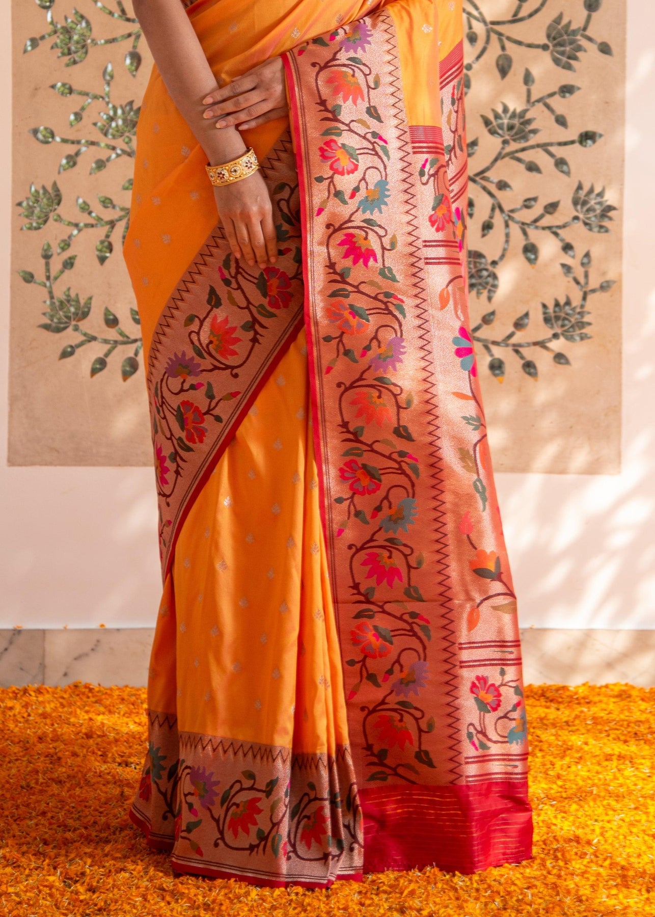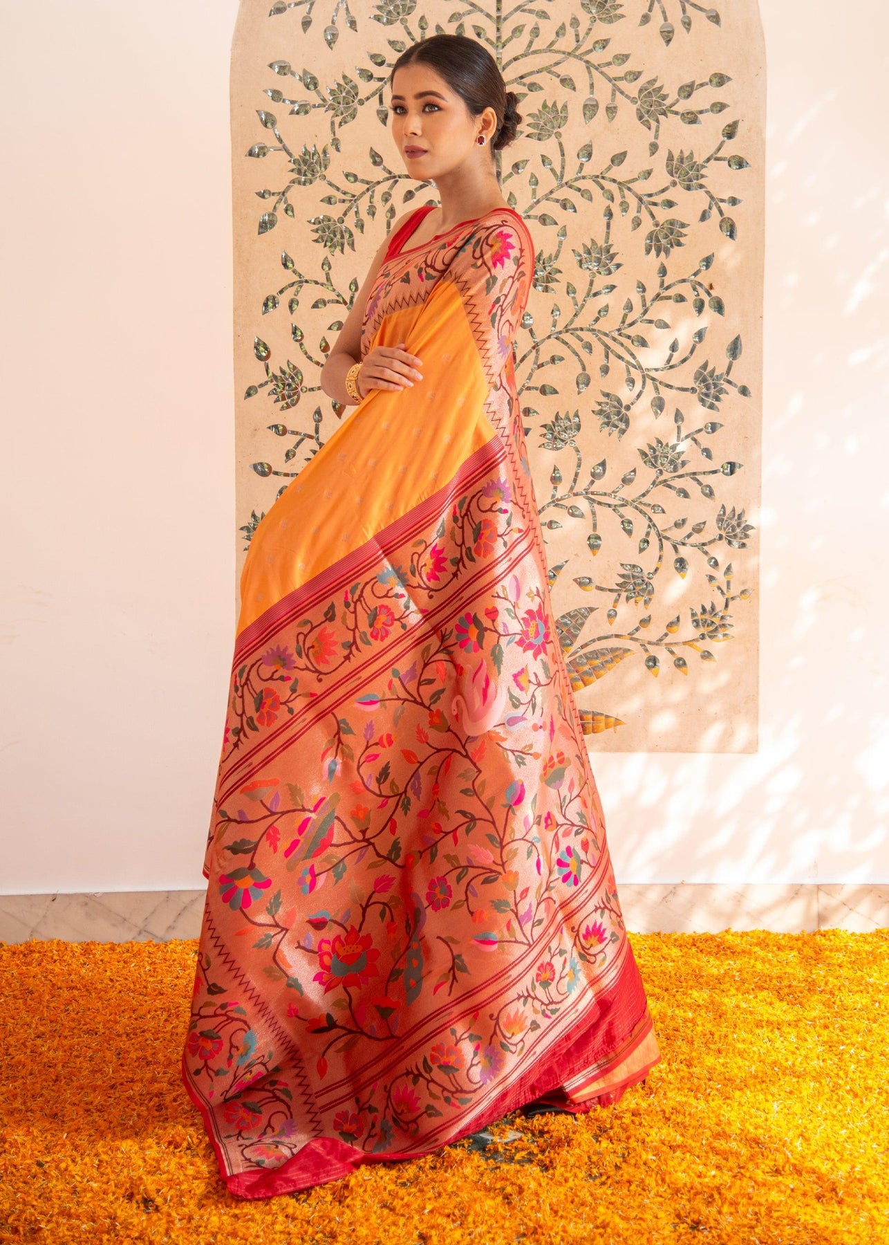 Morbagh: Orange Paithani Saree with Classic Shikargah Border