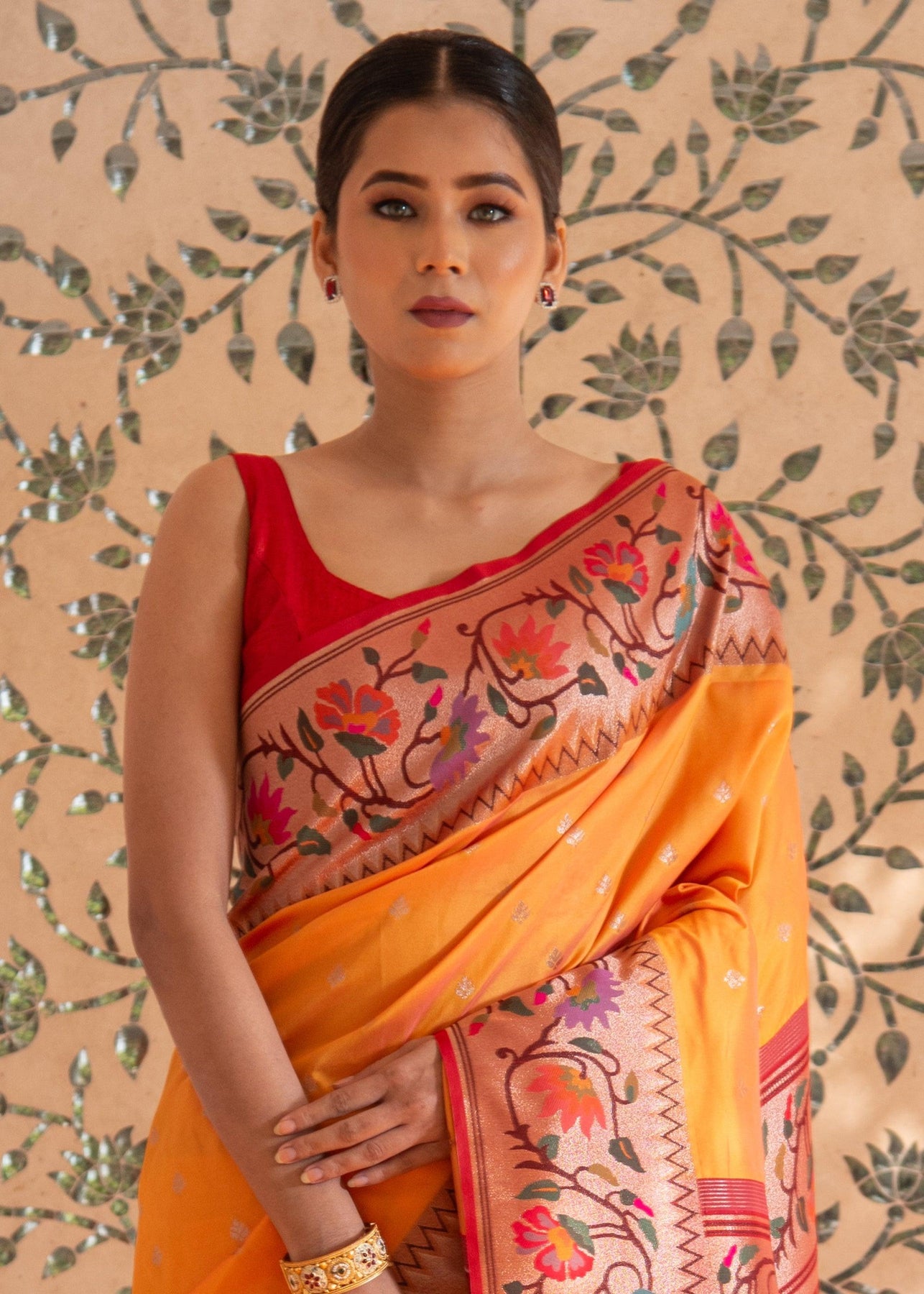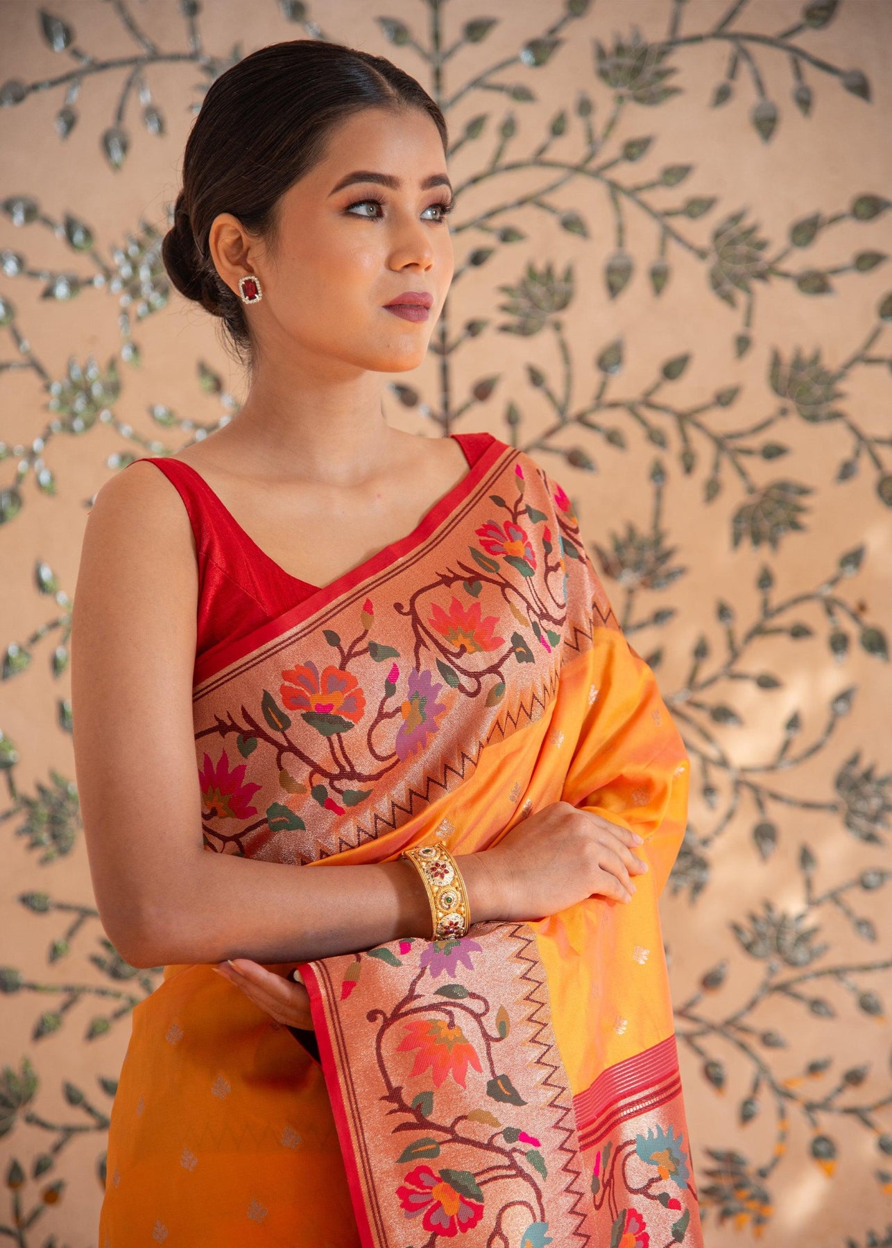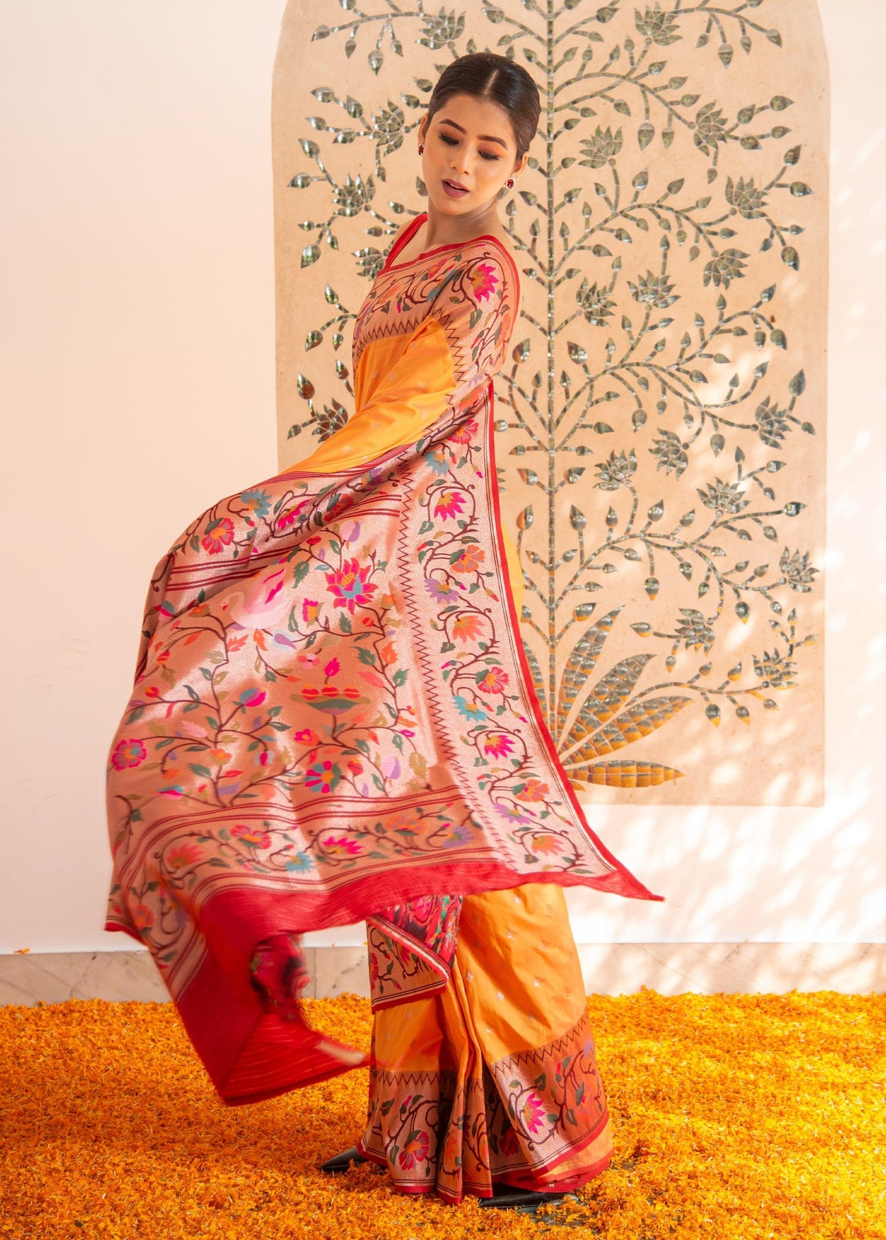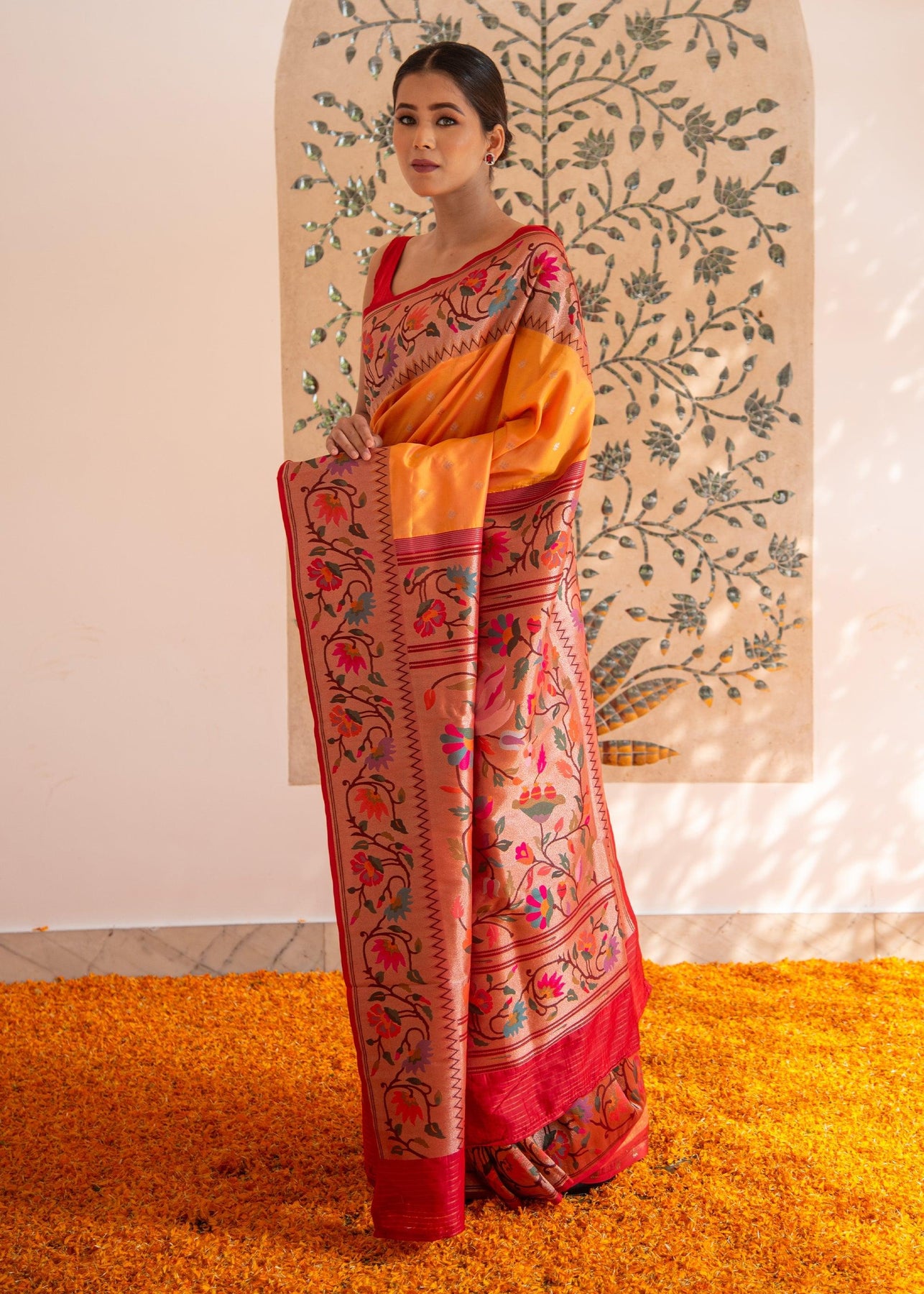 Morbagh: Orange Paithani Saree with Classic Shikargah Border