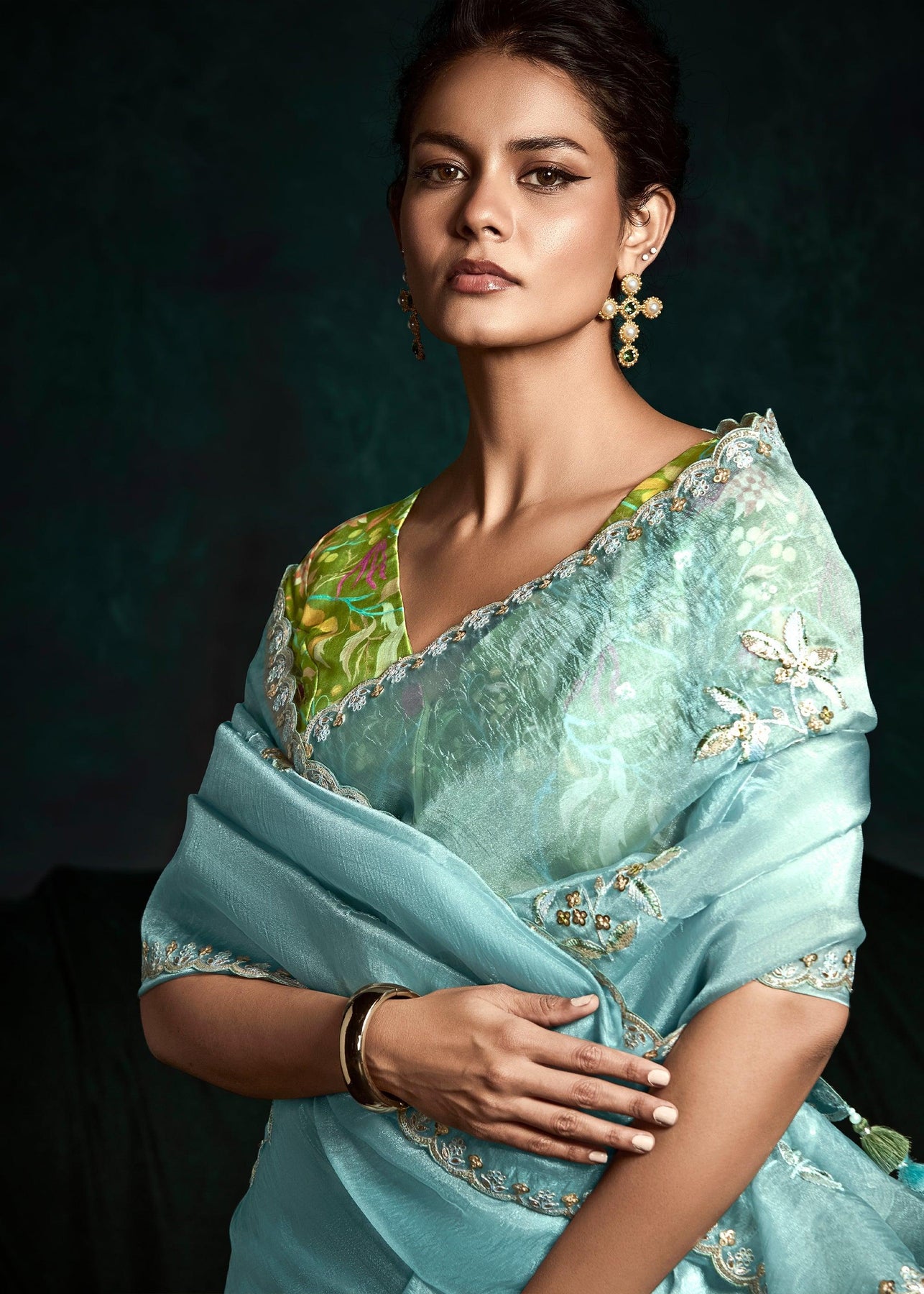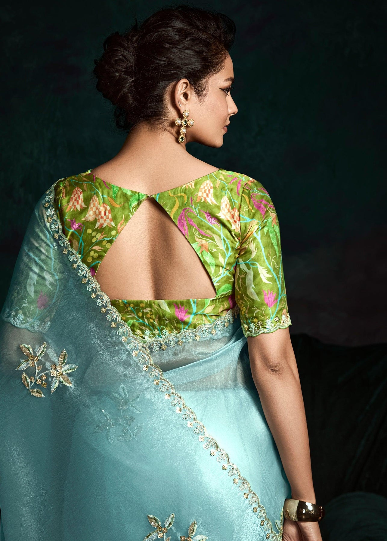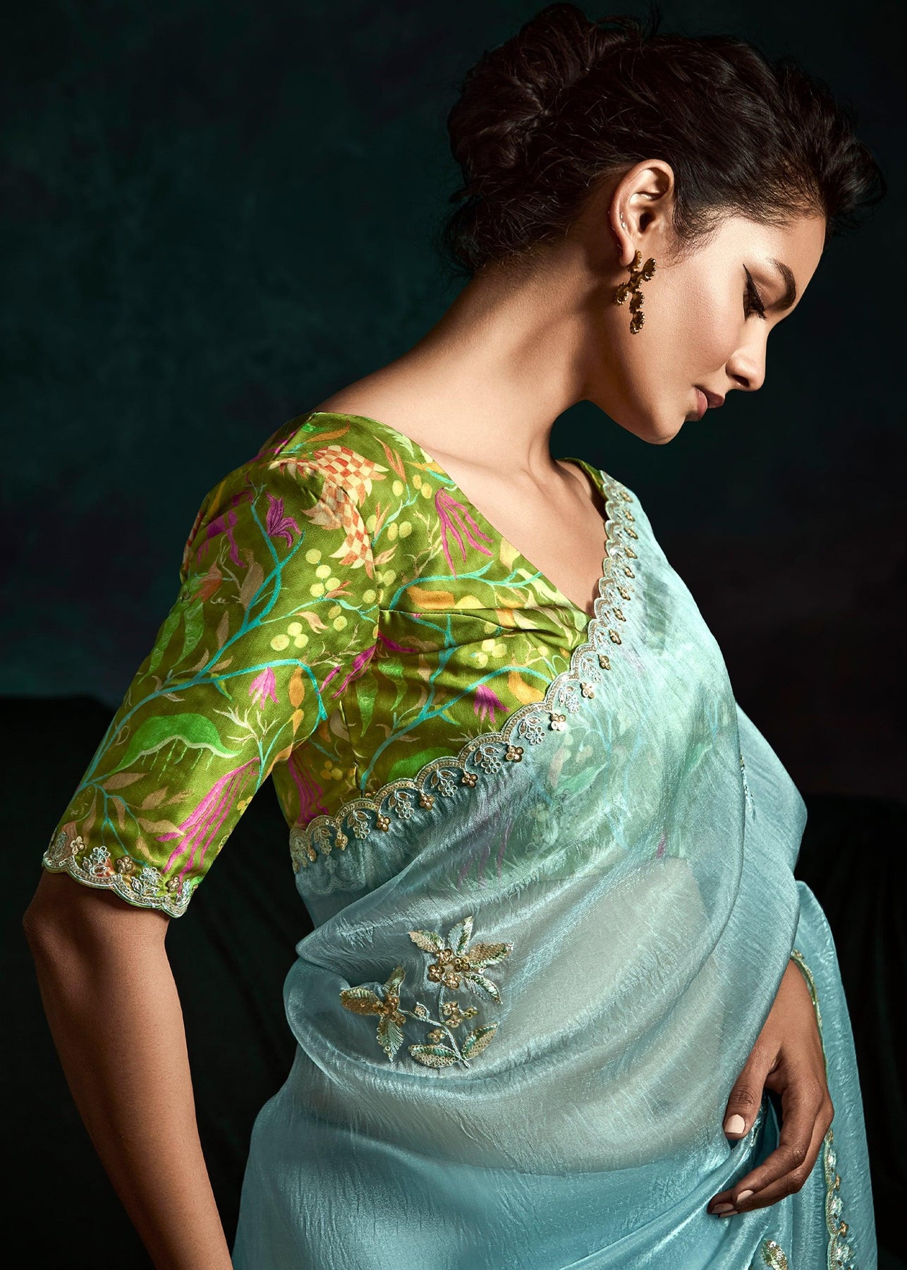 Norse Blue Designer Tissue Silk Saree With Printed Blouse