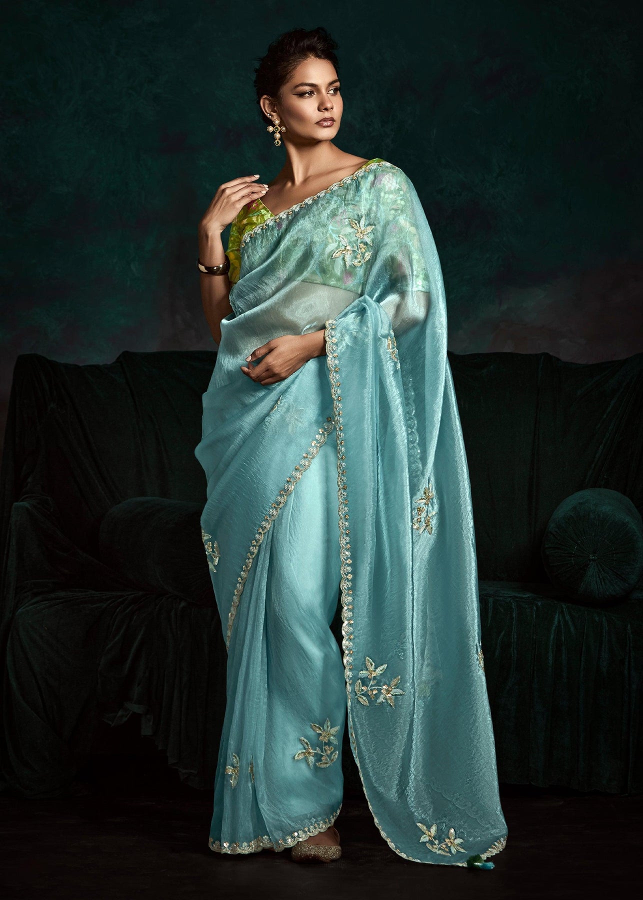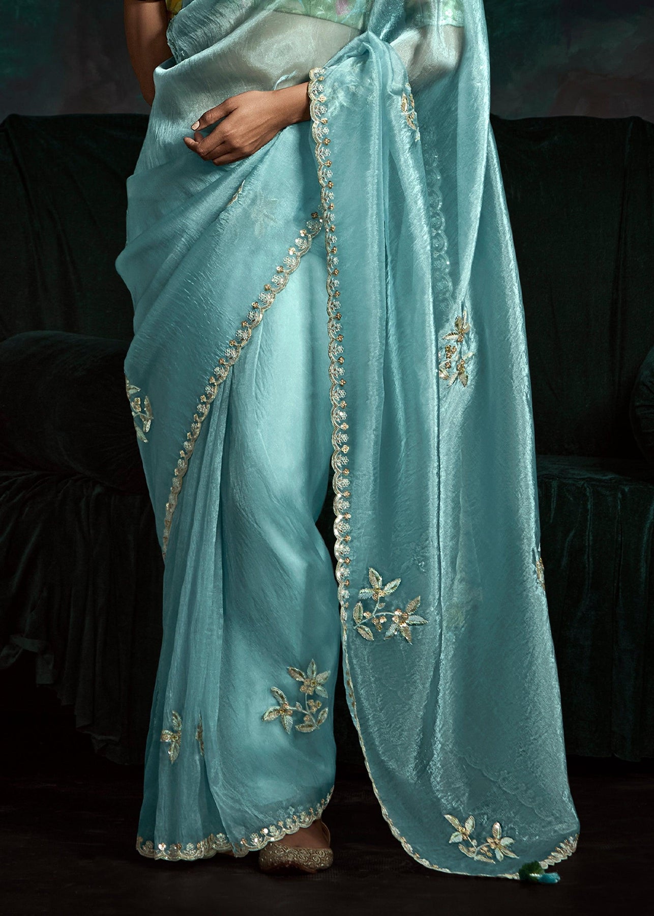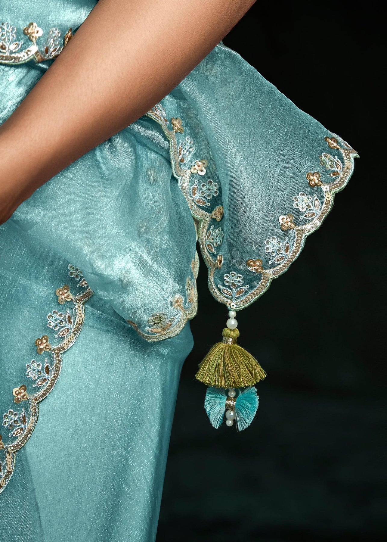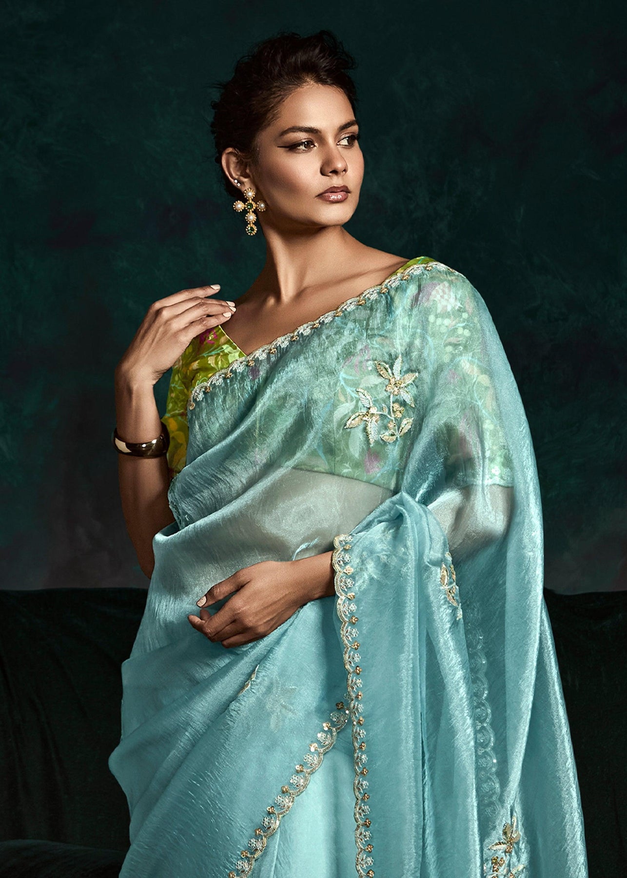 Norse Blue Designer Tissue Silk Saree With Printed Blouse