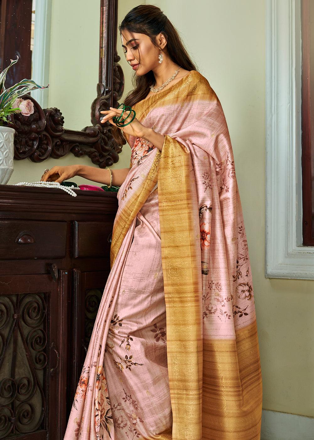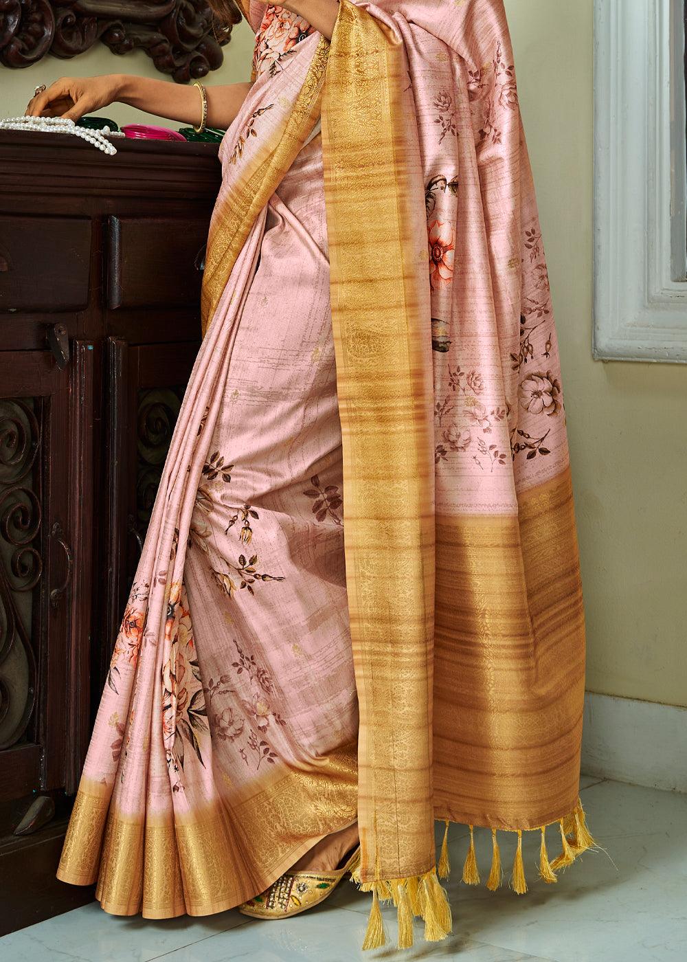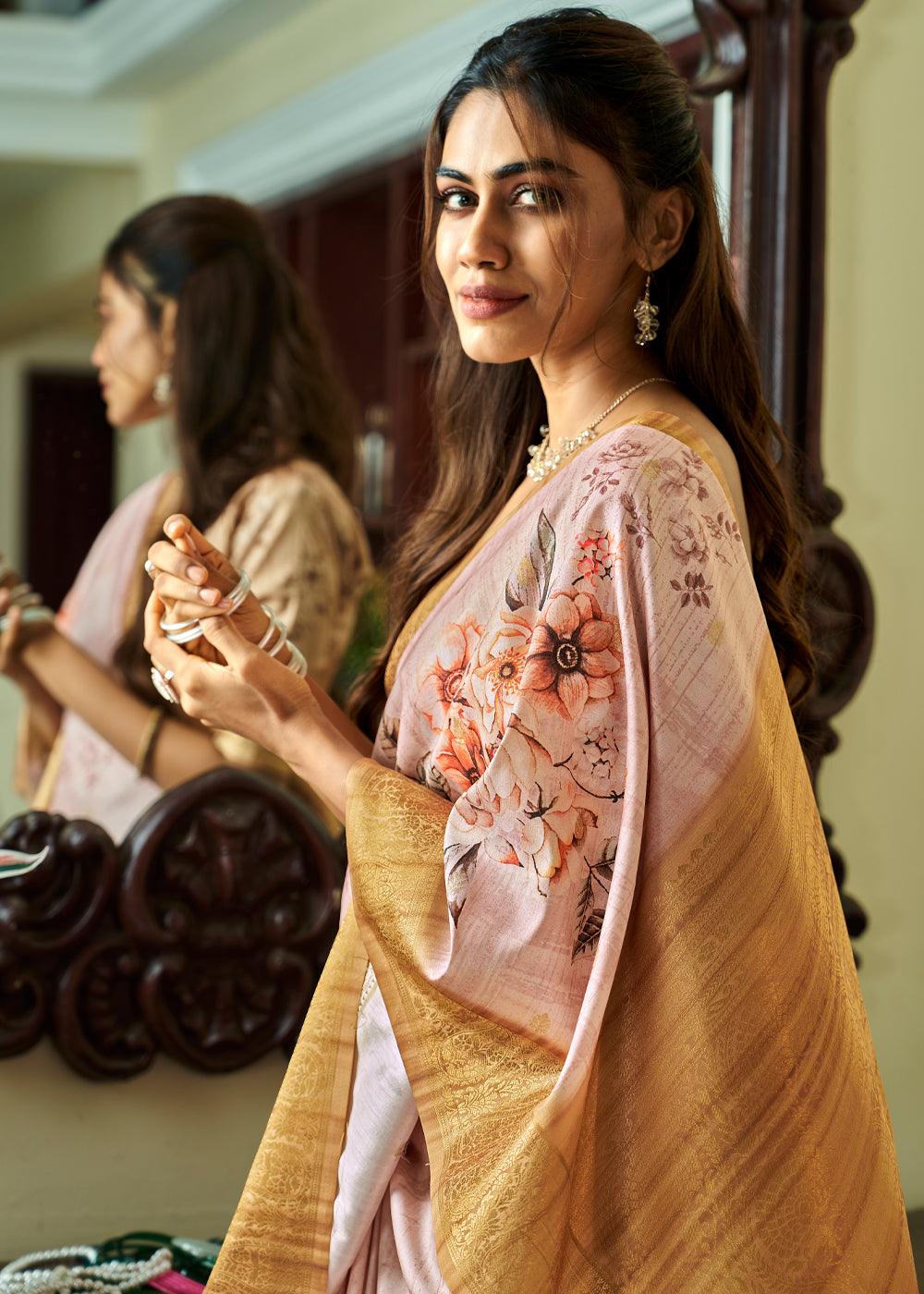 Pastel Pink Woven Banarasi Soft Silk Saree With Digital Print
