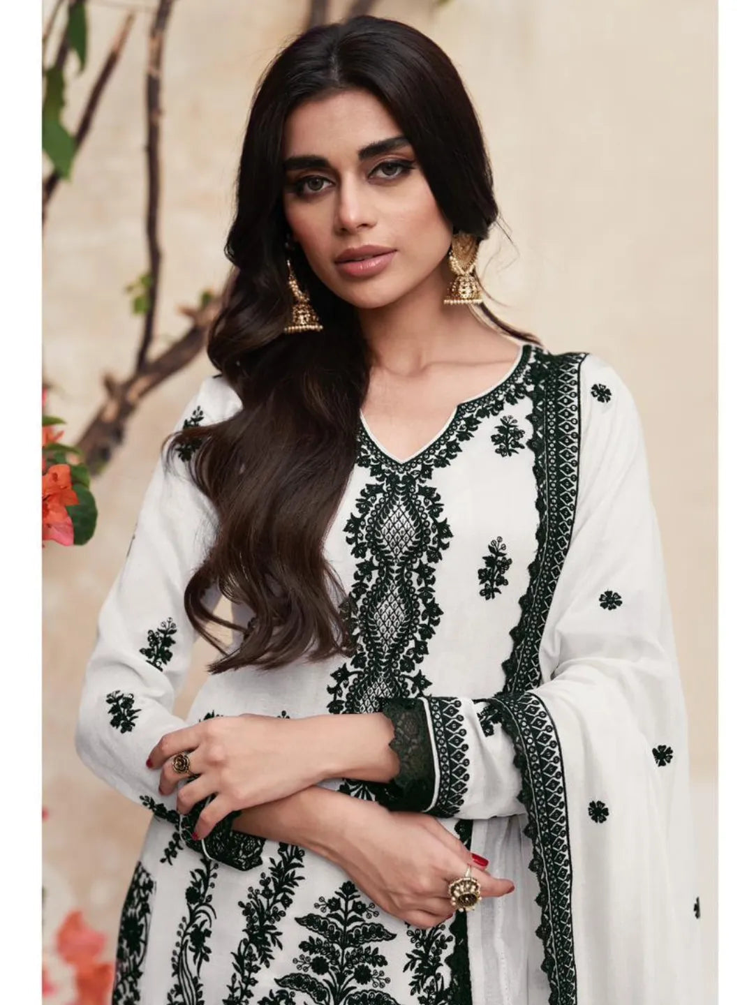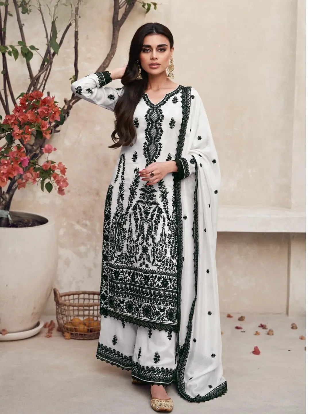 This Peaceable White Premium Silk Thread Worked Palazzo Suit features premium silk fabric and intricately detailed thread work. The luxurious fabric and intricate design offer a timeless and elegant look for any occasion. Elevate your style with this high-quality palazzo suit.