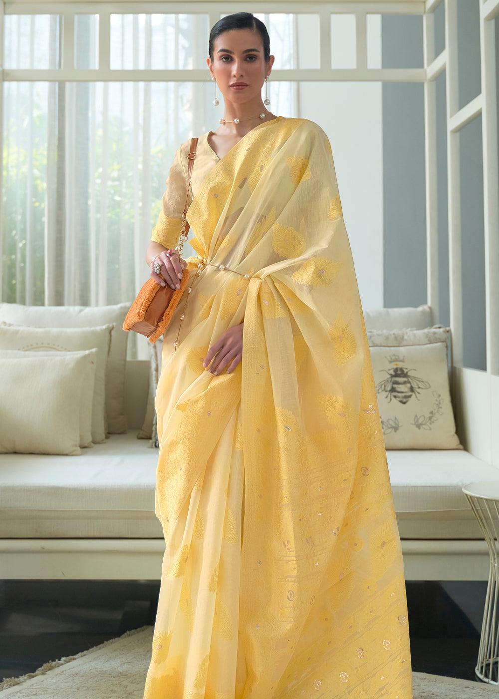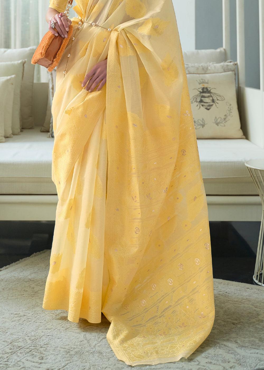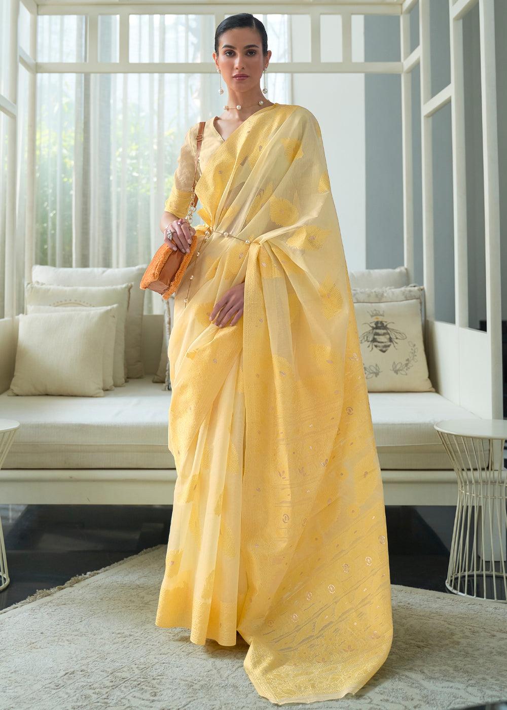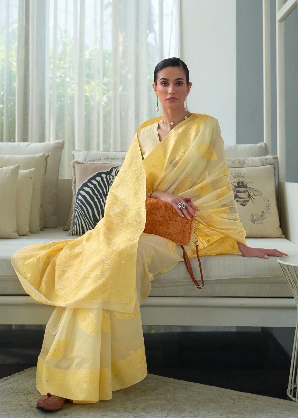 Pearl Yellow Lucknowi Chikankari Woven Silk Saree